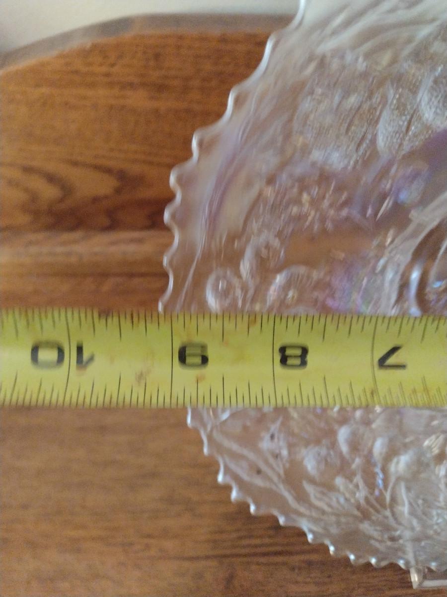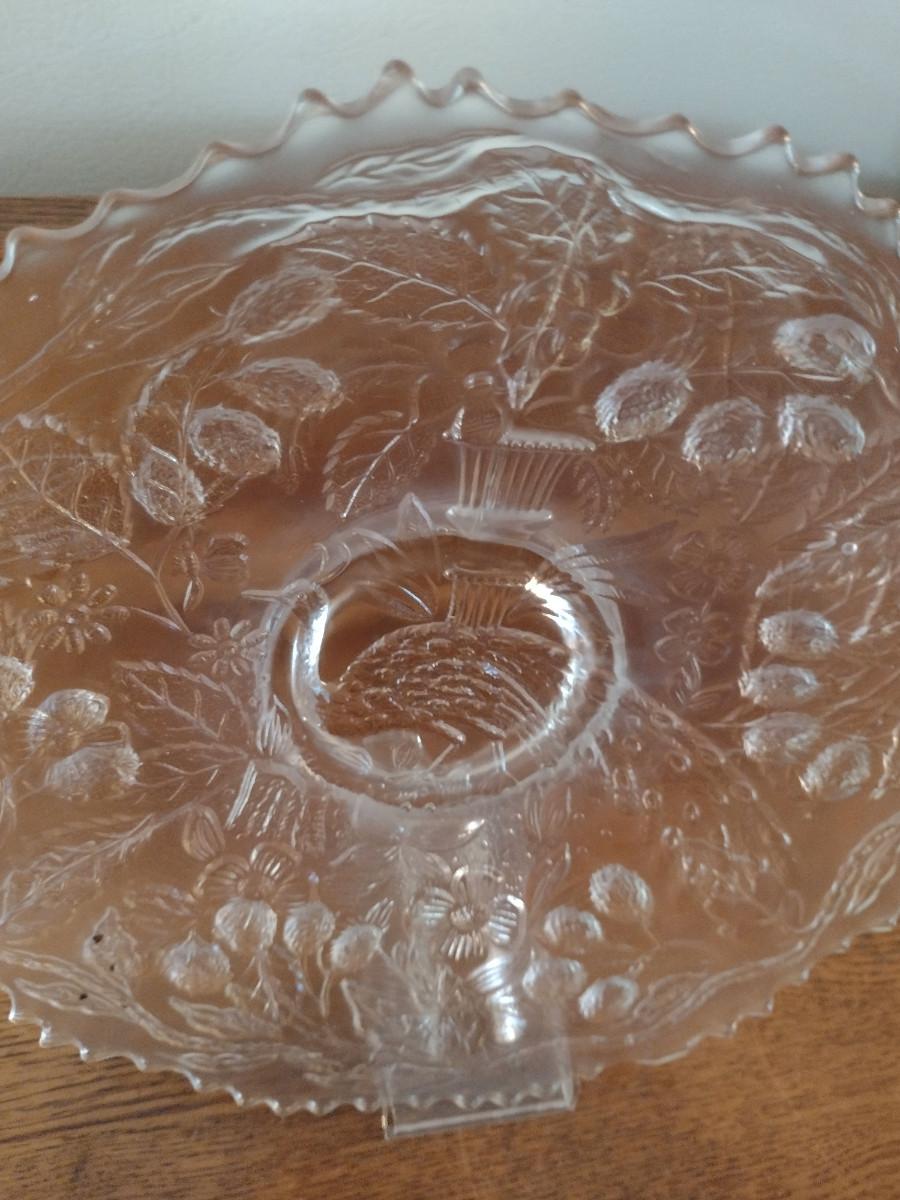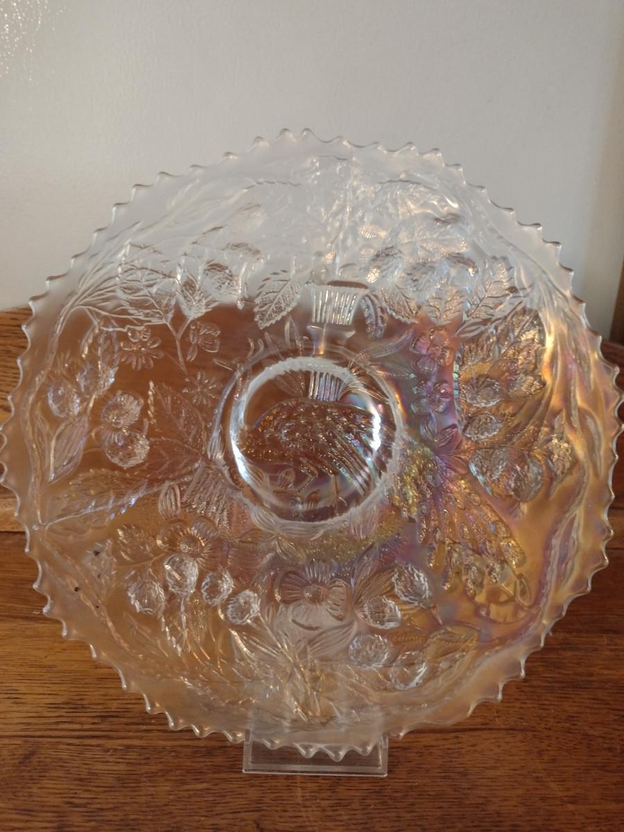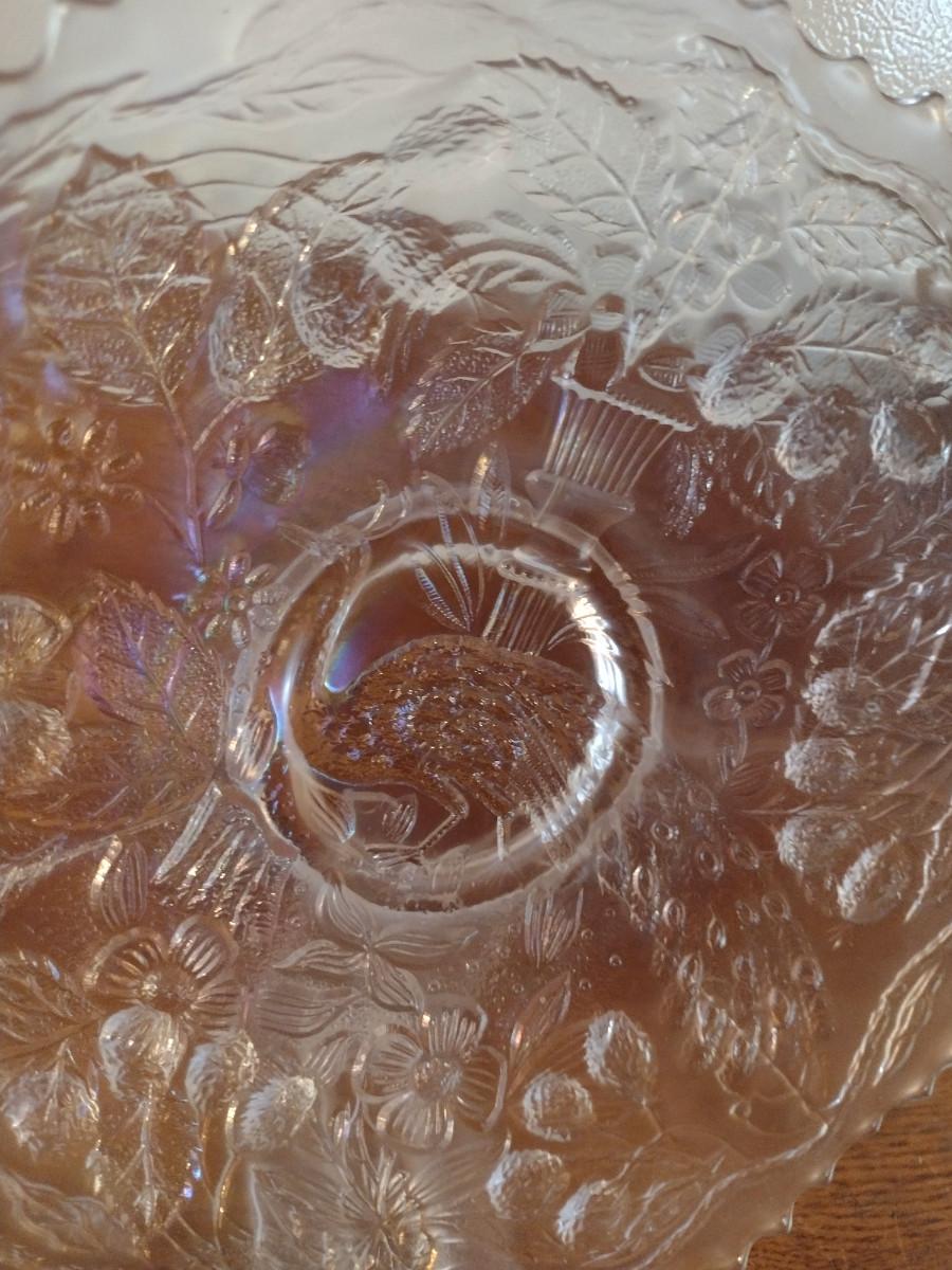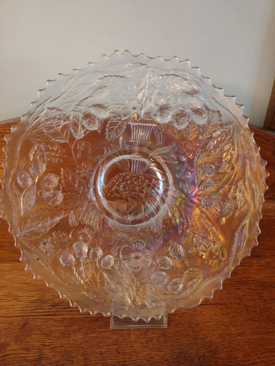 White Irridescent Glass Plate with Peacock and Urn Design- Possibly Fenton- Approx 9" in Diameter