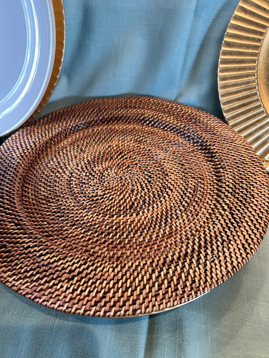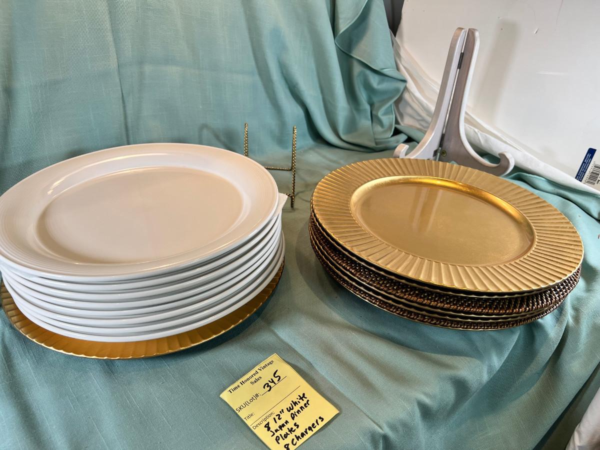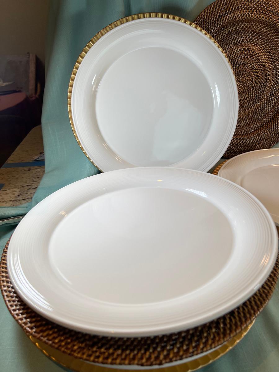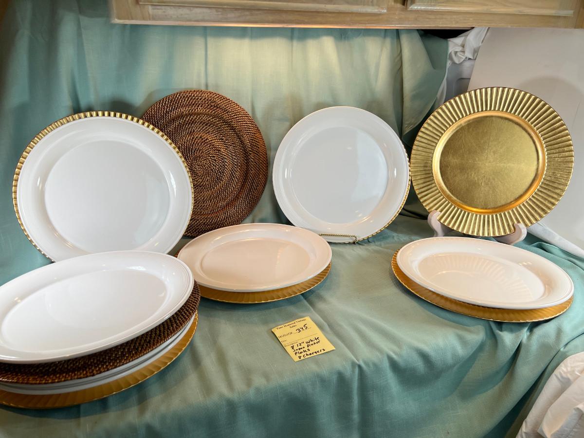 8 12" White Japanese Dinner Plates and 6 gold Lenox Chargers handmade japan, 2 basketry chargers.