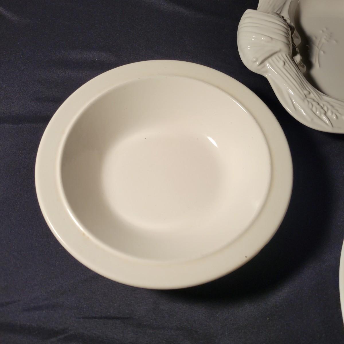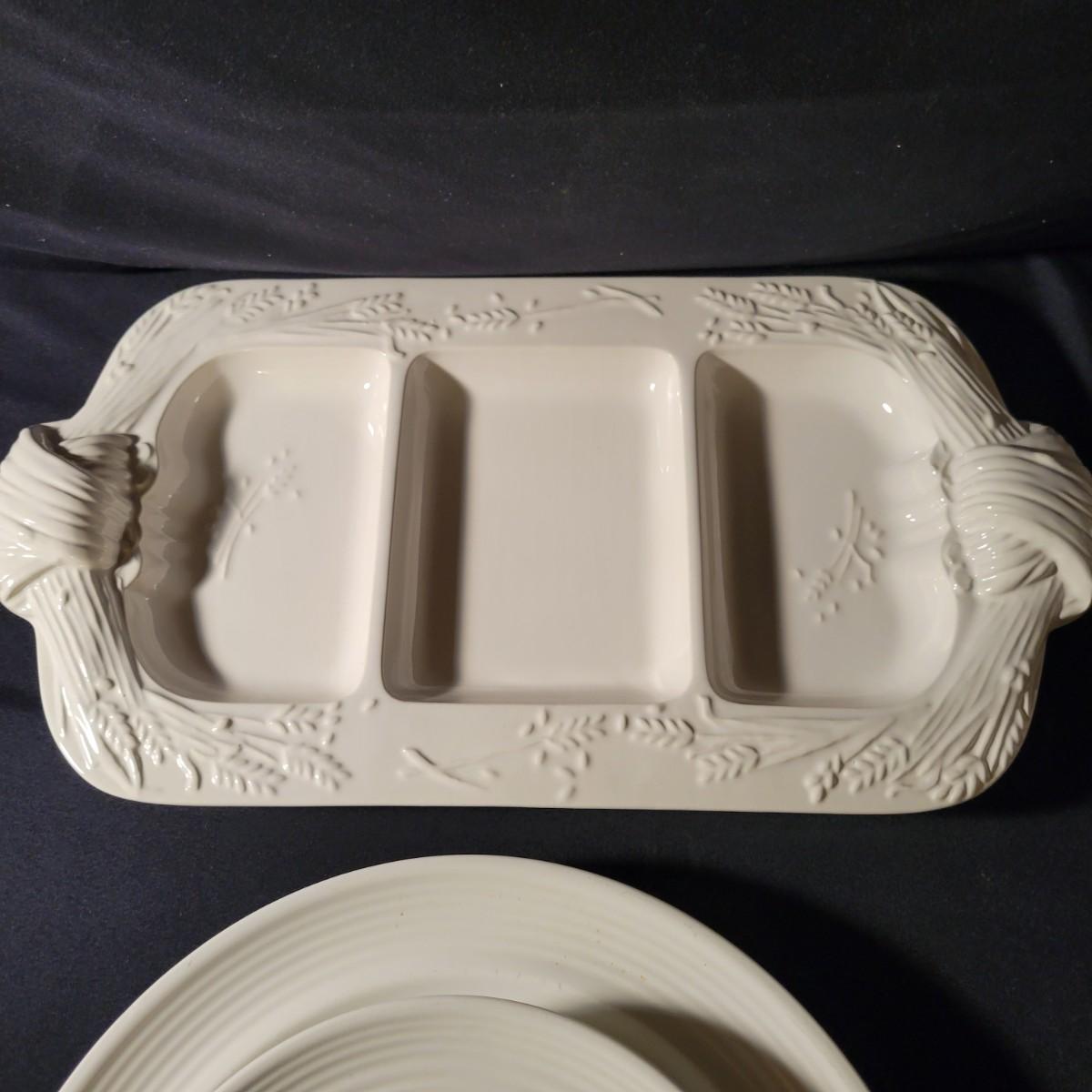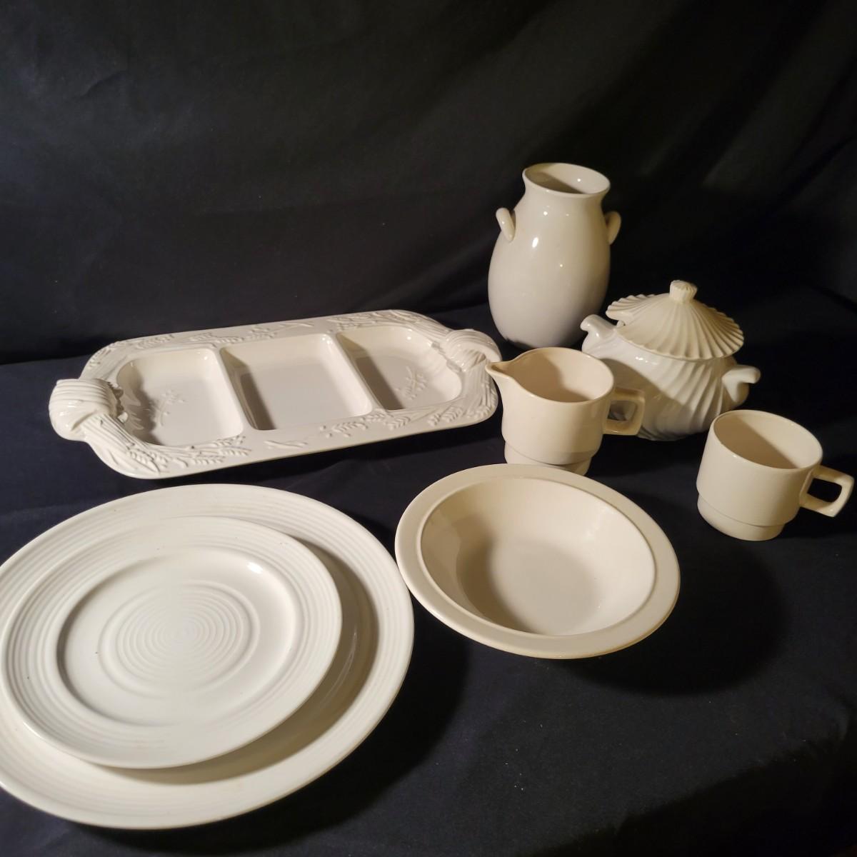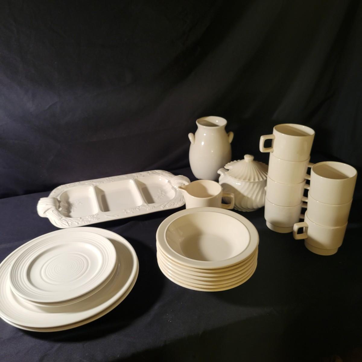 An assortment of white kitchen ceramics in good condition, but there are a 3 bowls with chips. Included is 7 bowls, 7 coffee cups, 1 salad plates, 2 dinner plates, 1 sugar bowl, a vase , a creamer and a decorative 3 compartment platter. Platter measures 17" x 8.5" x 1" Shipping available.