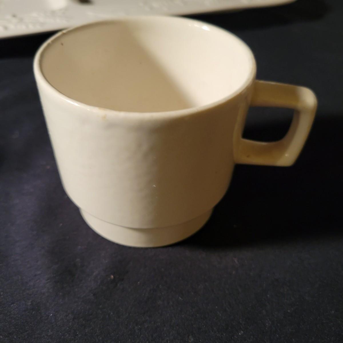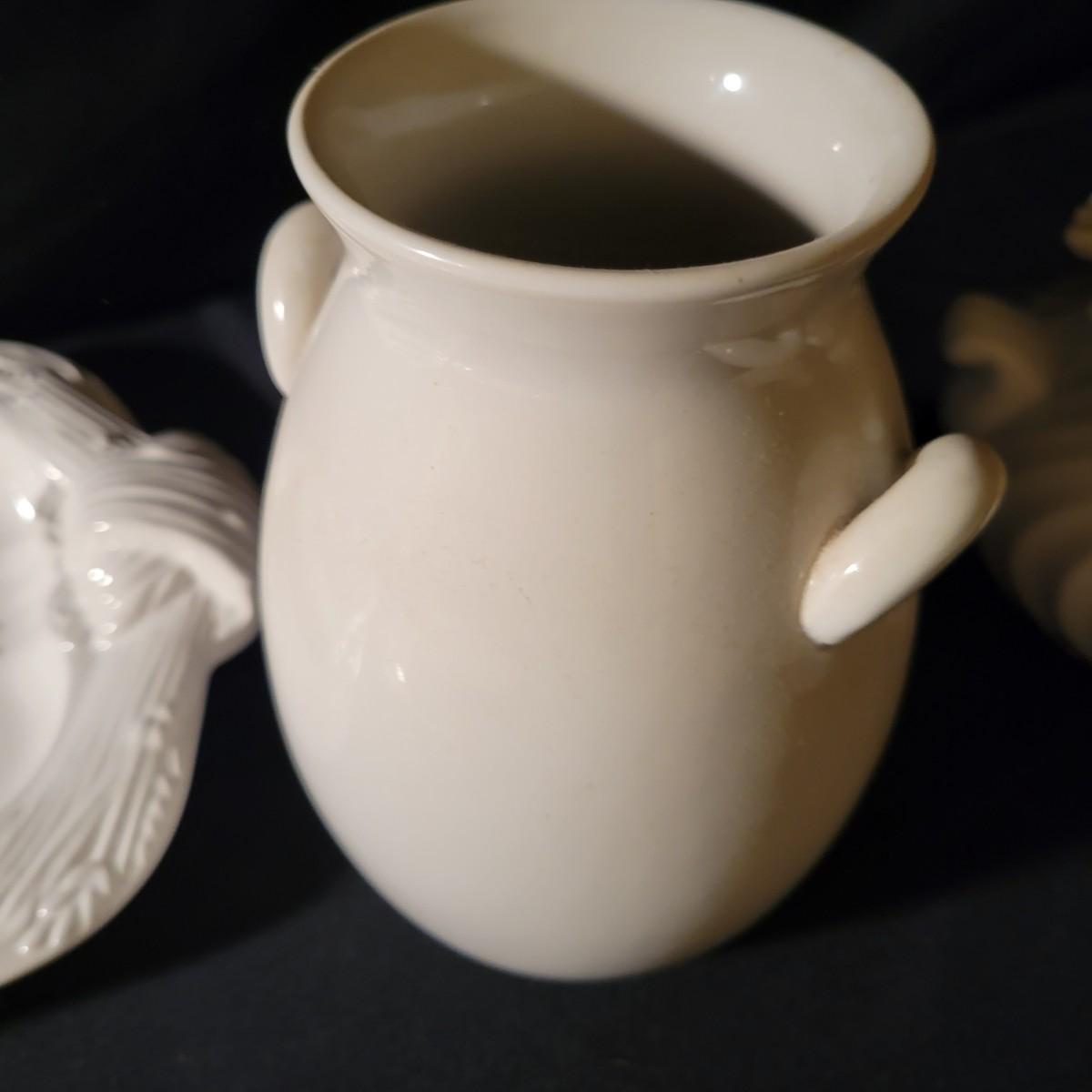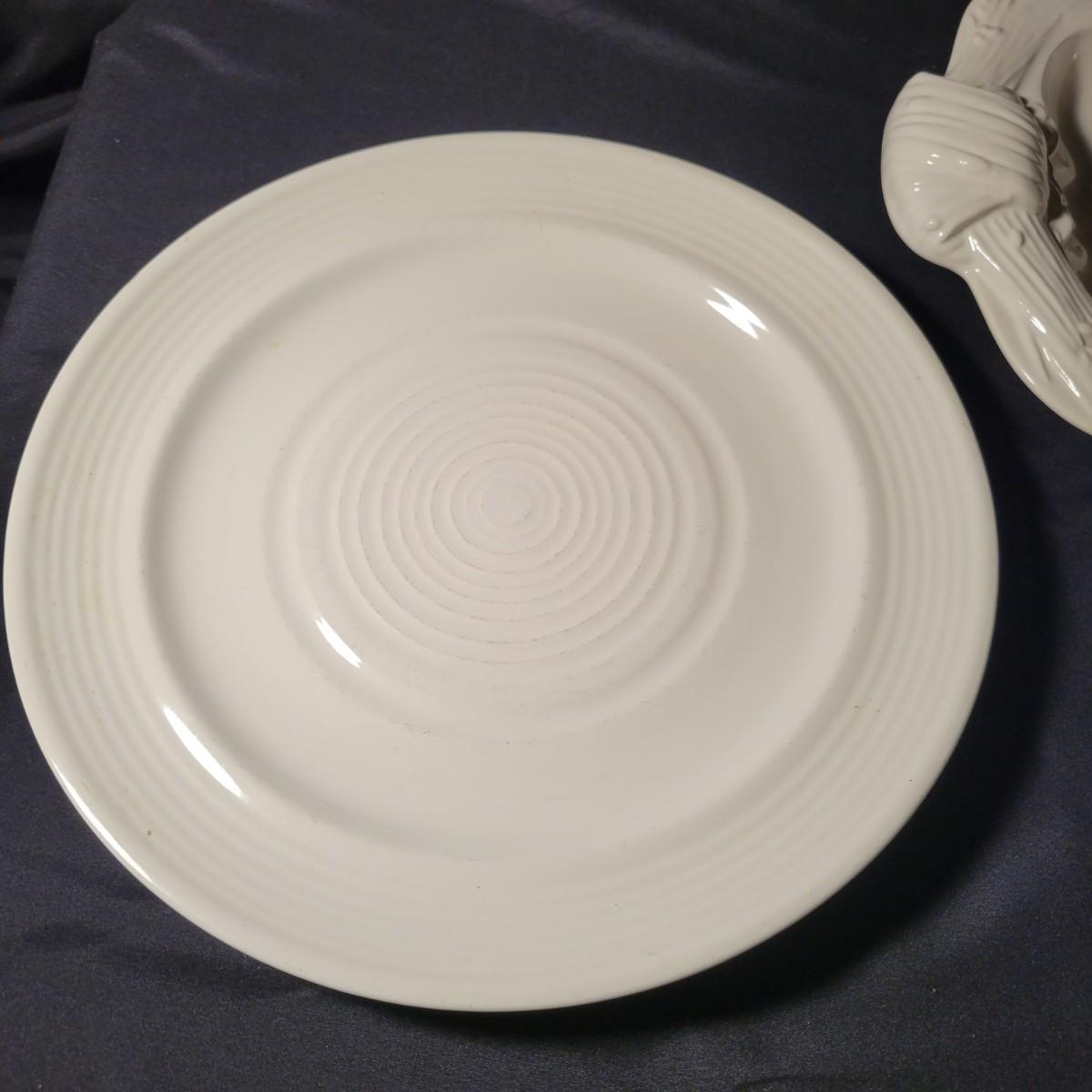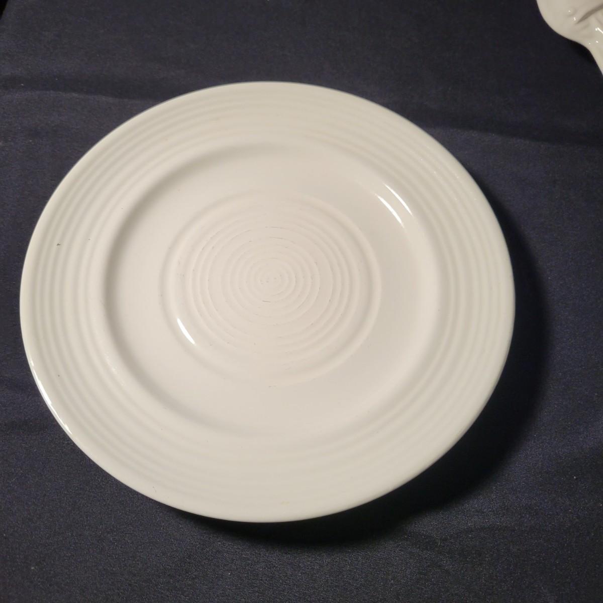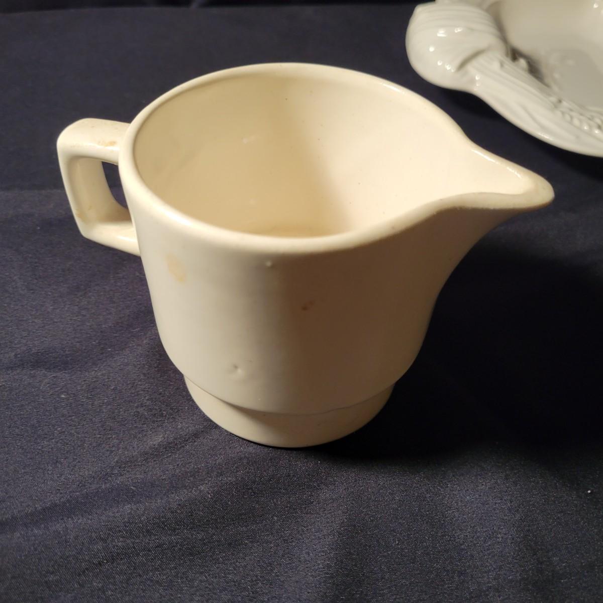 An assortment of white kitchen ceramics in good condition, but there are a 3 bowls with chips. Included is 7 bowls, 7 coffee cups, 1 salad plates, 2 dinner plates, 1 sugar bowl, a vase , a creamer and a decorative 3 compartment platter. Platter measures 17" x 8.5" x 1" Shipping available.