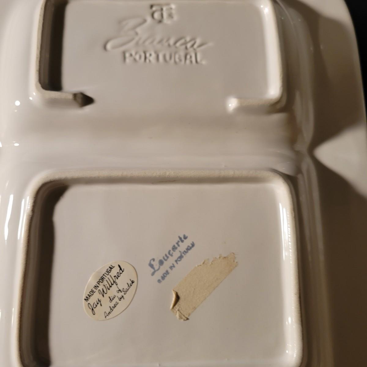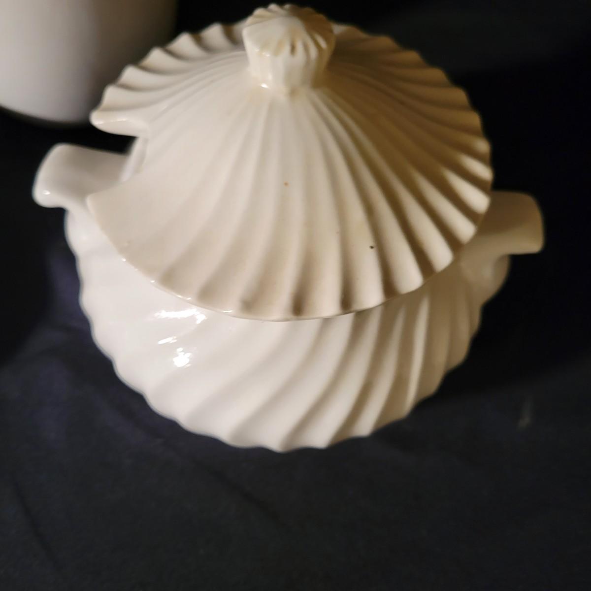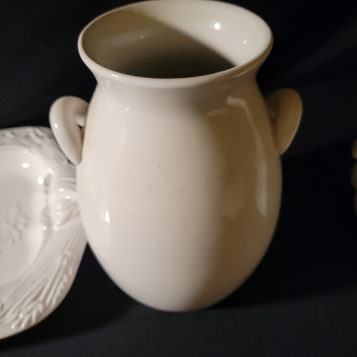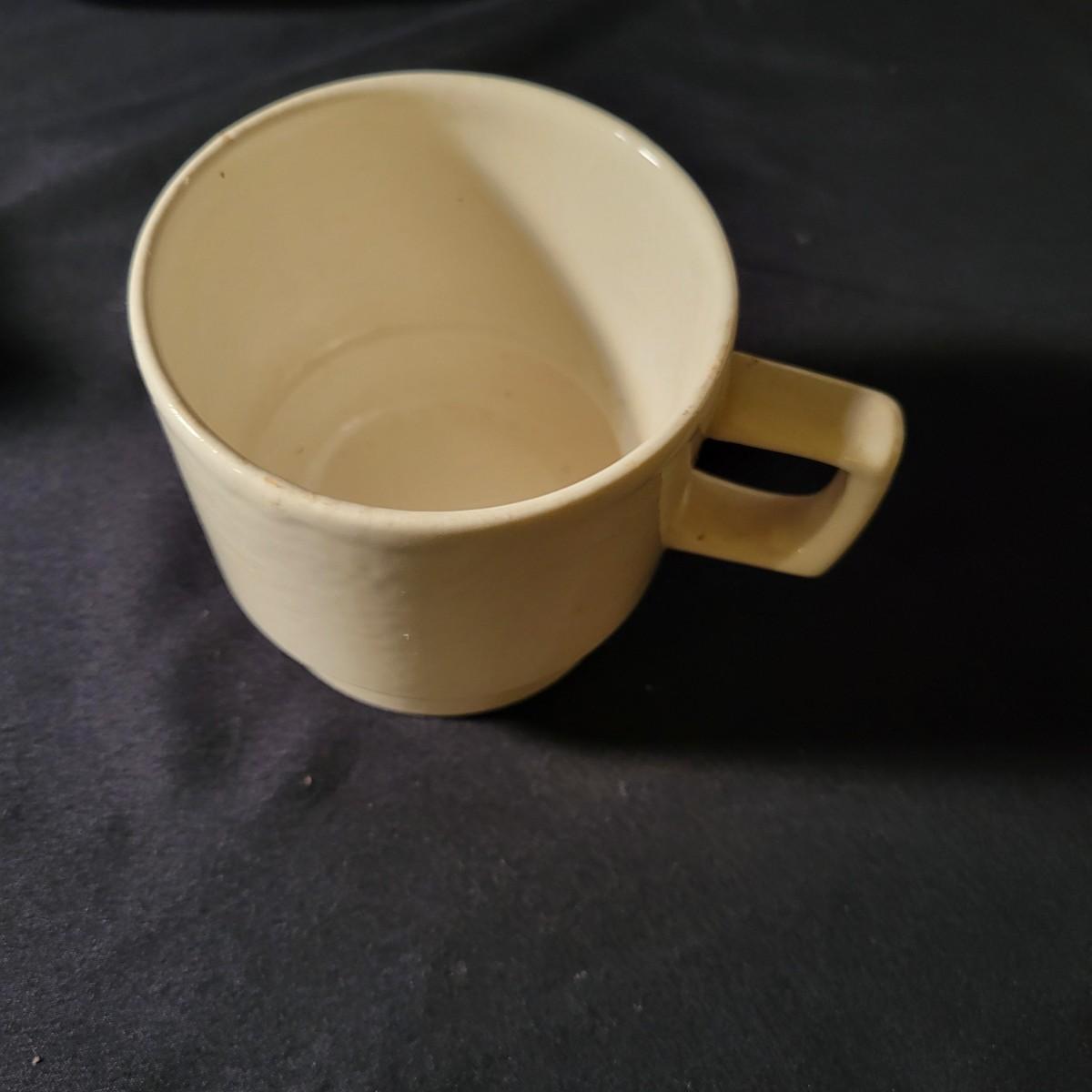 An assortment of white kitchen ceramics in good condition, but there are a 3 bowls with chips. Included is 7 bowls, 7 coffee cups, 1 salad plates, 2 dinner plates, 1 sugar bowl, a vase , a creamer and a decorative 3 compartment platter. Platter measures 17" x 8.5" x 1" Shipping available.
