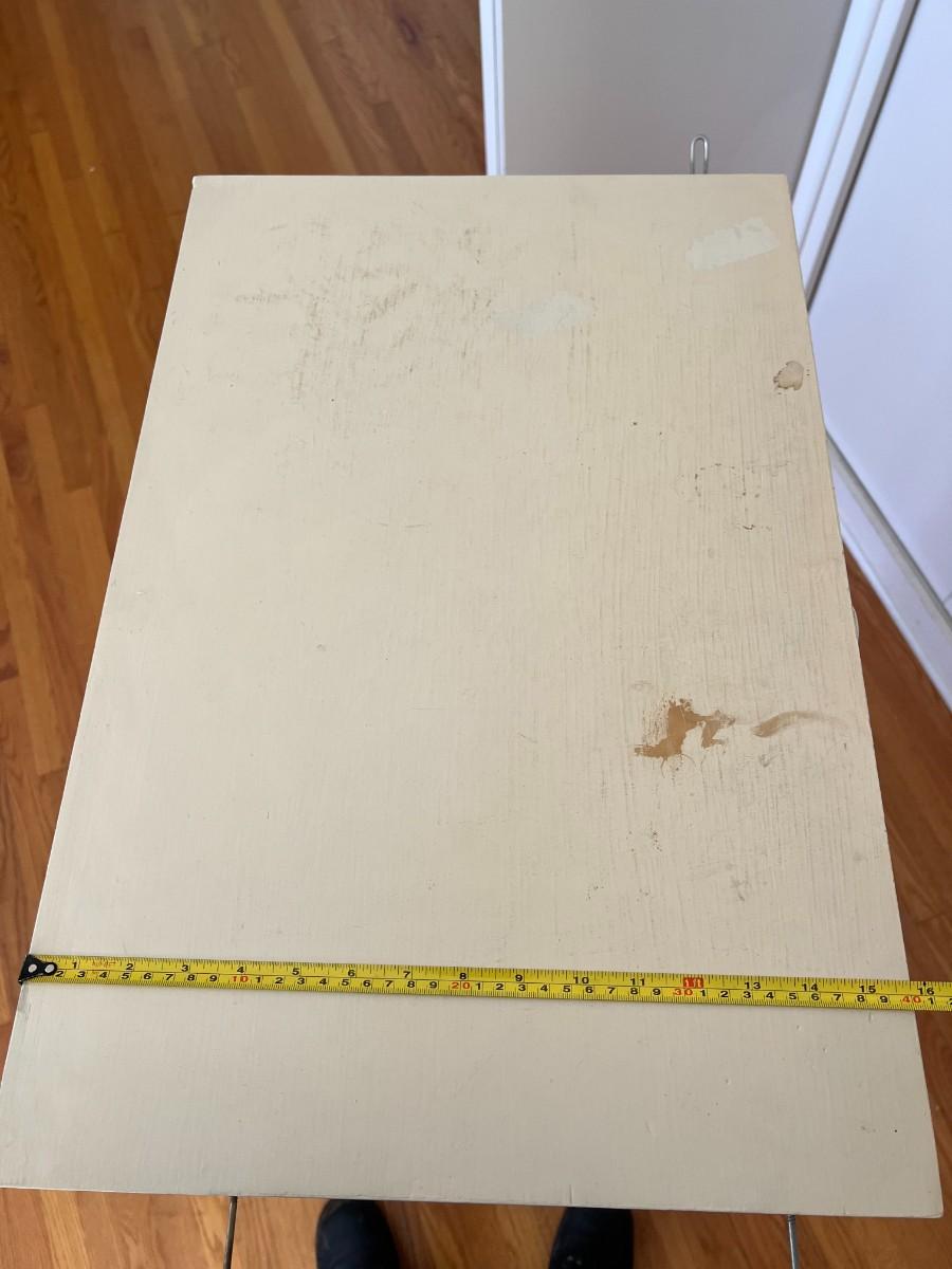 White Laminate Skinny Tall Dresser. In used condition. 4 drawers with a cabinet bottom spot. No back. Hooks have been screwed into the side for hanging items.