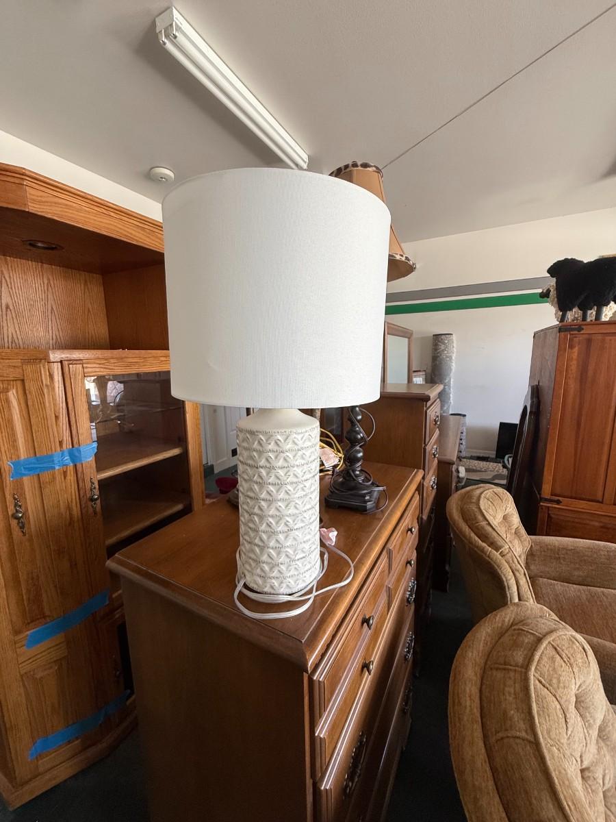 A classic white lamp that adds a clean and bright touch to any room, perfect for accenting your decor.