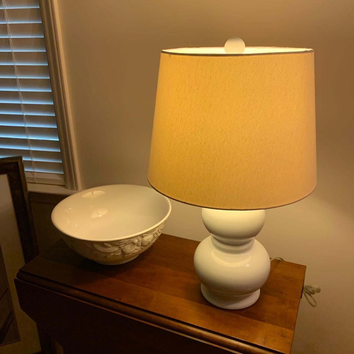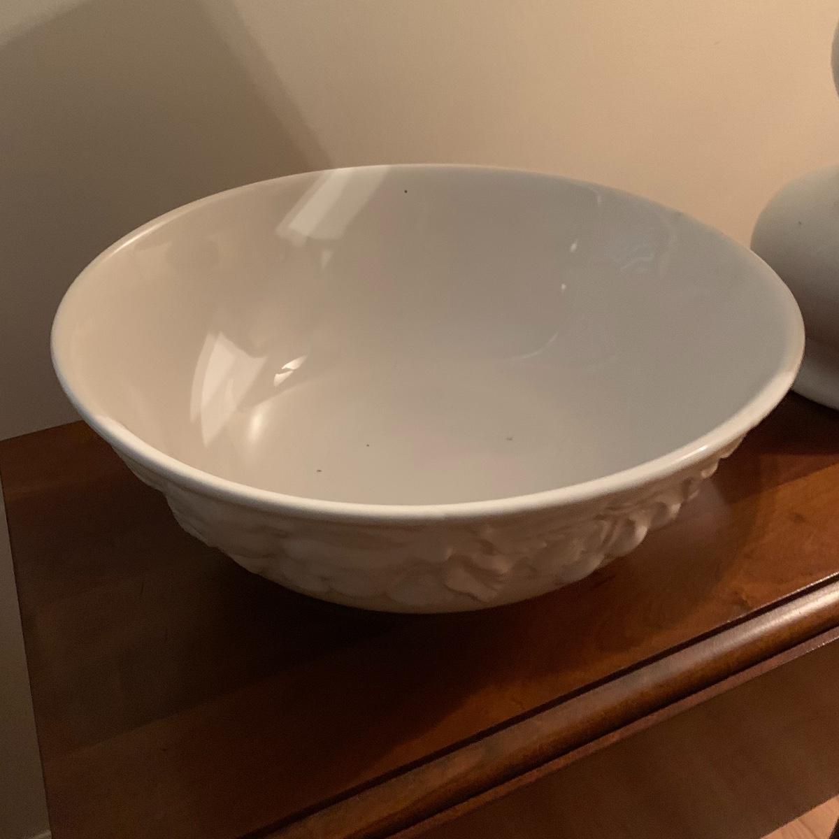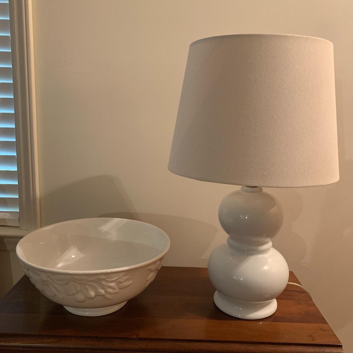 Large white ceramic lamp with round shade and three way switch stands 23” with a 11” diameter shade. The Italian made bowl measures 13” diameter x 6” tall. Local pick up only.