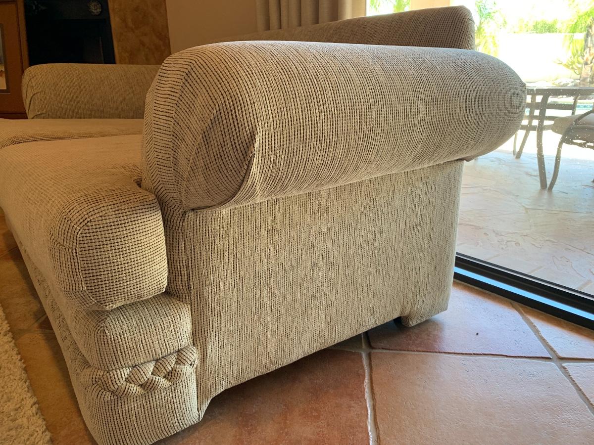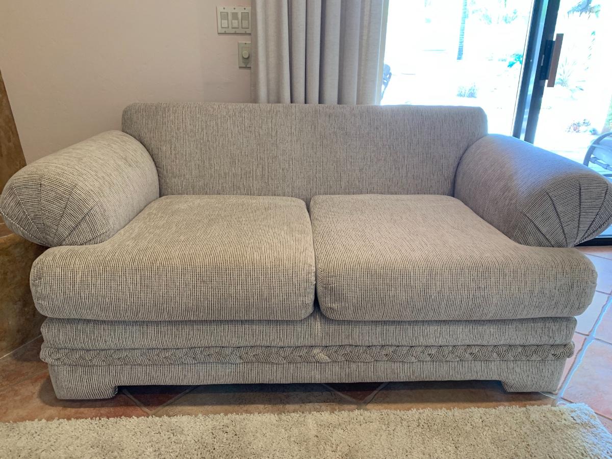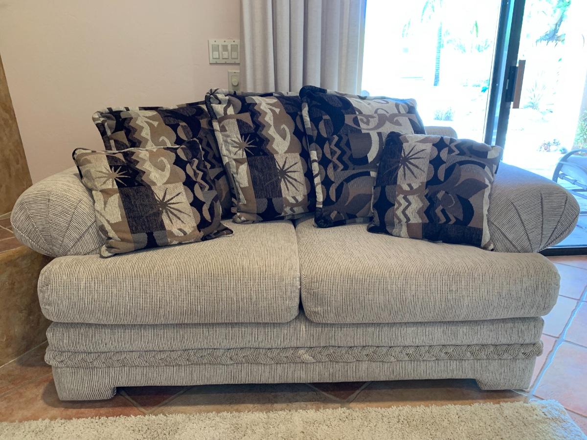 Identical to lot 7. Very comfortable white love seat with a woven fabric. (Sofa Measurements: 32” H x 74” L x 38” D) (Seat Measurement: 20” H x 31” D) with 5 pillows