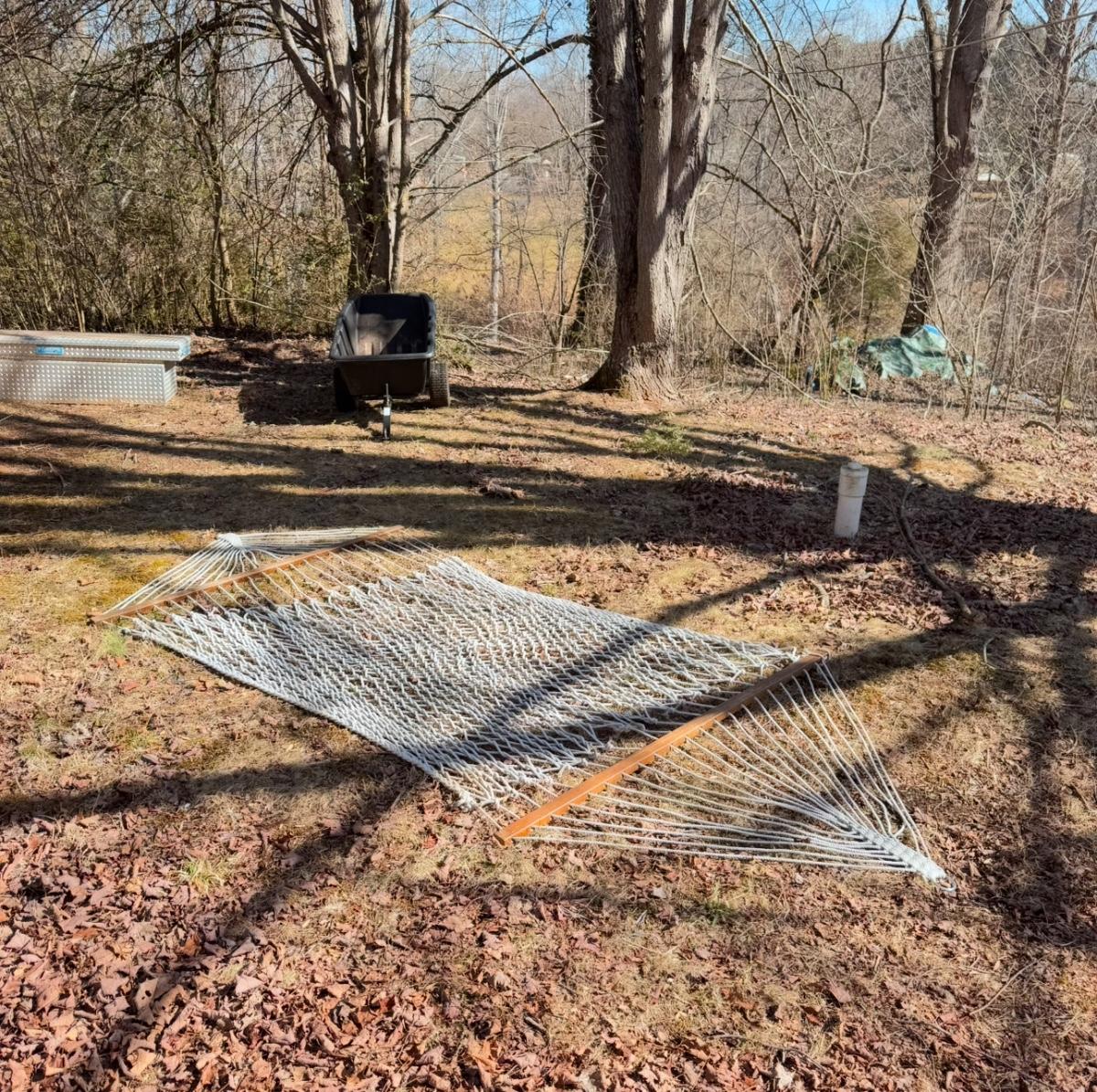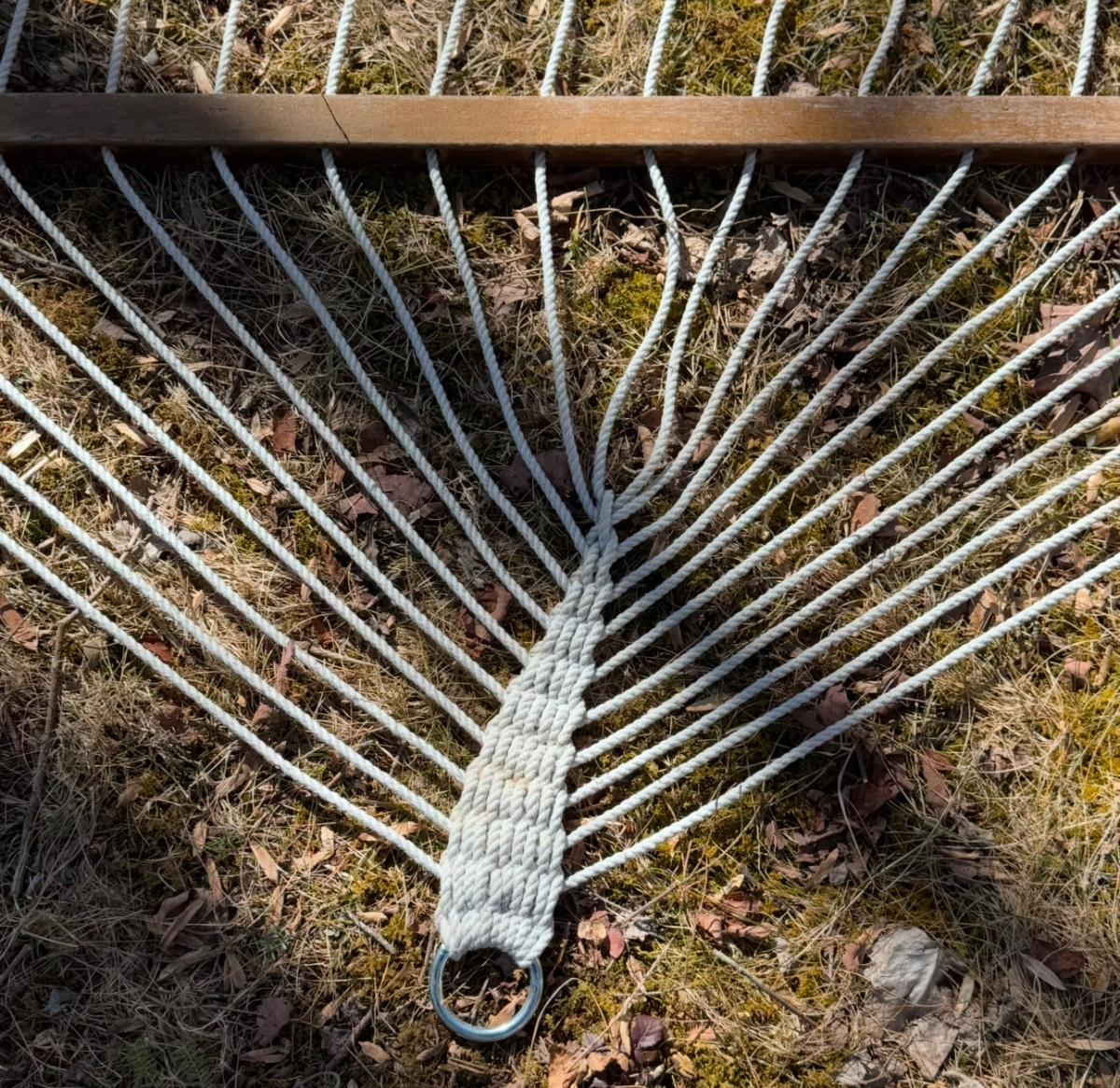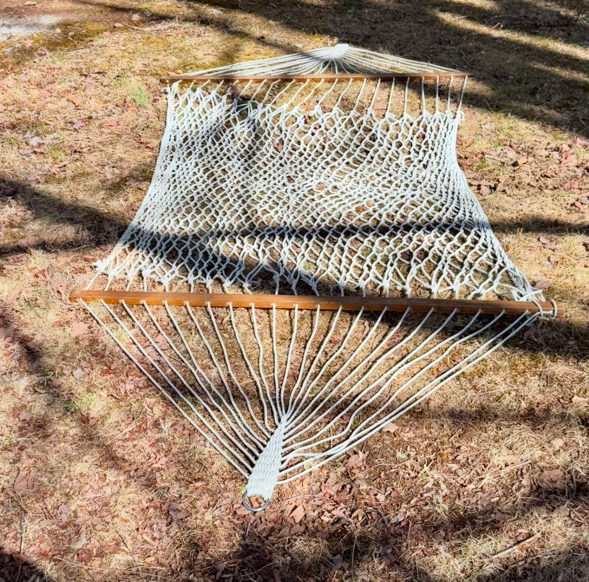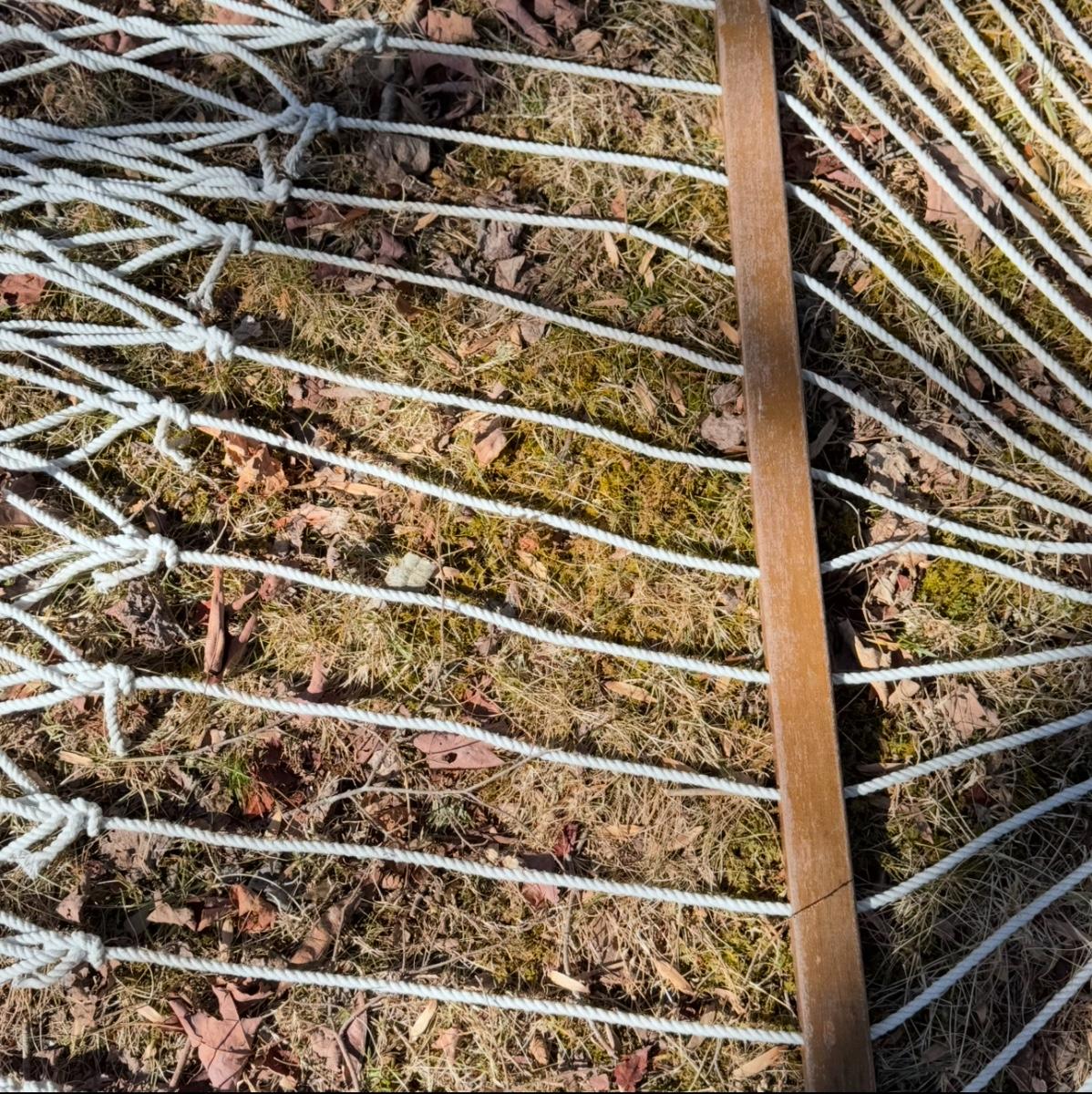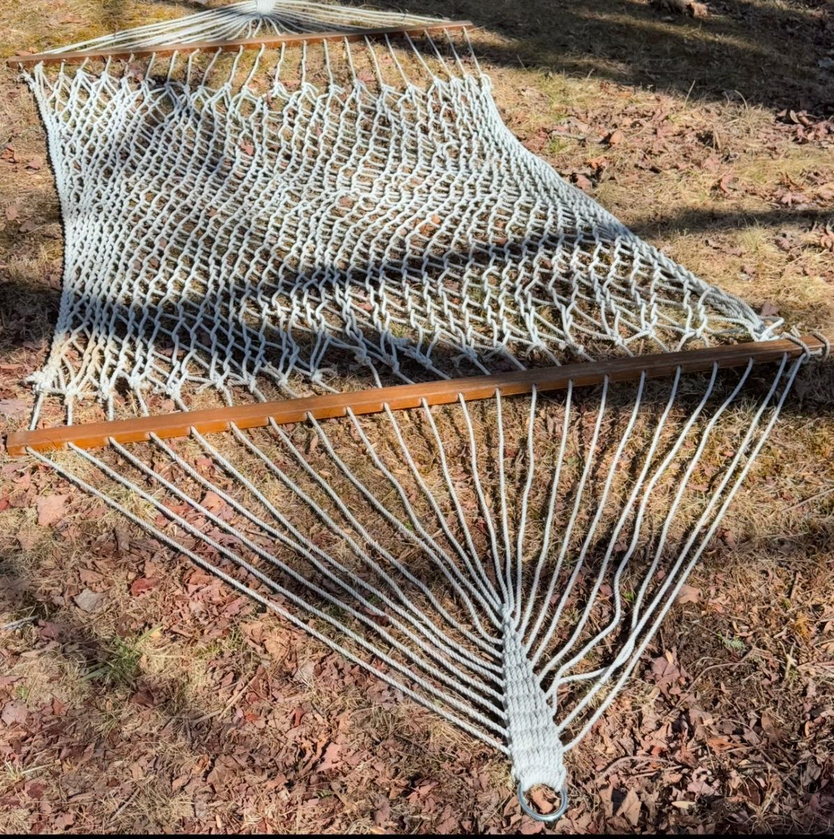 Lot includes one white macrame netted hammock made of rope, wood, and metal ends. The hammock measures 139” x 60”H. Local pickup only.