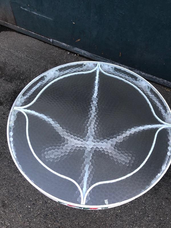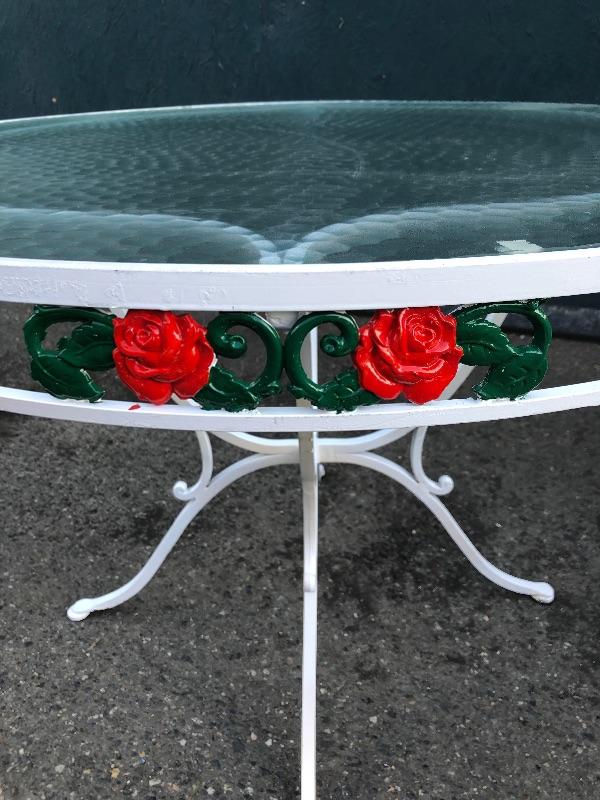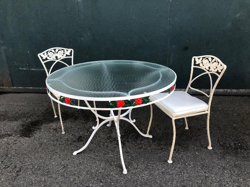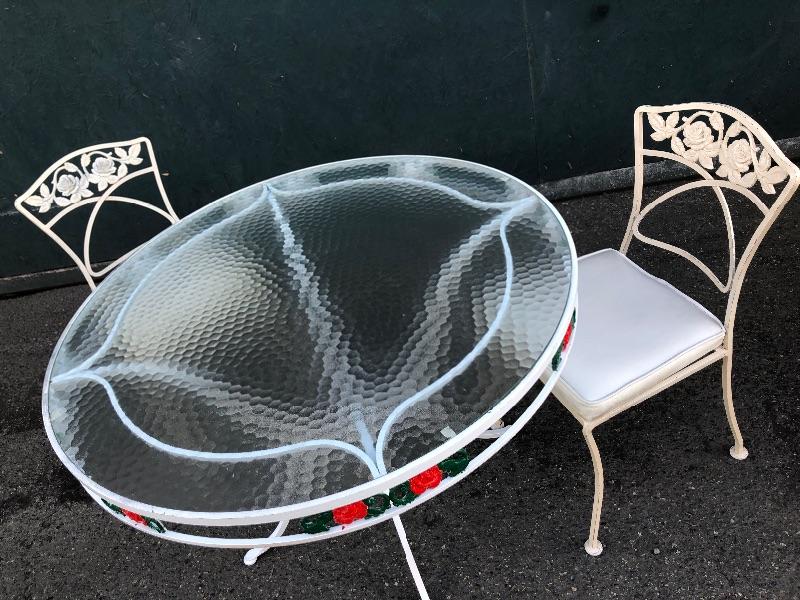 Dimensions of table are 42''Diameter x 29''H and chair are 17''L x 17''W x 33''H. Very cute set! Metal base with glass top.