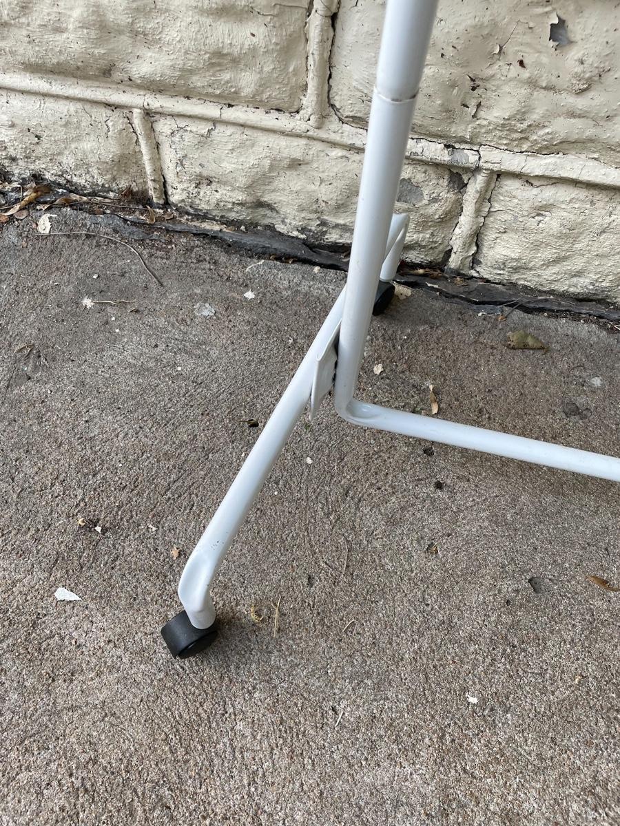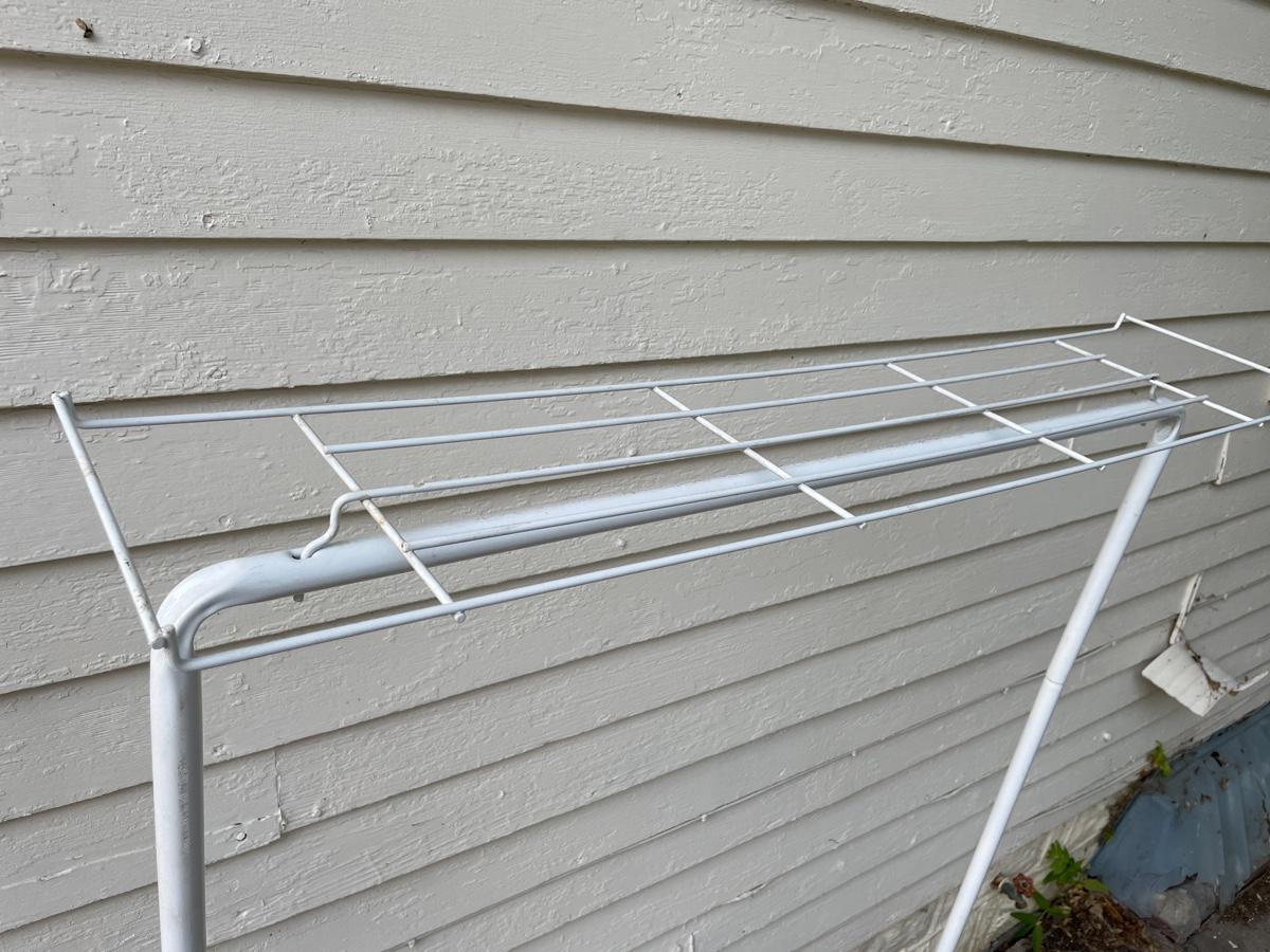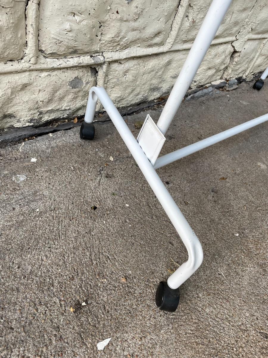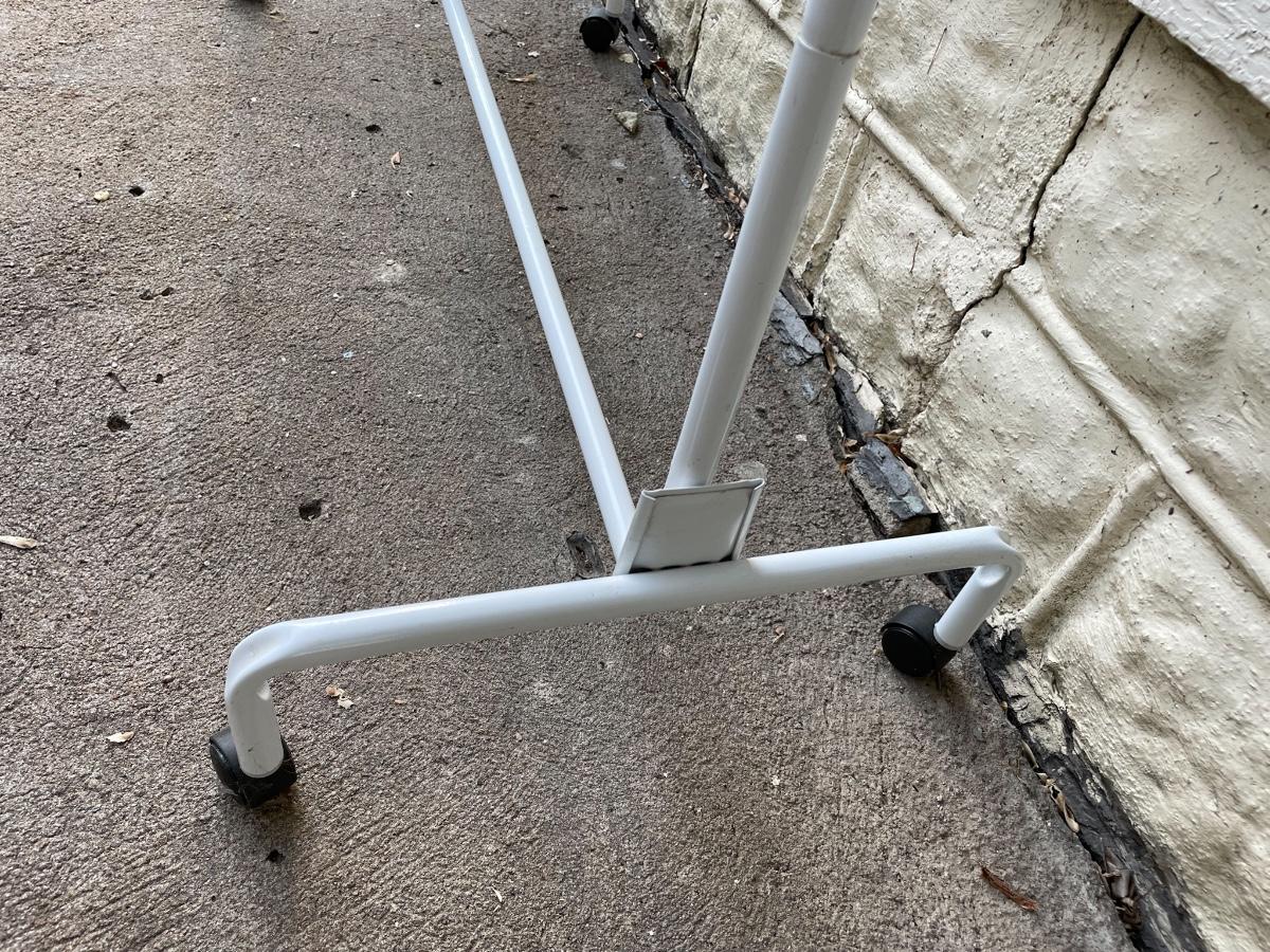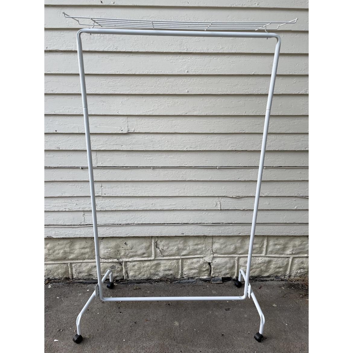 WHITE METAL ROLLING GARMENT RACK W/ SHELF