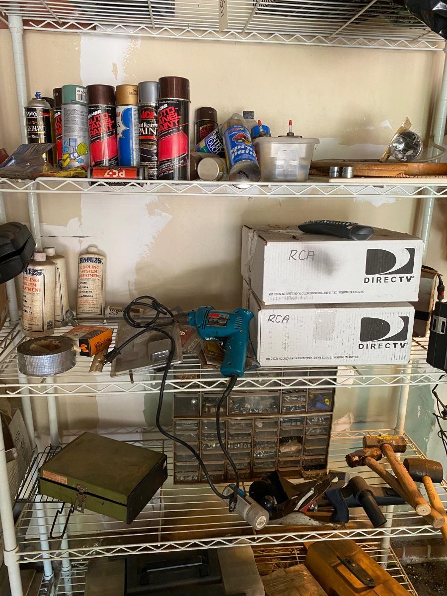 White Metal Storage Shelf w/ Misc Garage Supplies As Pictured BUYER MUST TAKE ALL