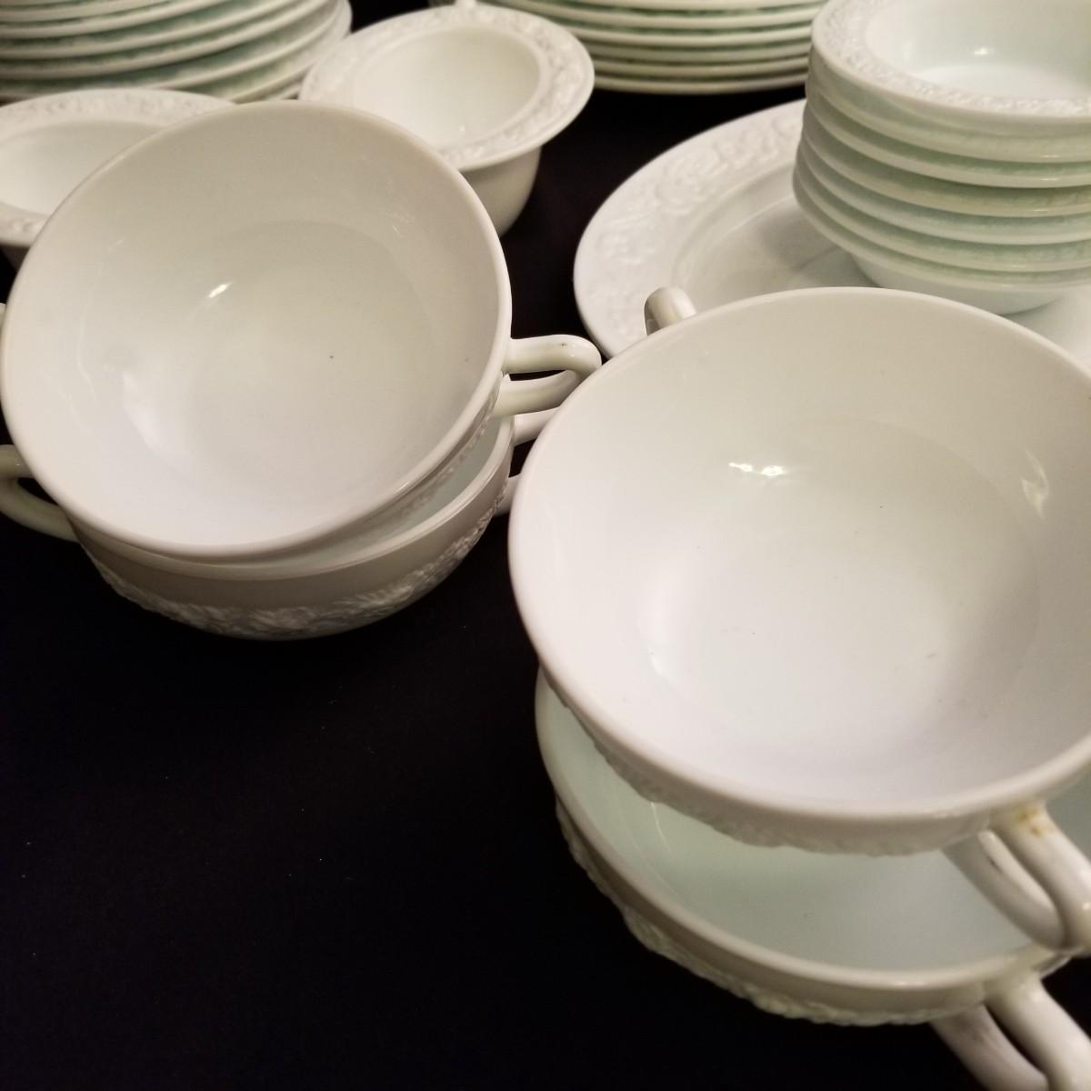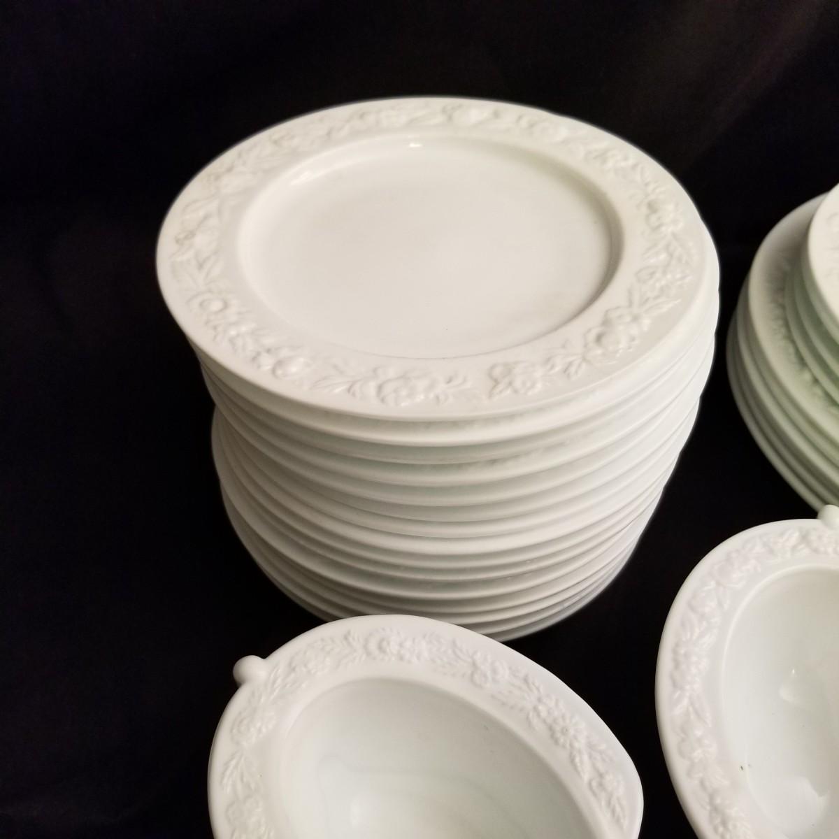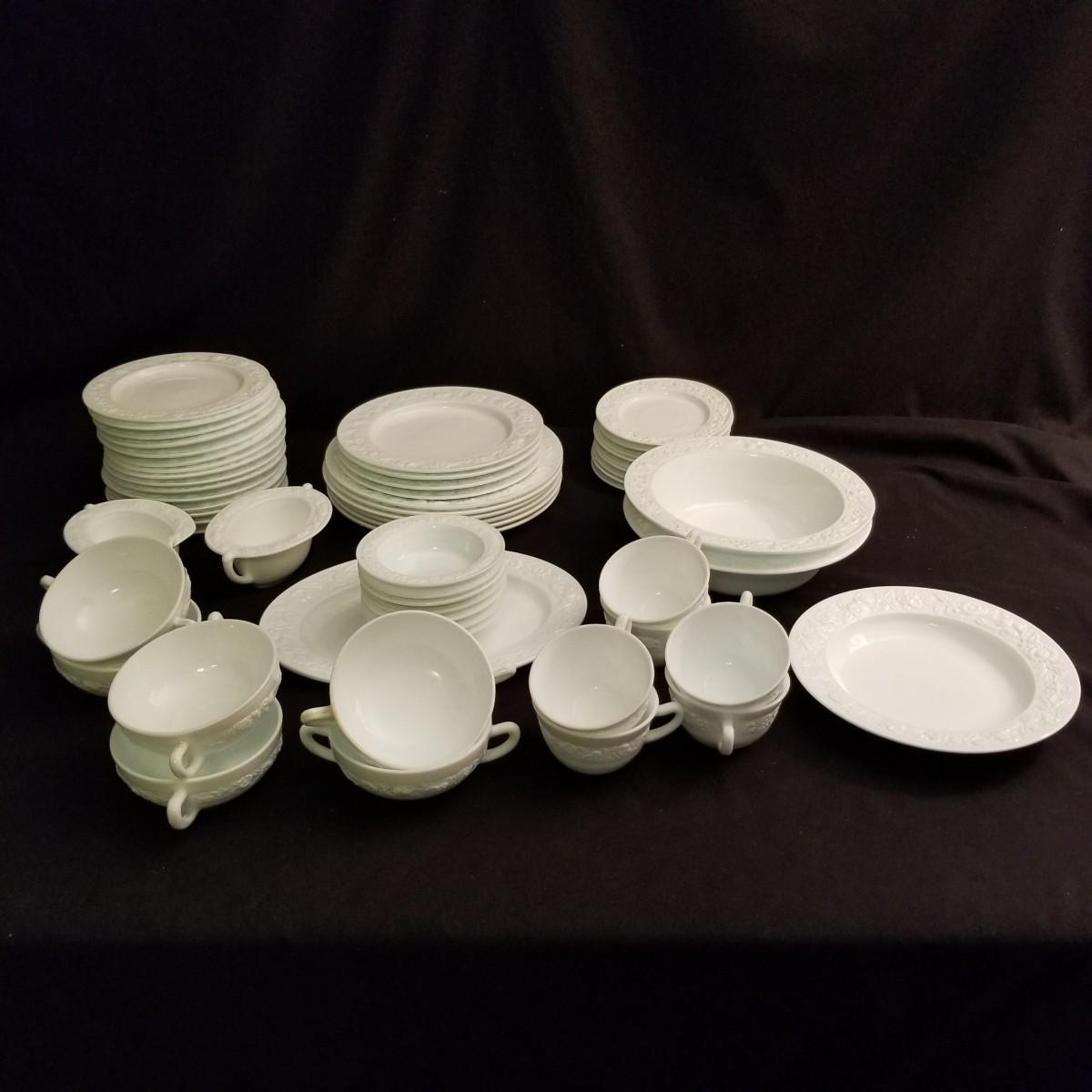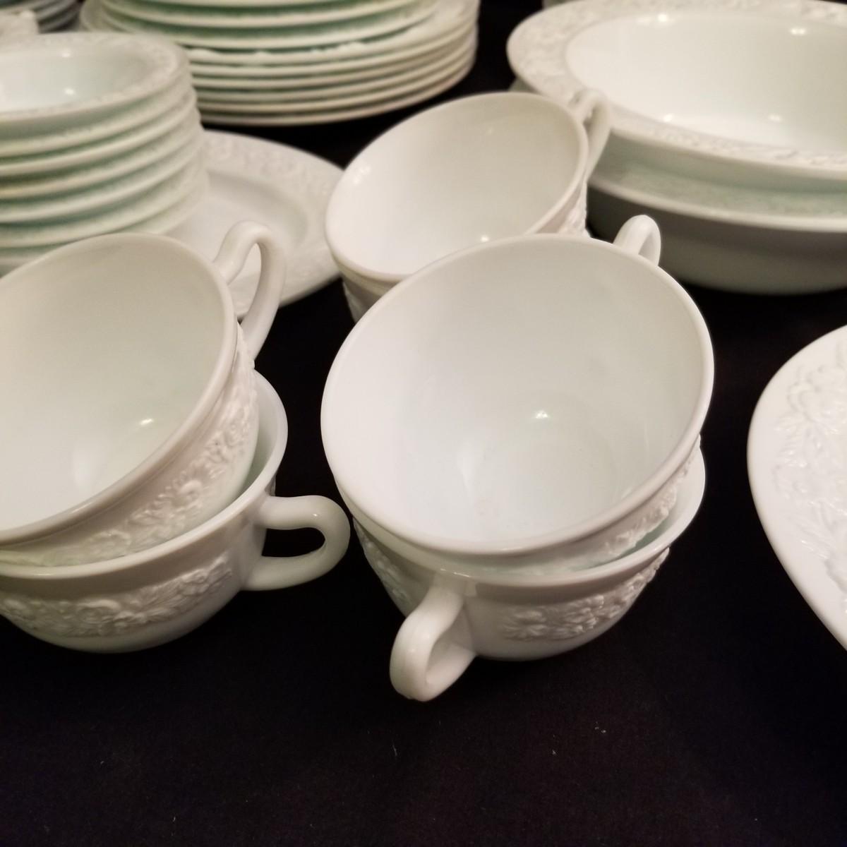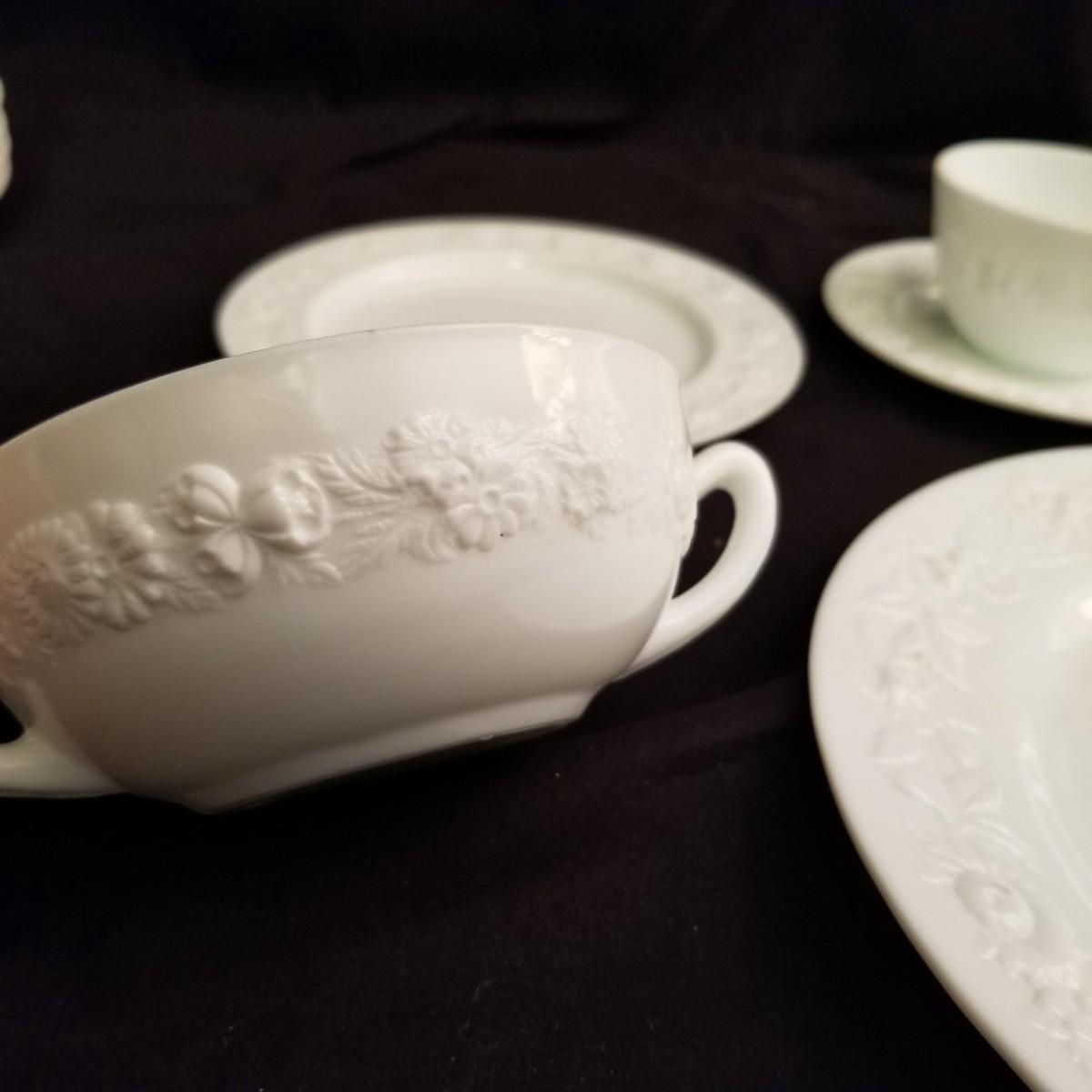 A set of white on white milk glass dishes with a floral pattern design. Fifty-nine pieces total. Dinner plates are 10" d. Set includes dinner, salad, bread/dessert plates. Also small bowls, soup cups, tea/coffee cups and saucers. Small serving platter, three serving bowls and creamer and sugar. No visible maker or name, items are in good condition. See photos for details. Shipping Available