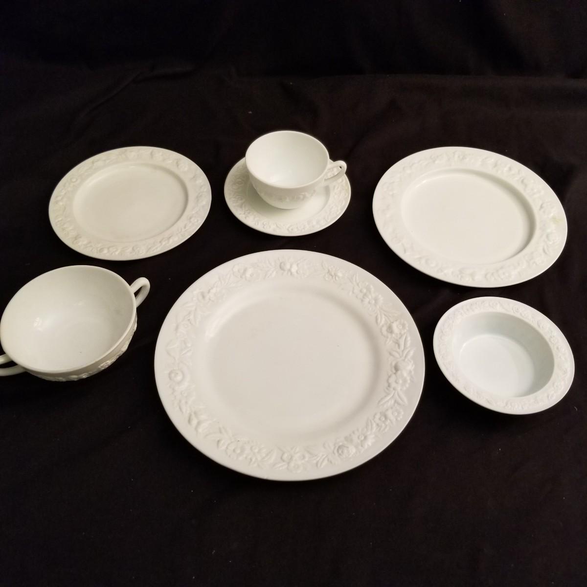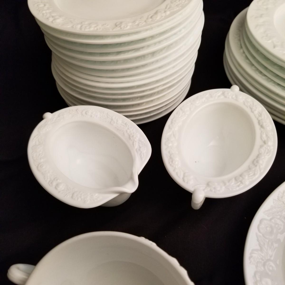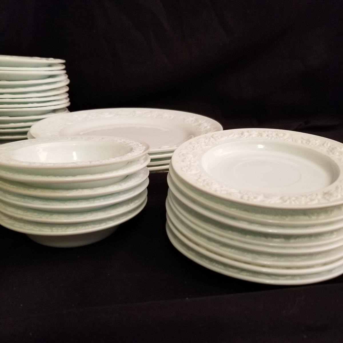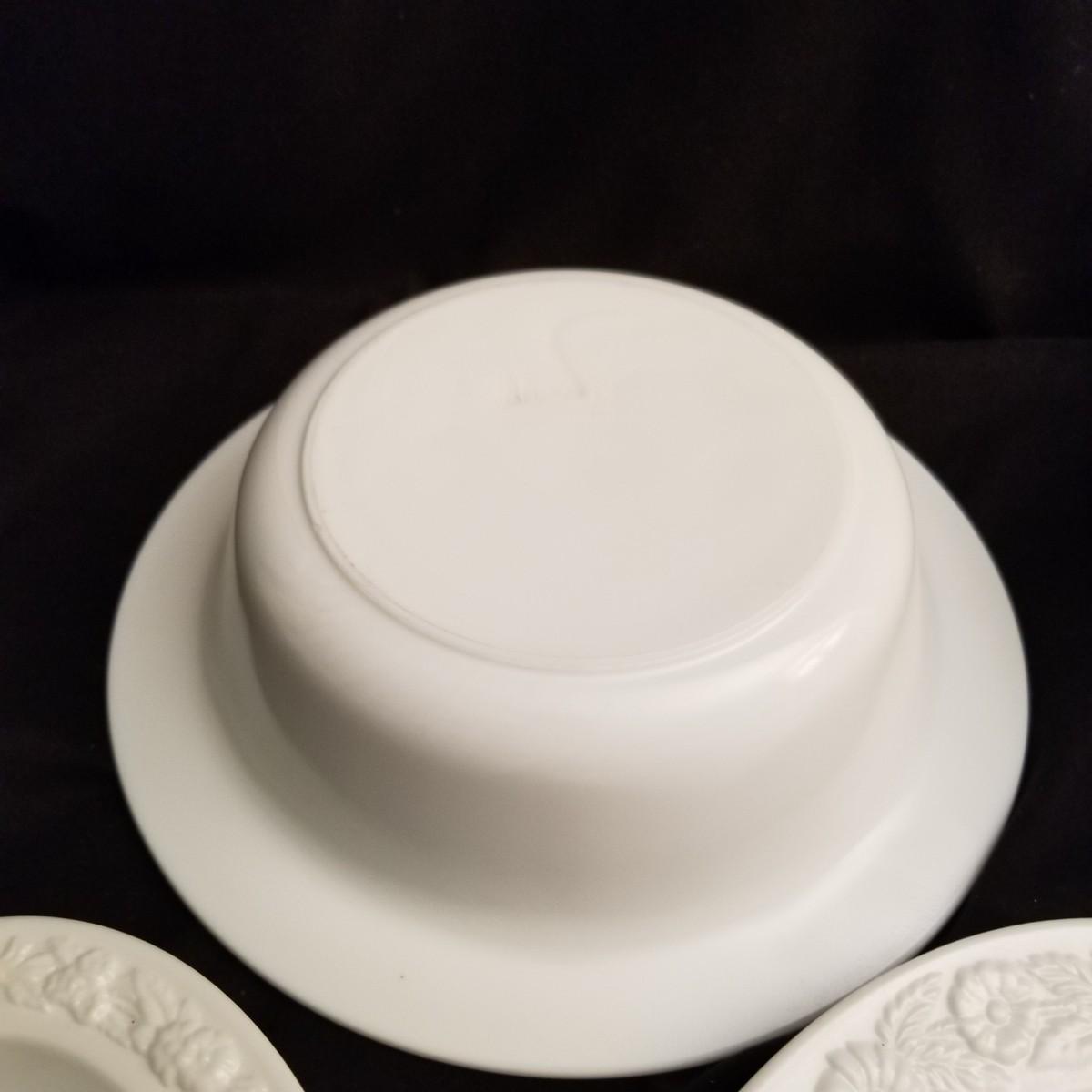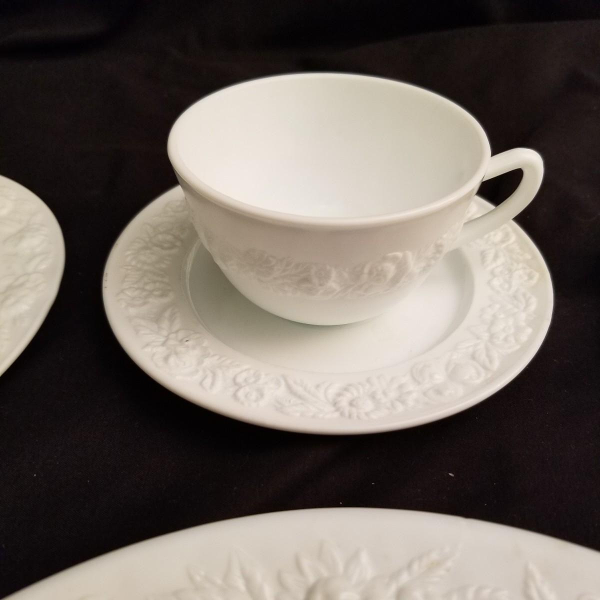 A set of white on white milk glass dishes with a floral pattern design. Fifty-nine pieces total. Dinner plates are 10" d. Set includes dinner, salad, bread/dessert plates. Also small bowls, soup cups, tea/coffee cups and saucers. Small serving platter, three serving bowls and creamer and sugar. No visible maker or name, items are in good condition. See photos for details. Shipping Available