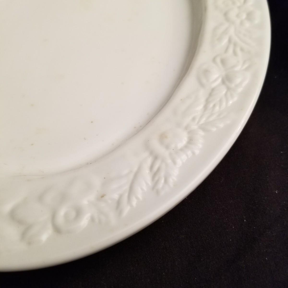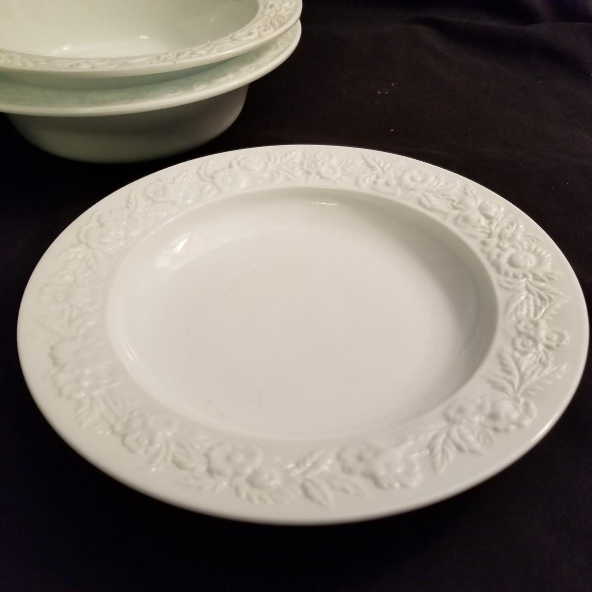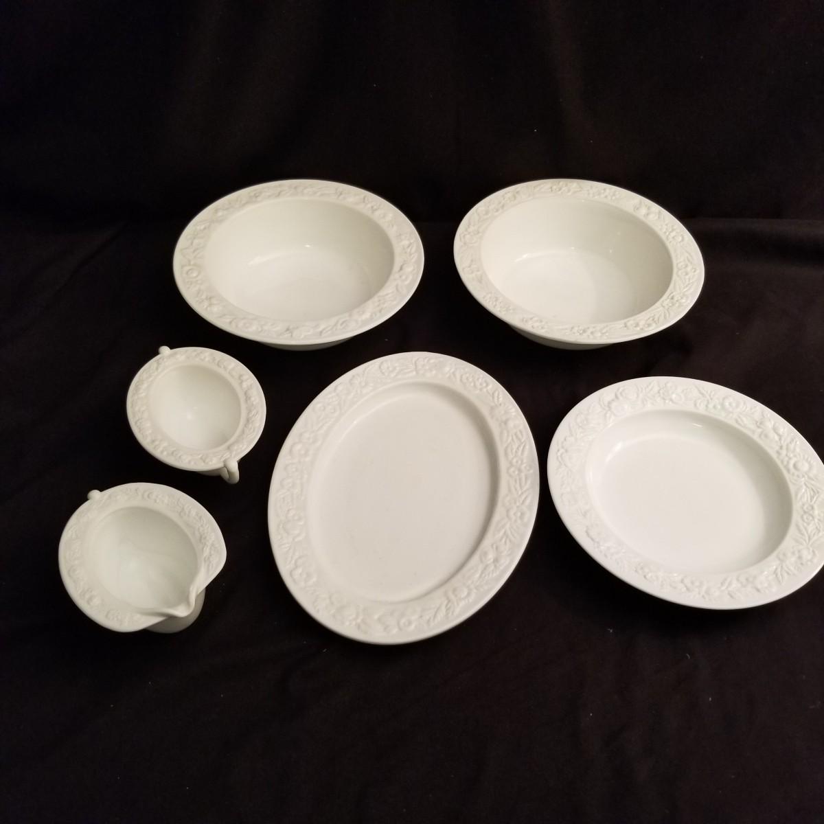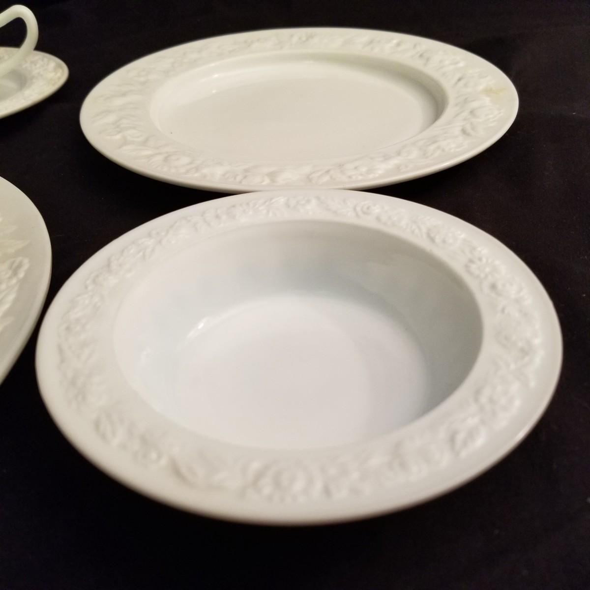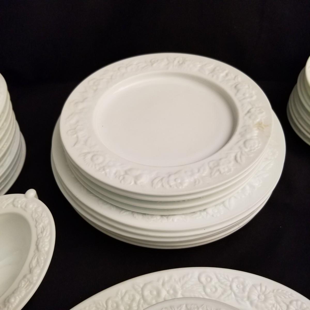 A set of white on white milk glass dishes with a floral pattern design. Fifty-nine pieces total. Dinner plates are 10" d. Set includes dinner, salad, bread/dessert plates. Also small bowls, soup cups, tea/coffee cups and saucers. Small serving platter, three serving bowls and creamer and sugar. No visible maker or name, items are in good condition. See photos for details. Shipping Available