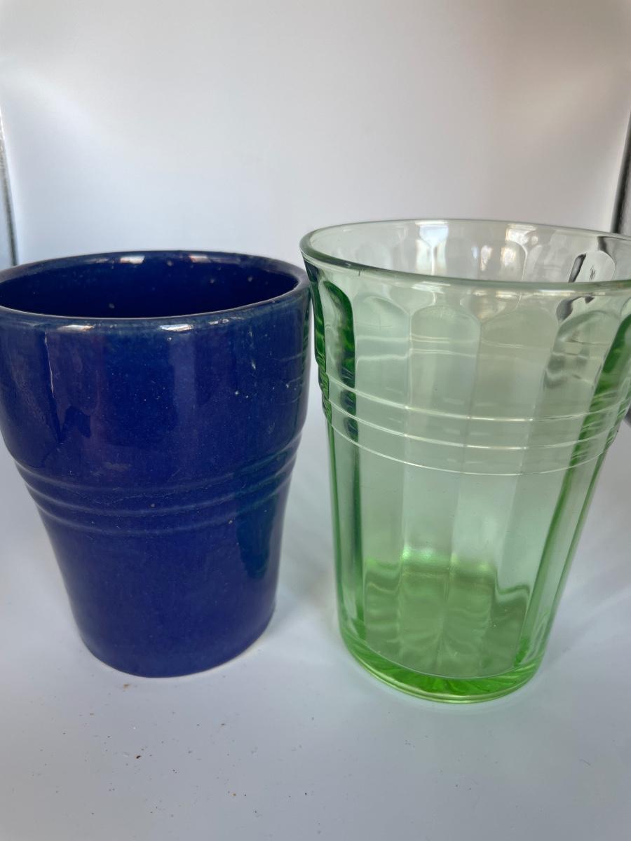 White milk glass mixing bowl with green depression glass cup and blue fiesta style cup