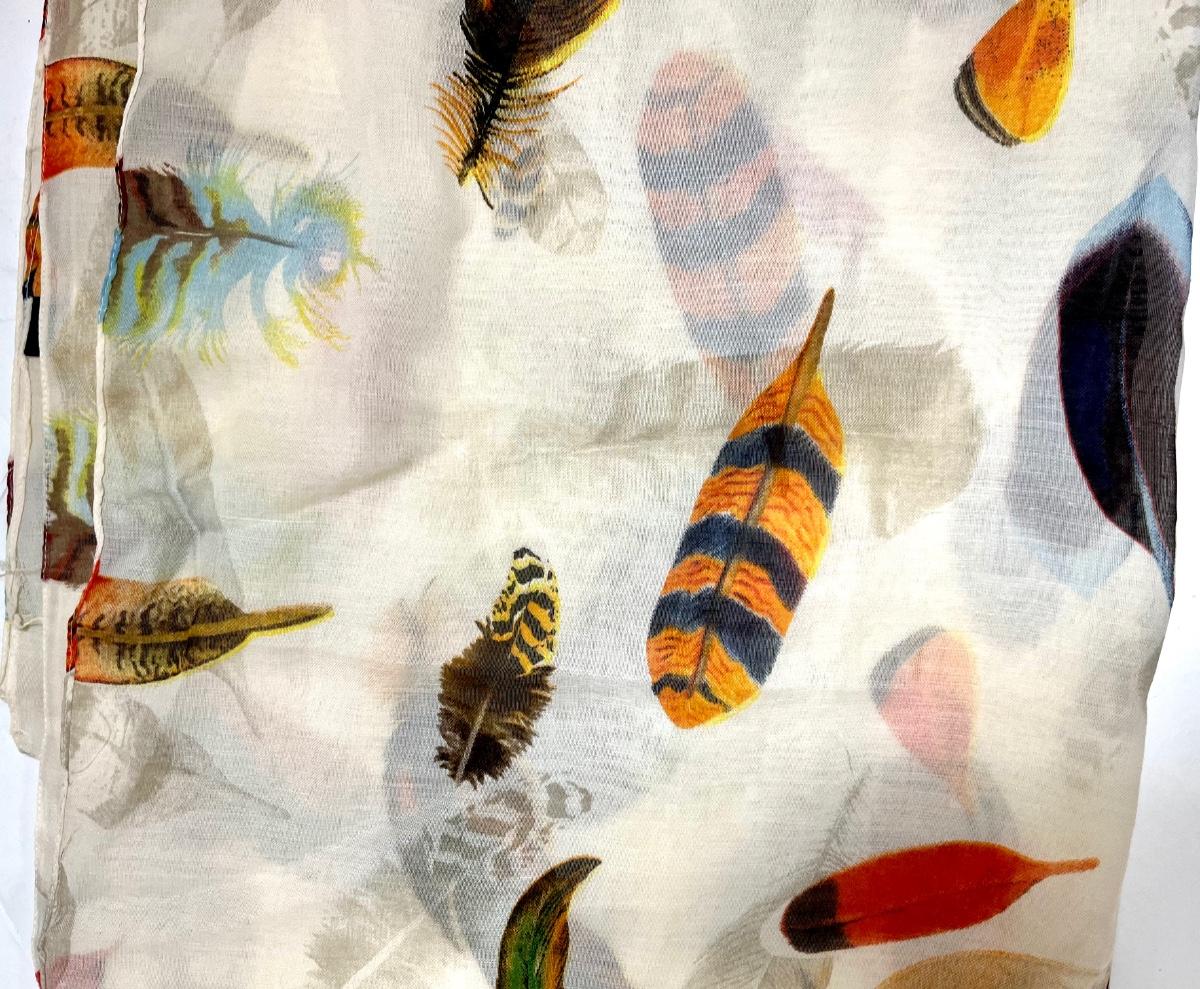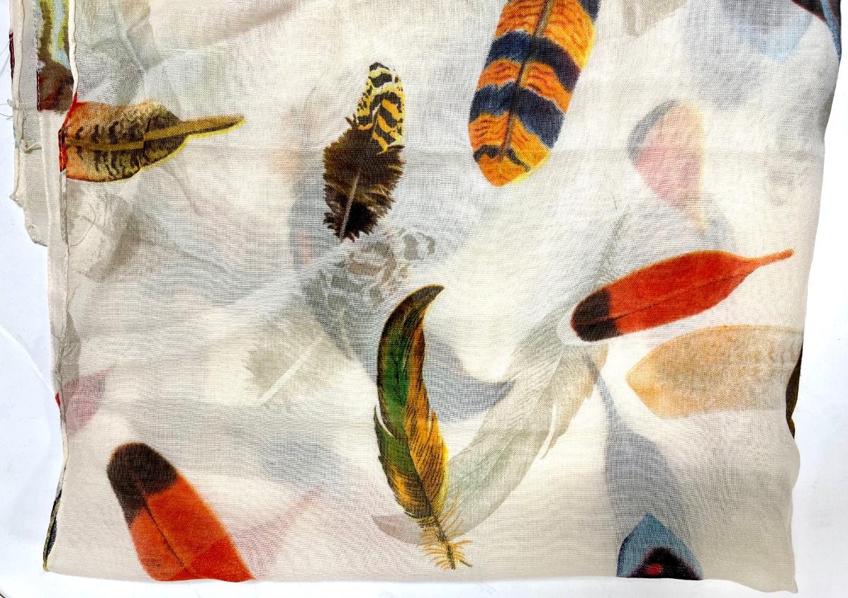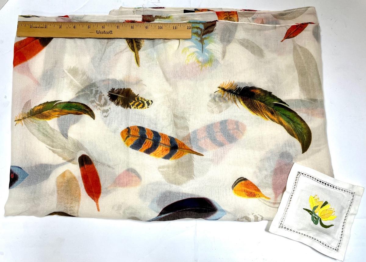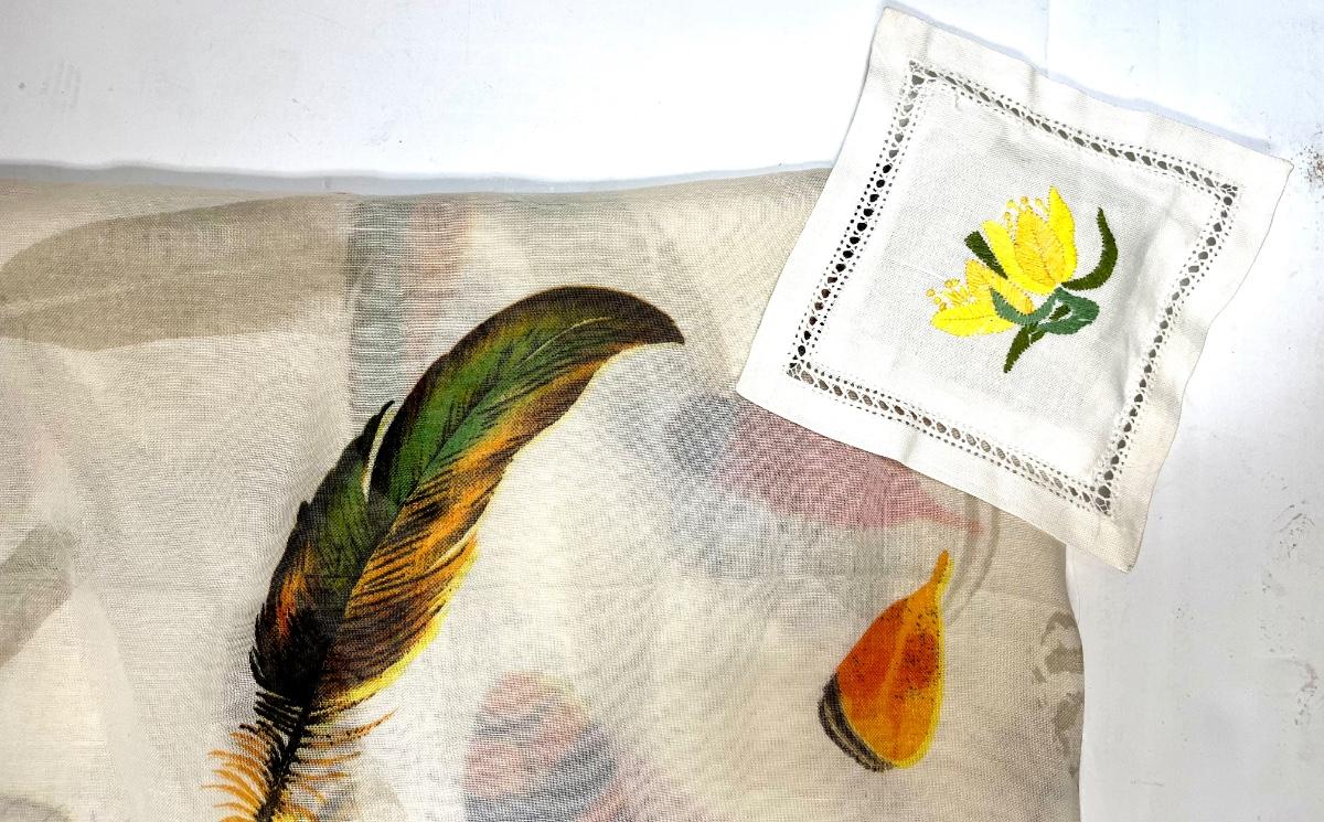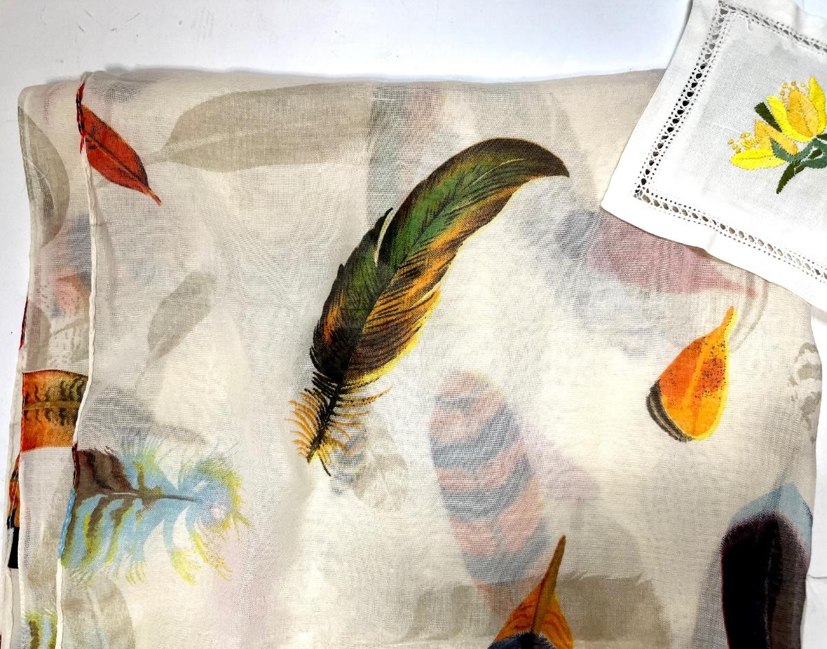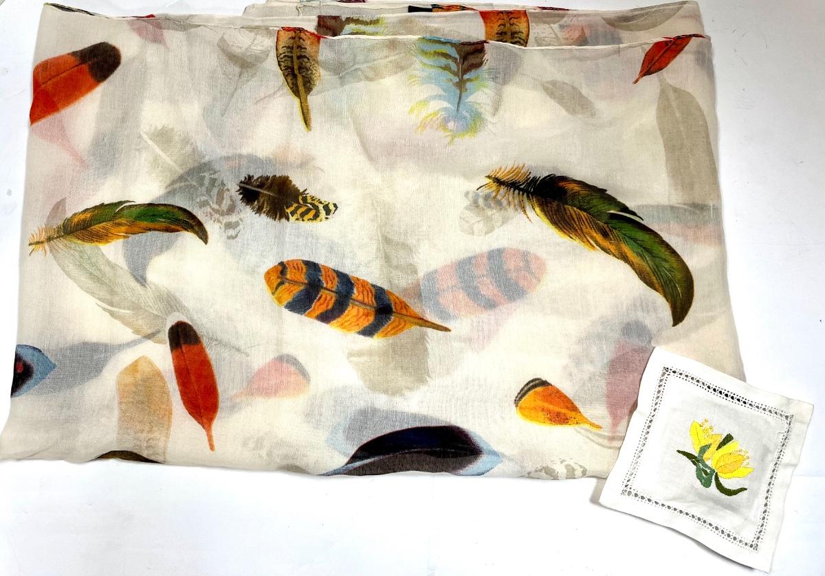 White multicolor feather patterned scarf shawl and white yellow flower embroidered scent pillow