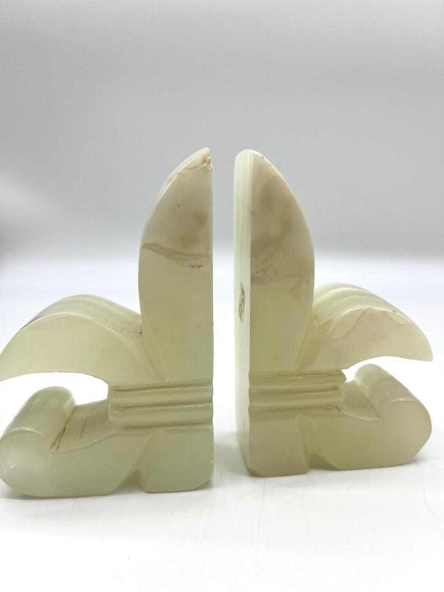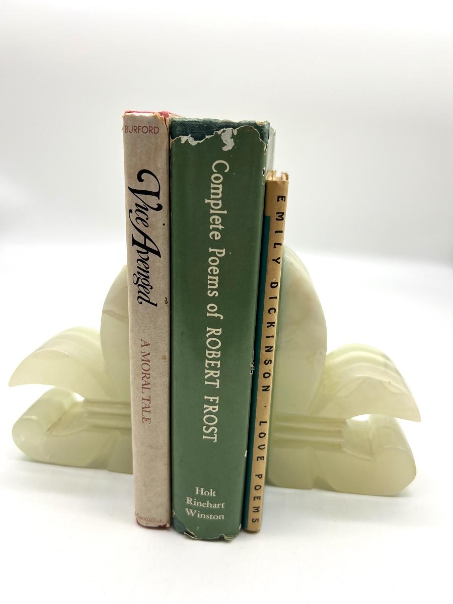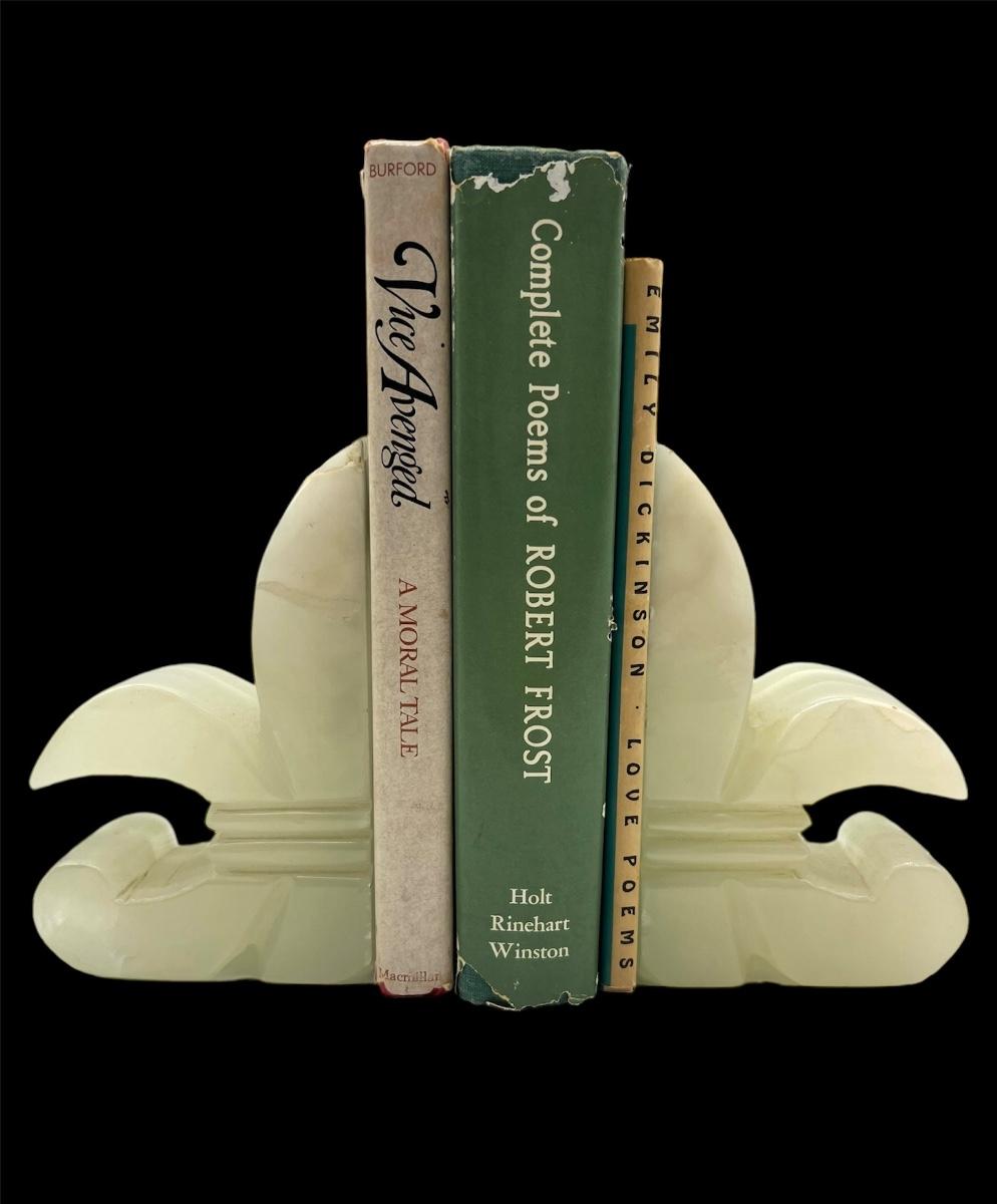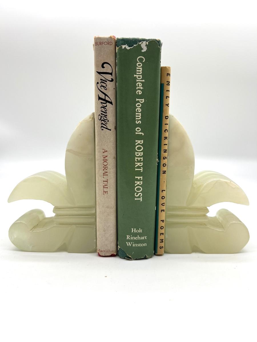 Set of white onyx Fleur De Lis Bookends And three books, A Moral Tale, Complete Poems Of Robert Frost and Emily Dickinson Love Poems. Each bookend measure 6 inches tall and 3 3/4 inches wide. (individually)