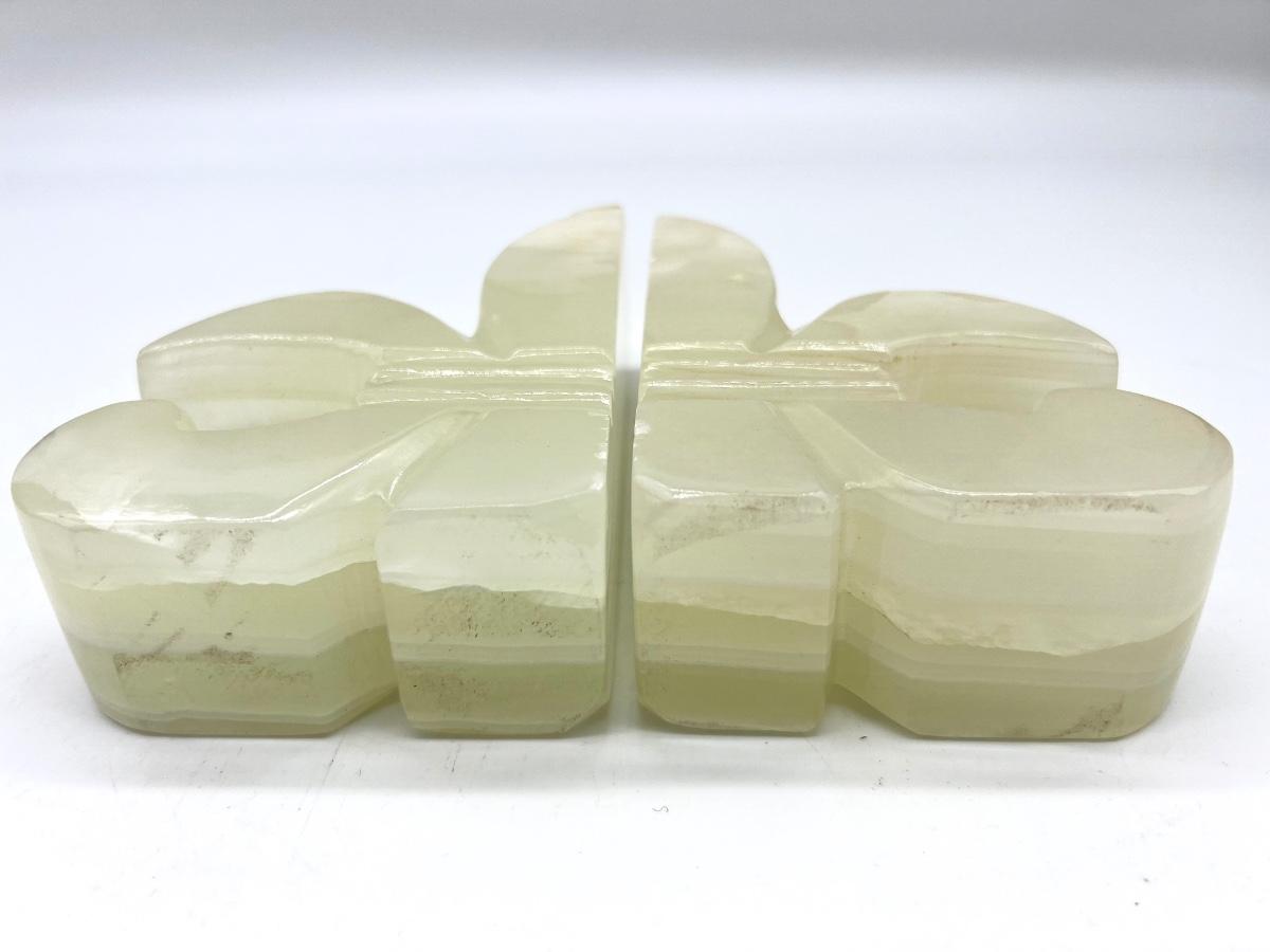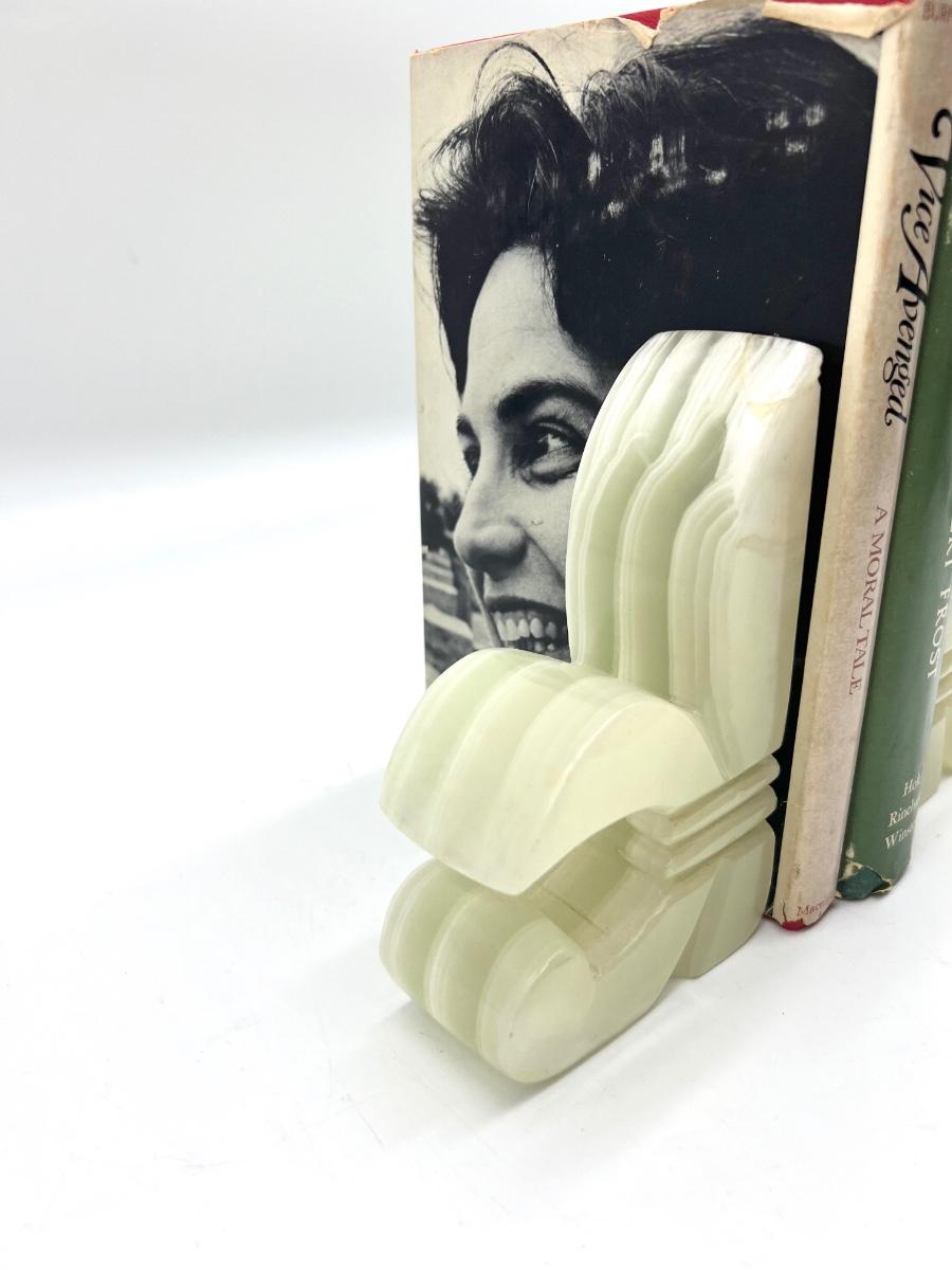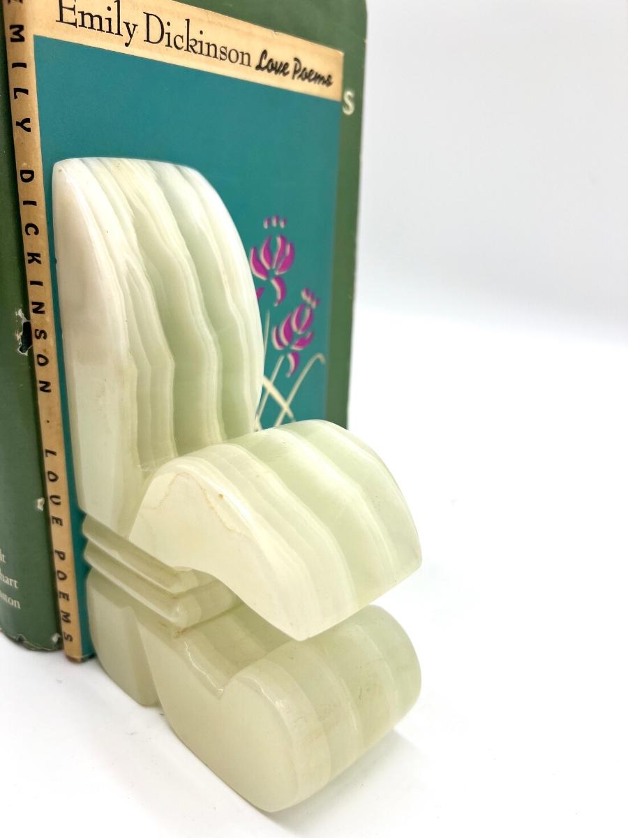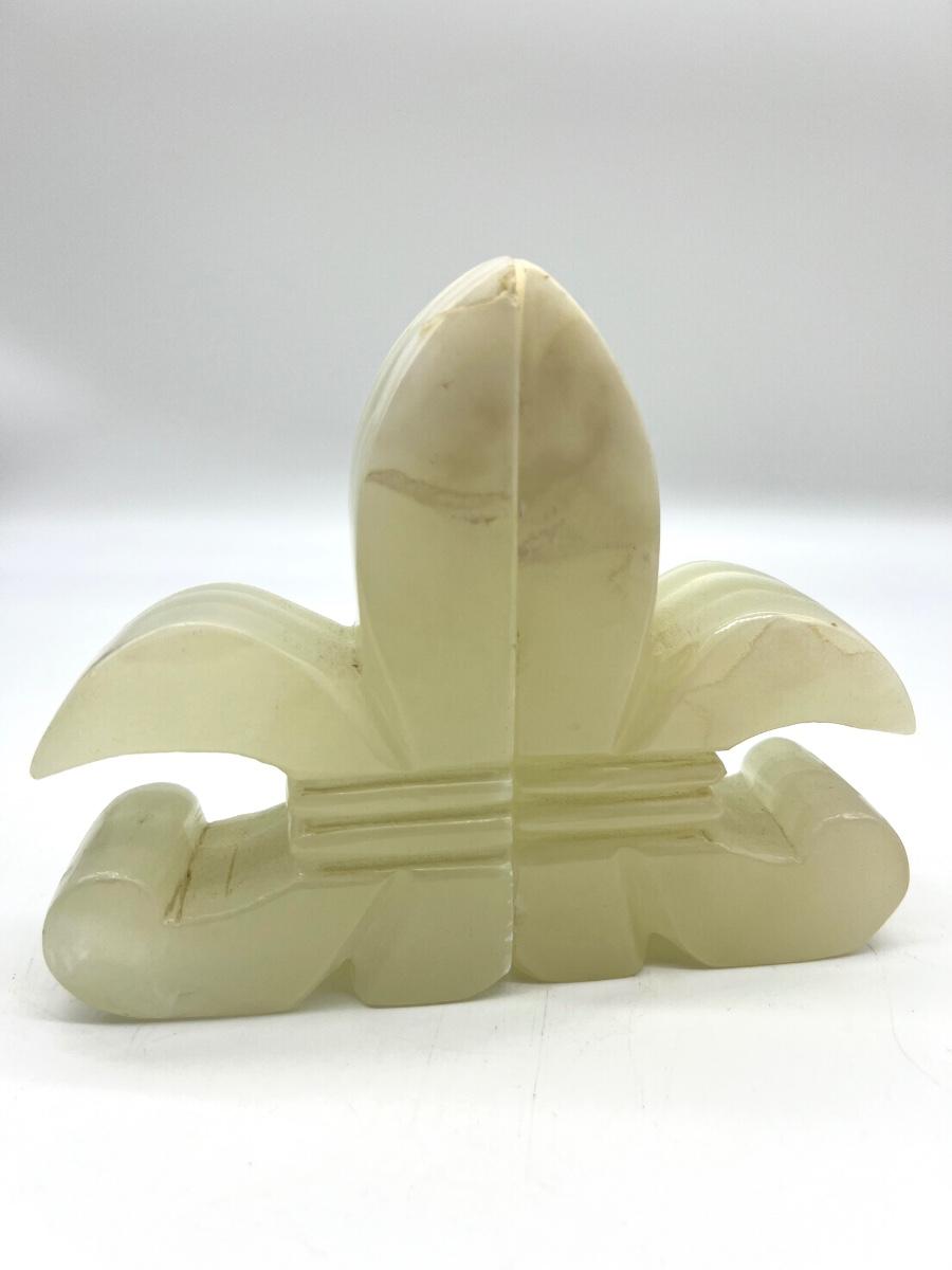 Set of white onyx Fleur De Lis Bookends And three books, A Moral Tale, Complete Poems Of Robert Frost and Emily Dickinson Love Poems. Each bookend measure 6 inches tall and 3 3/4 inches wide. (individually)