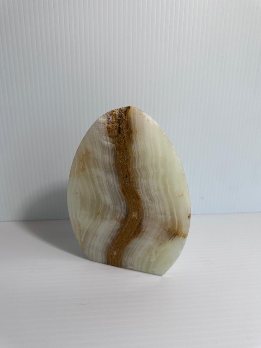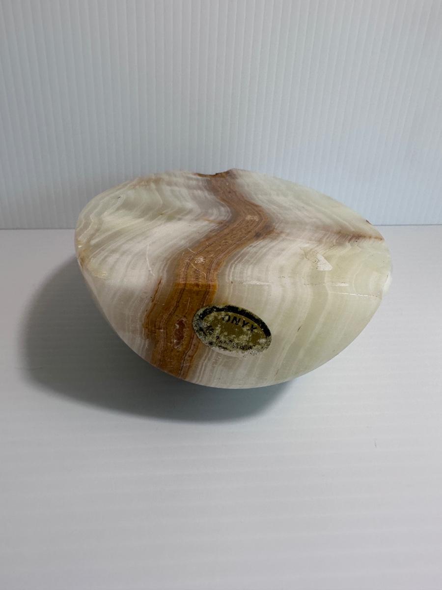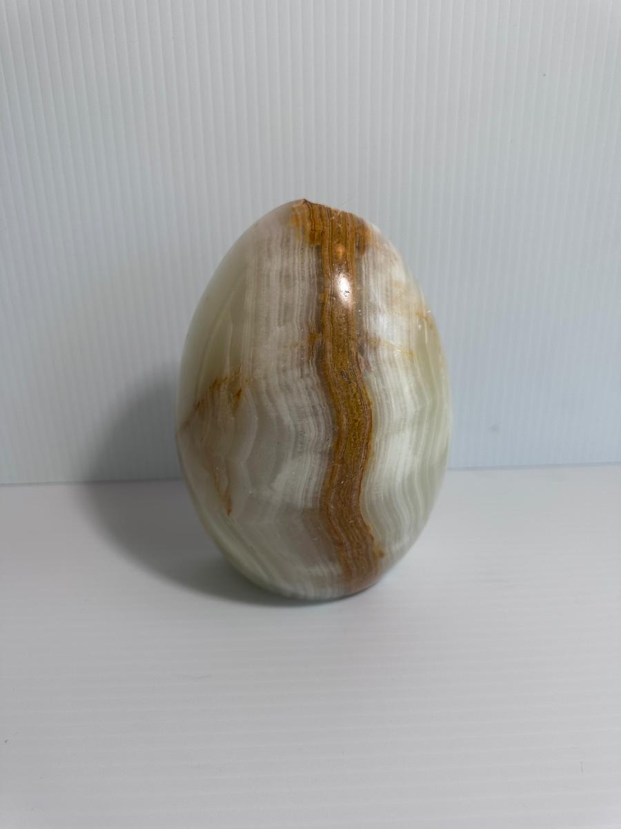 white onyx stone egg. Has chip on top. Sticker on underside "Onyx"