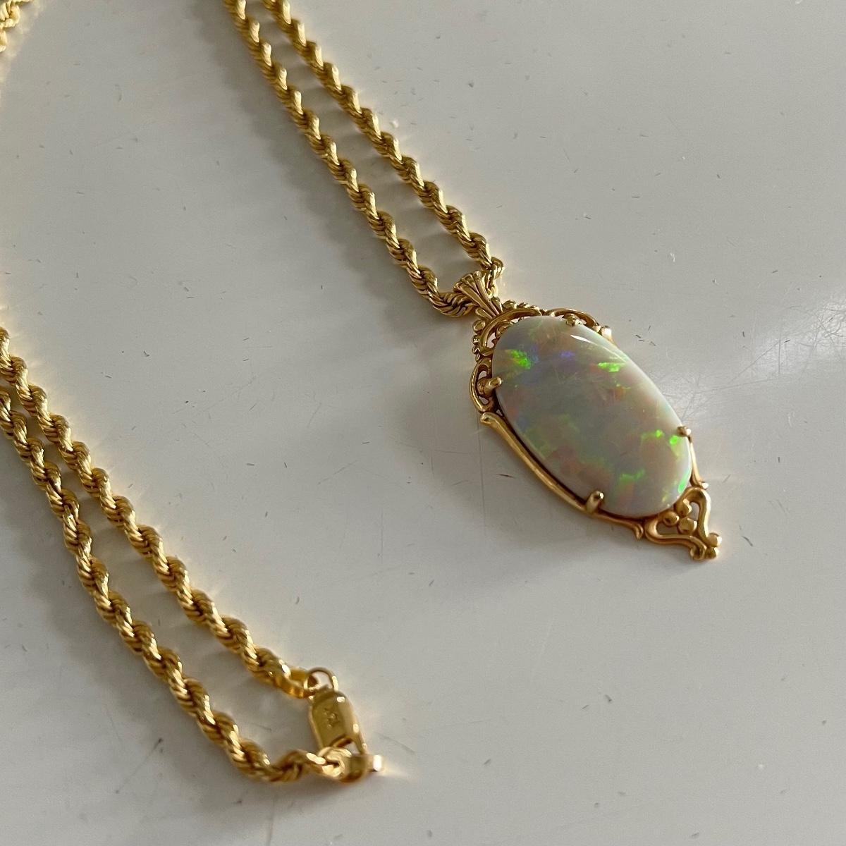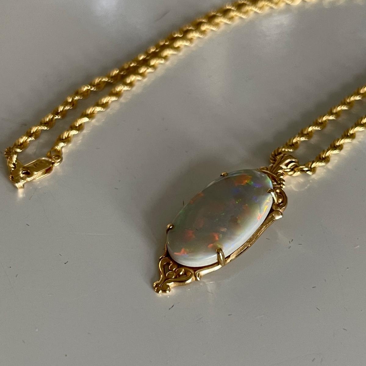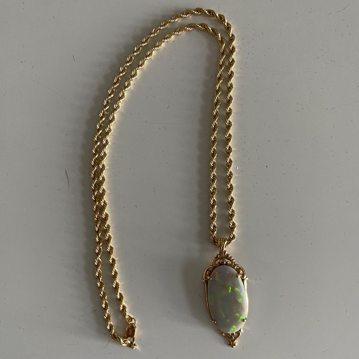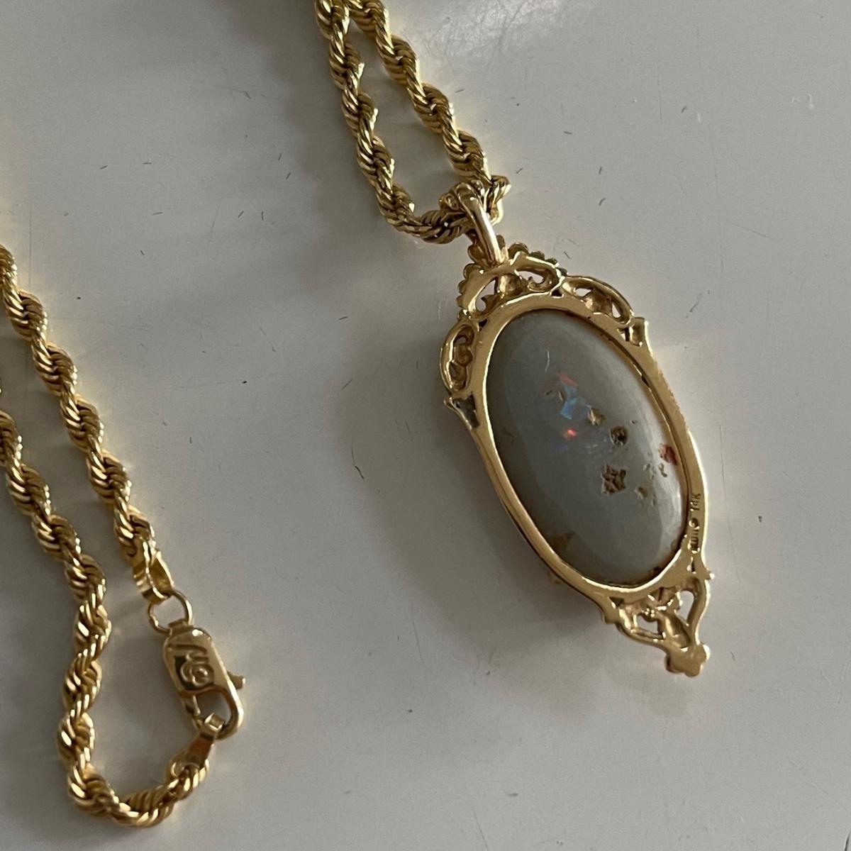 A beautiful white opal pendant is marked 14k and is on a 14k gold rope chain. The 14k mark is on the side of the clasp and back of the pendant. The length of the necklace when clasped is 20" long, The opal is about 1" x 0.5"