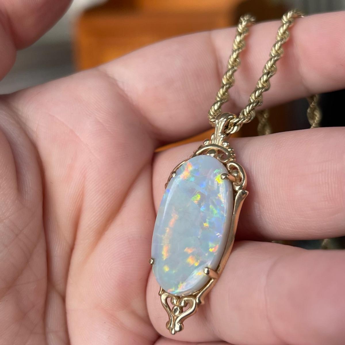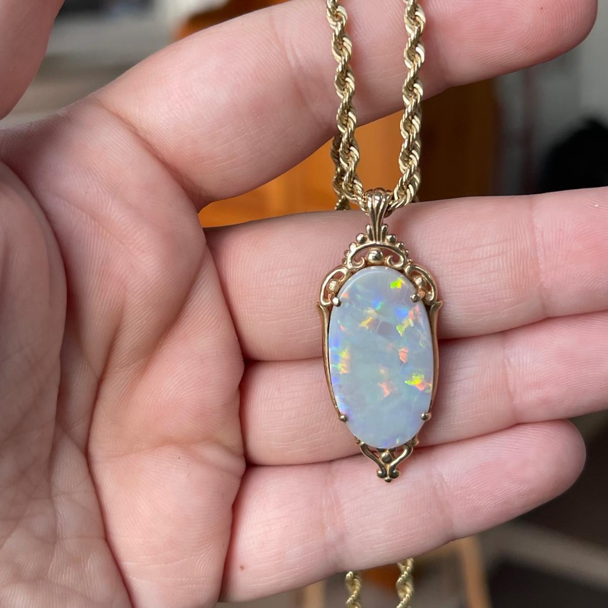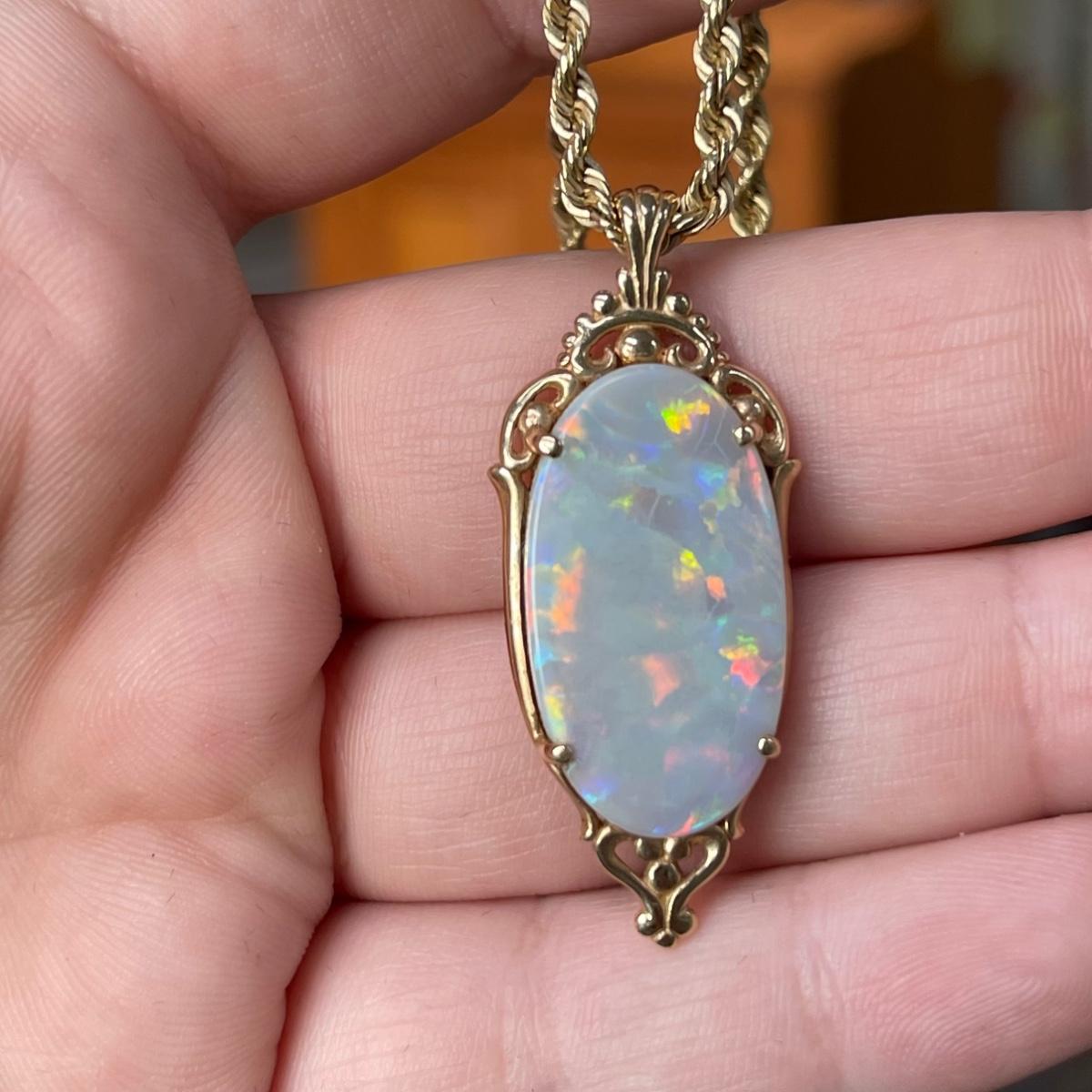 A beautiful white opal pendant is marked 14k and is on a 14k gold rope chain. The 14k mark is on the side of the clasp and back of the pendant. The length of the necklace when clasped is 20" long, The opal is about 1" x 0.5"