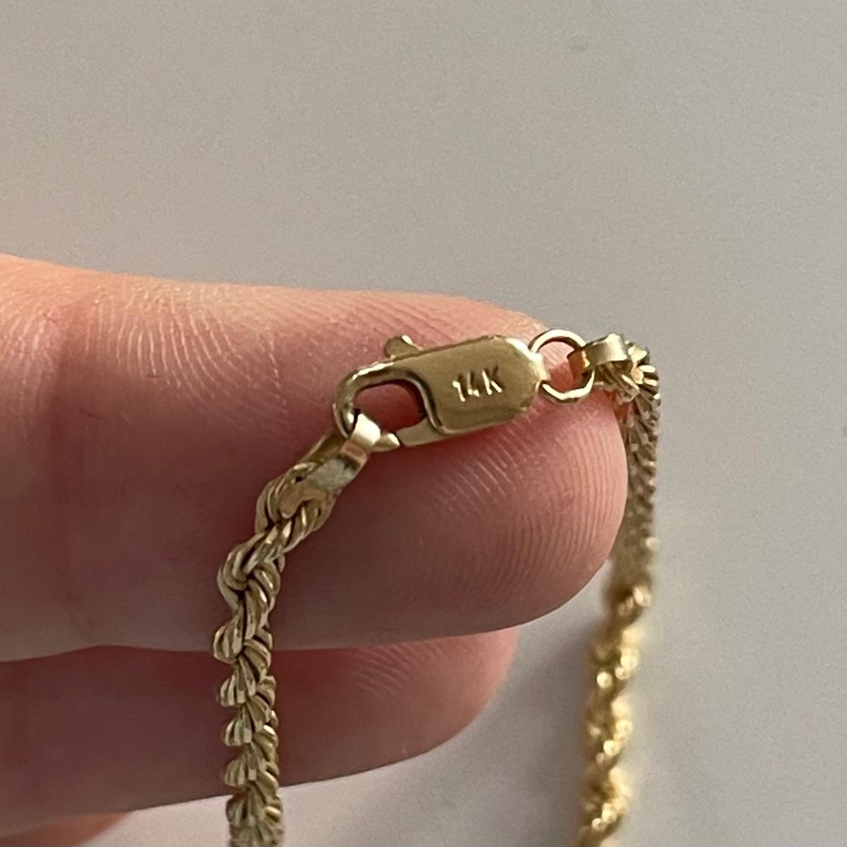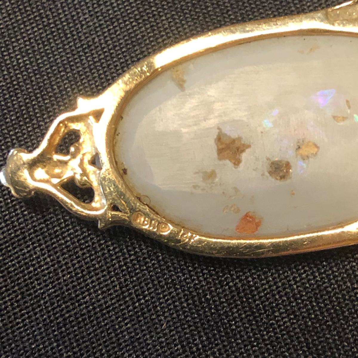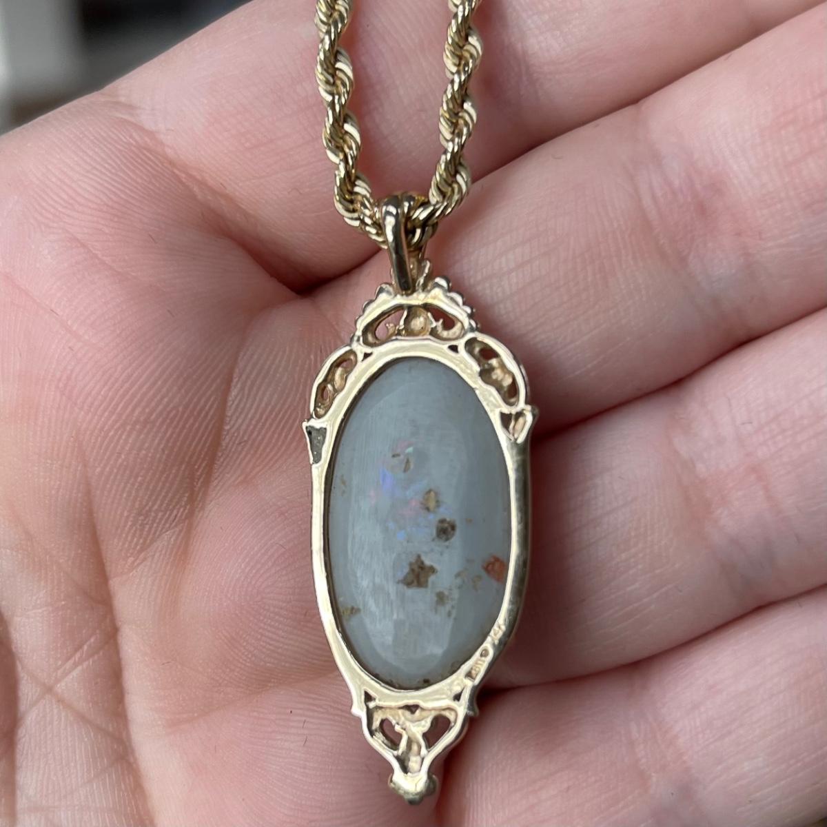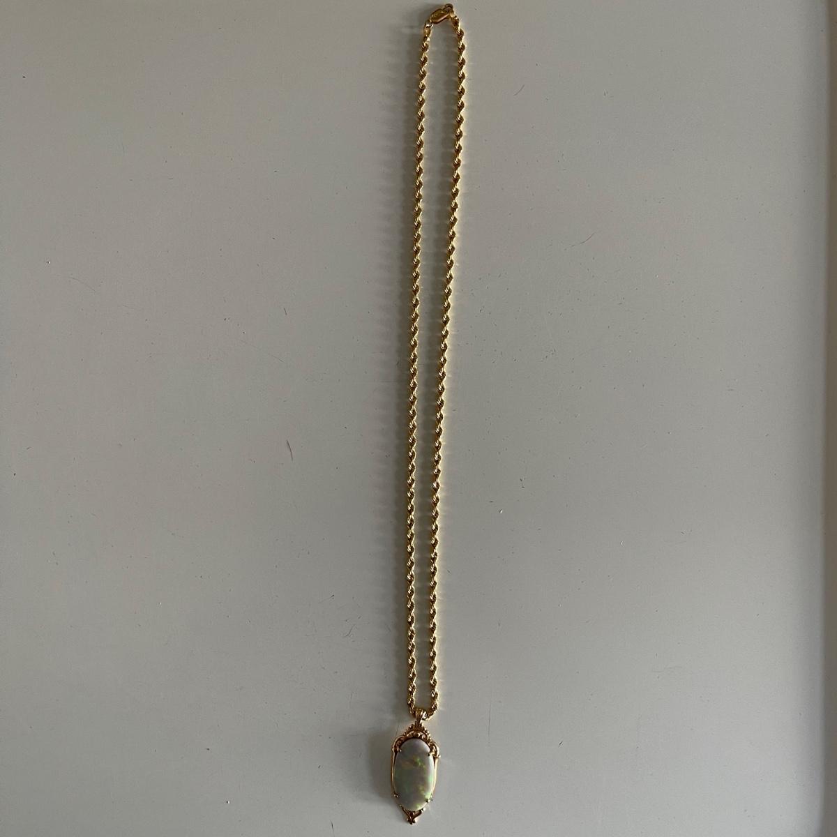 A beautiful white opal pendant is marked 14k and is on a 14k gold rope chain. The 14k mark is on the side of the clasp and back of the pendant. The length of the necklace when clasped is 20" long, The opal is about 1" x 0.5"