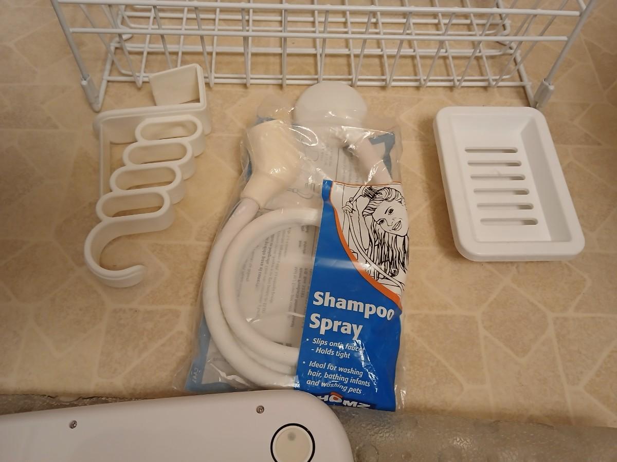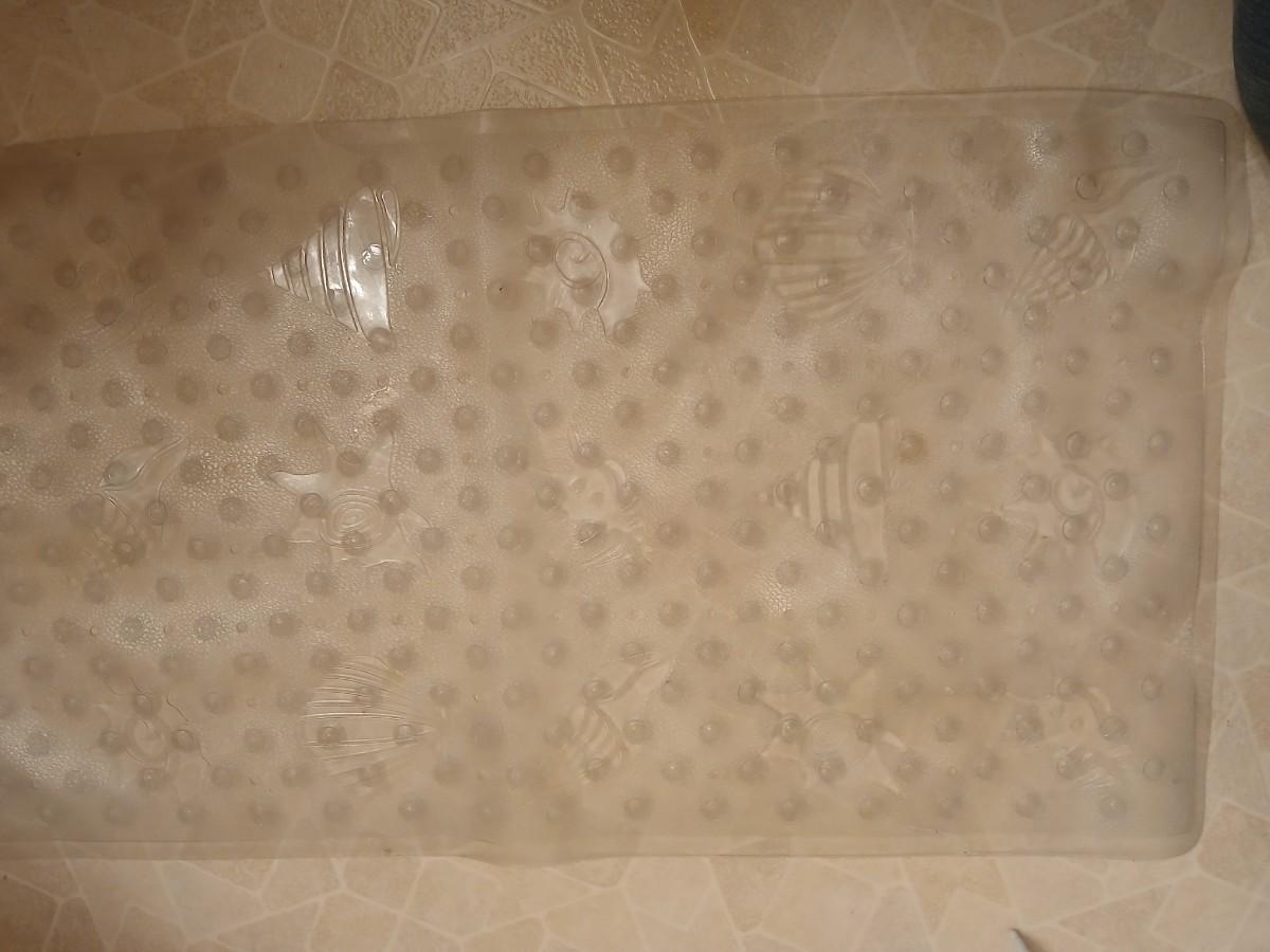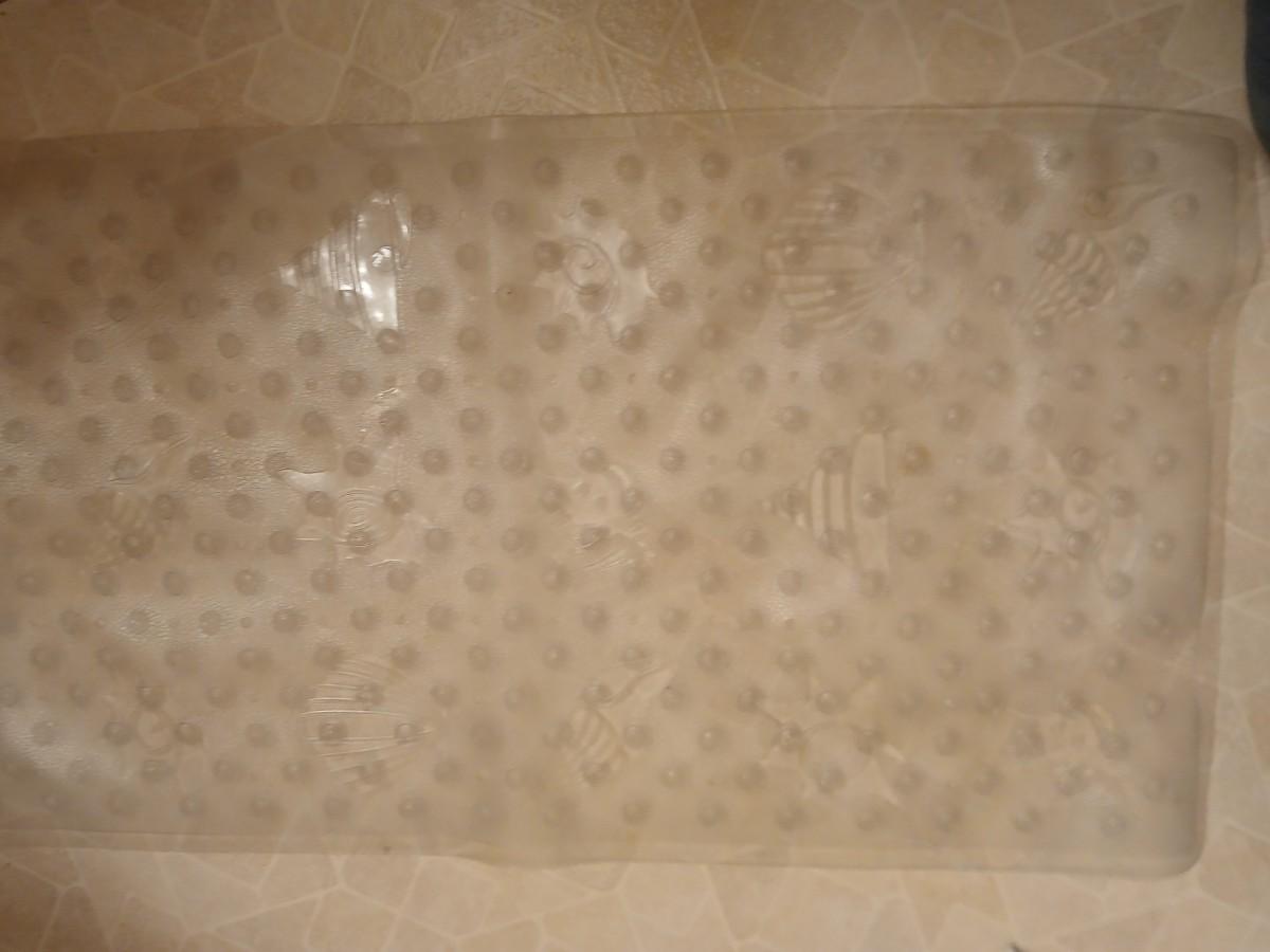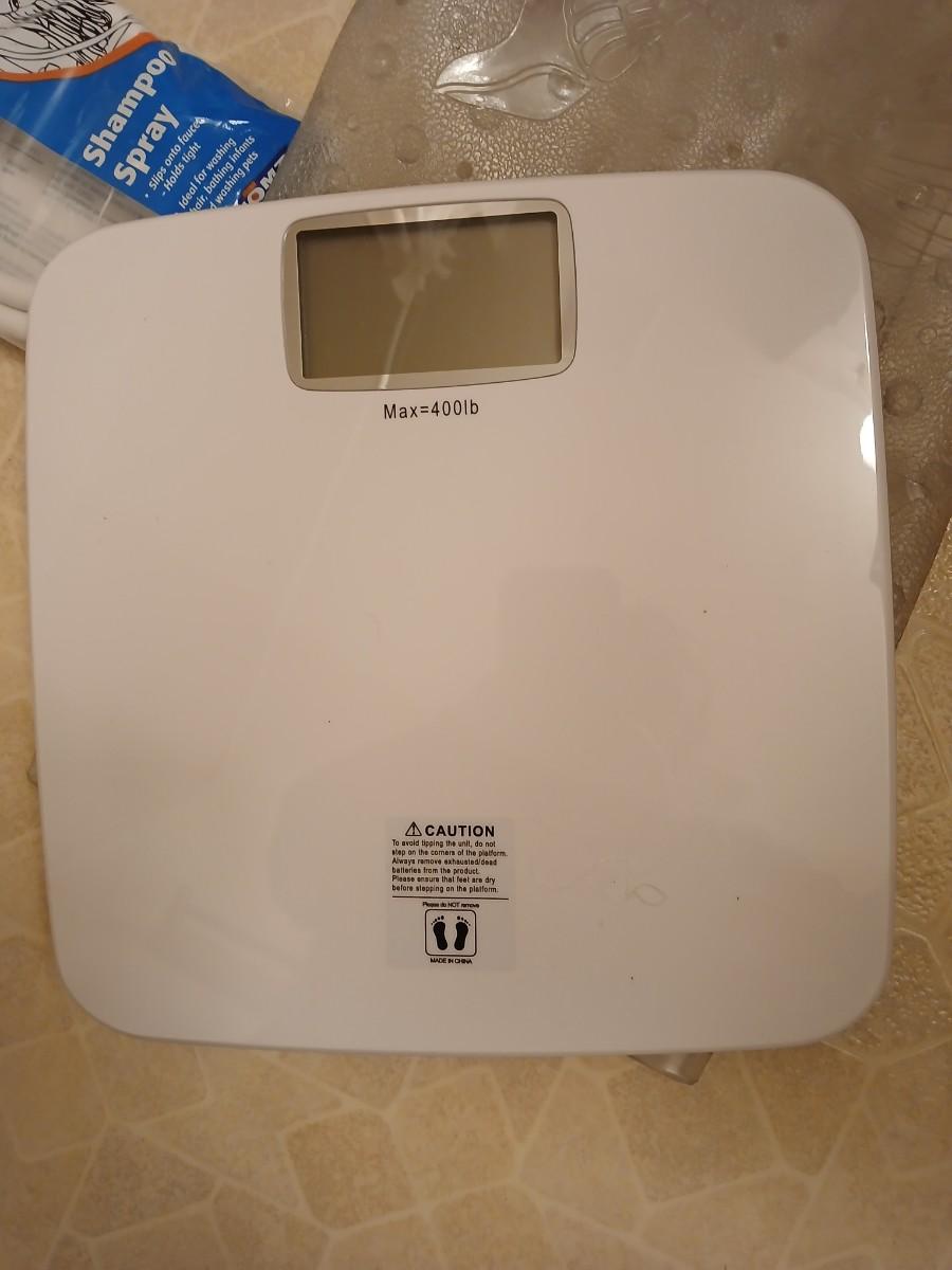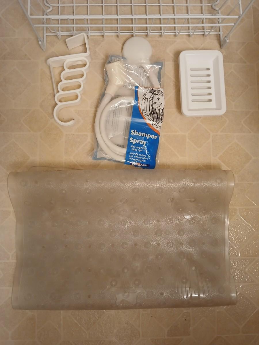 White organizing baskets Rubber tub mat Bathroom scale and other bathroom essentials
