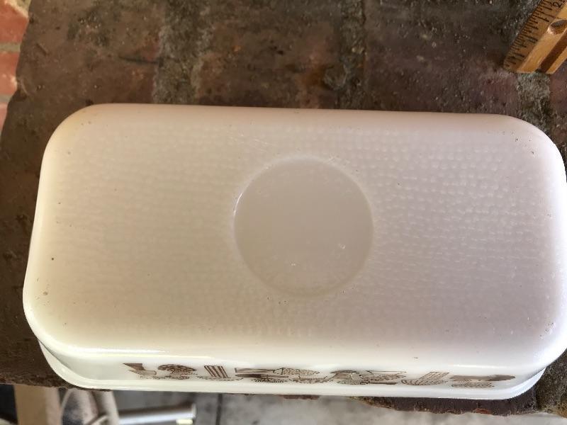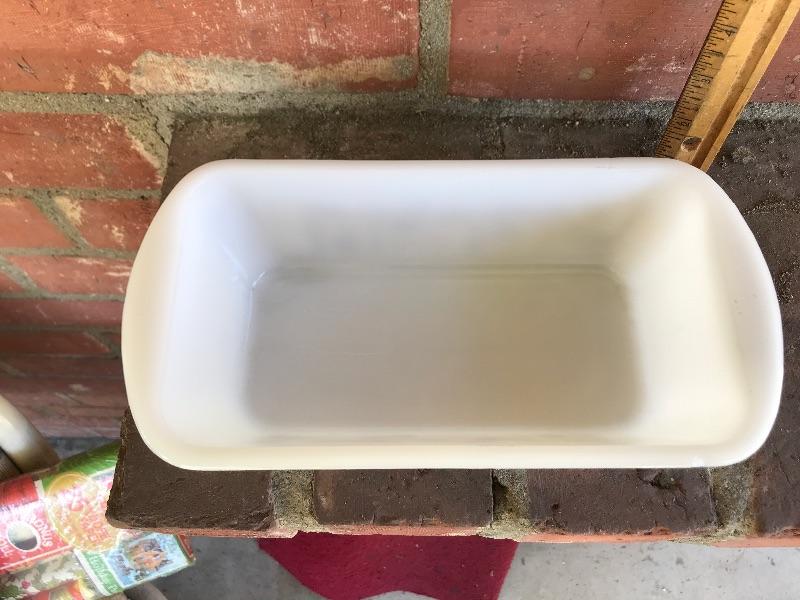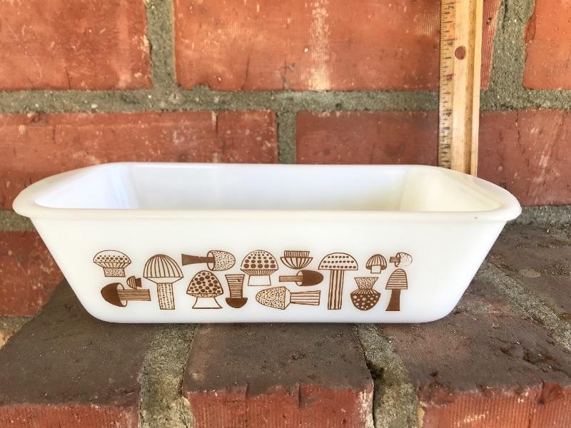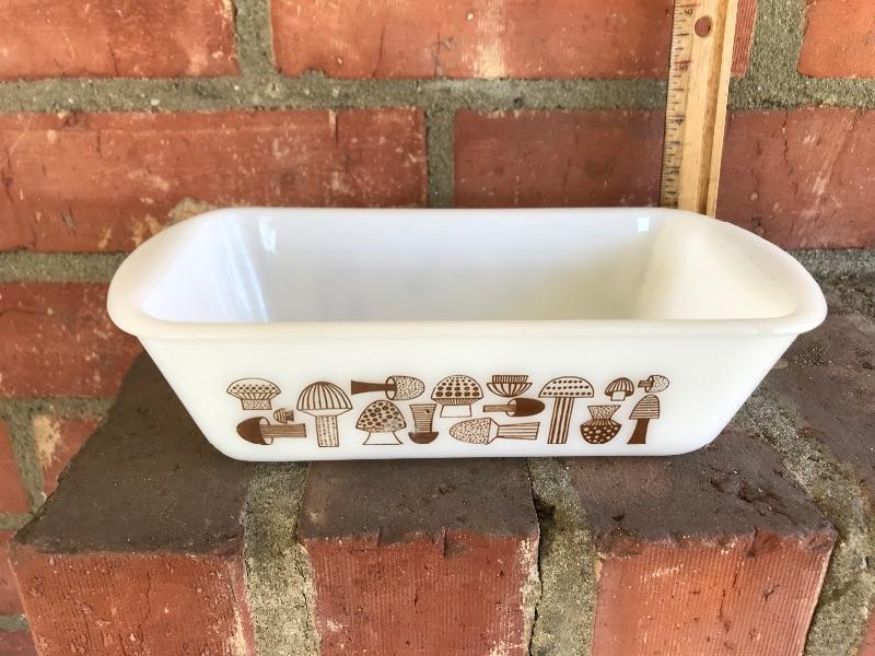 Vintage Ovenware bread pan. White glass with a brown mushroom pattern.