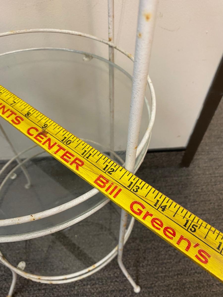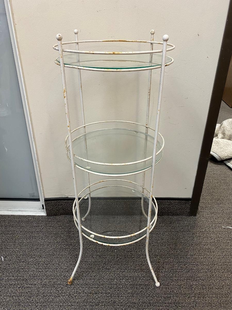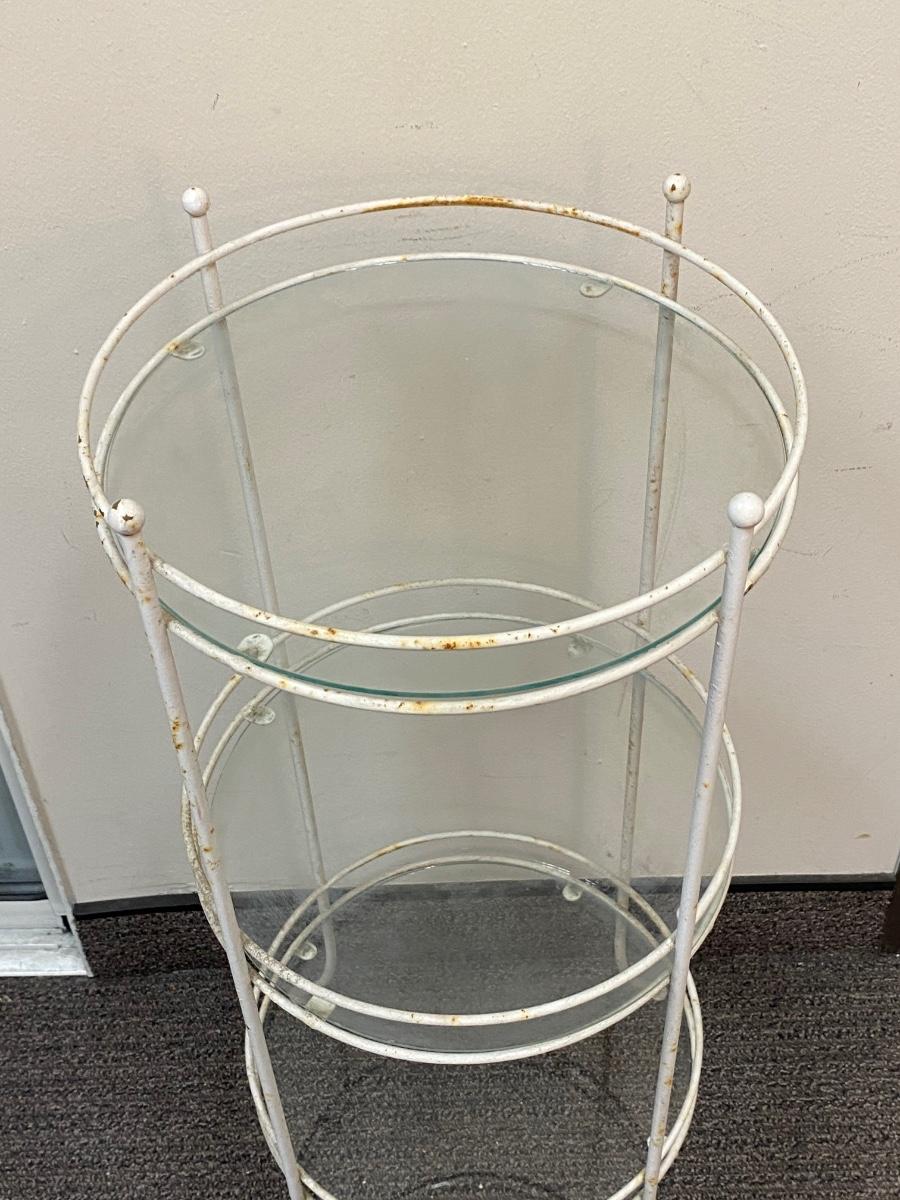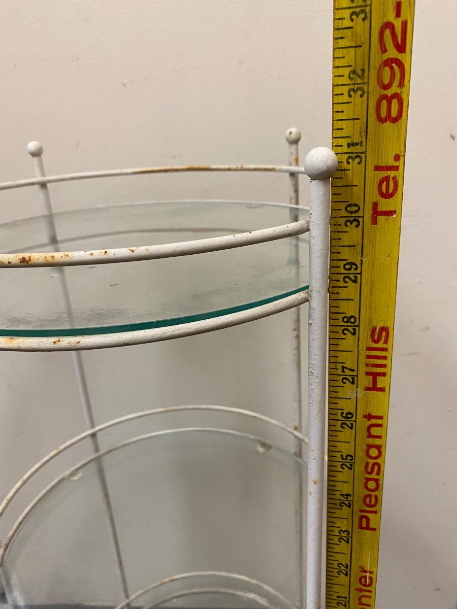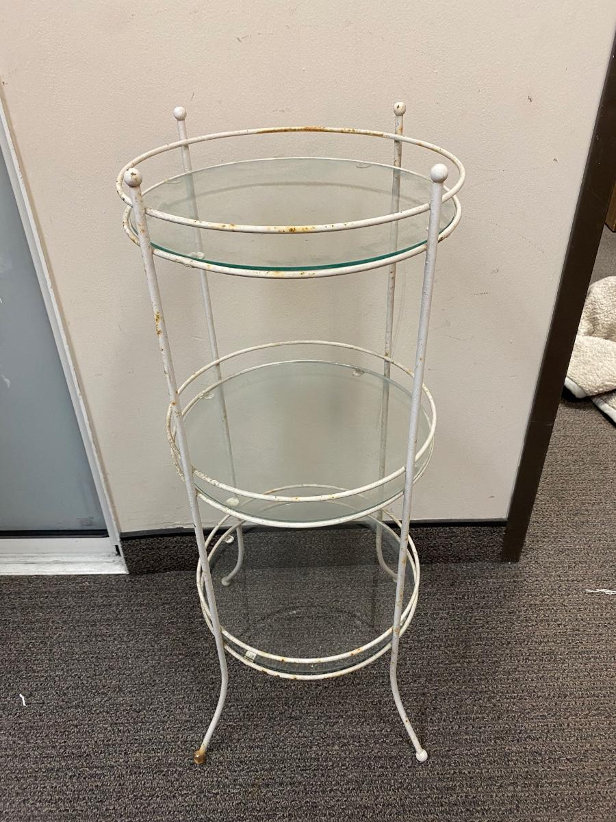 White Painted Metal & Glass Three Tier Side Patio Plant Stand Table. Some signs of wear from outdoor use. Glass pieces are in good condition. Easy to repaint. About 31" tall and 13" diameter.