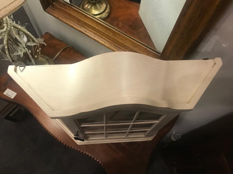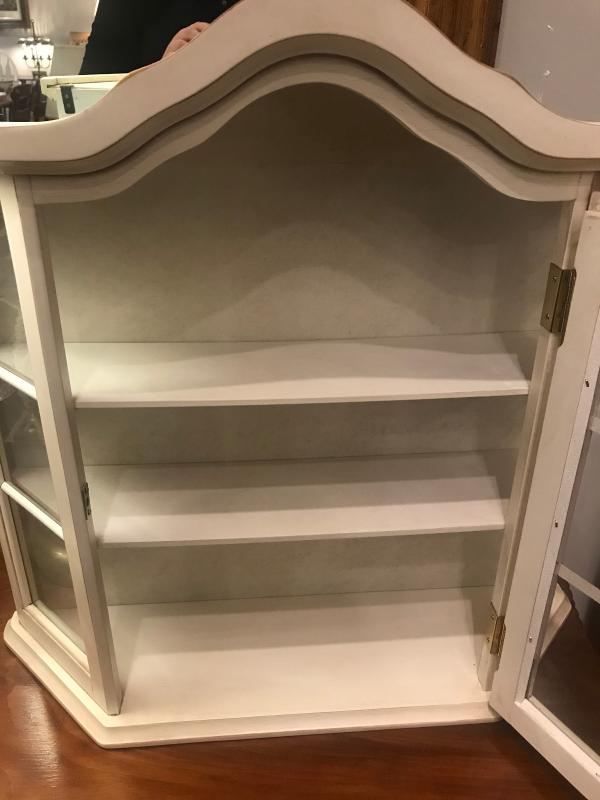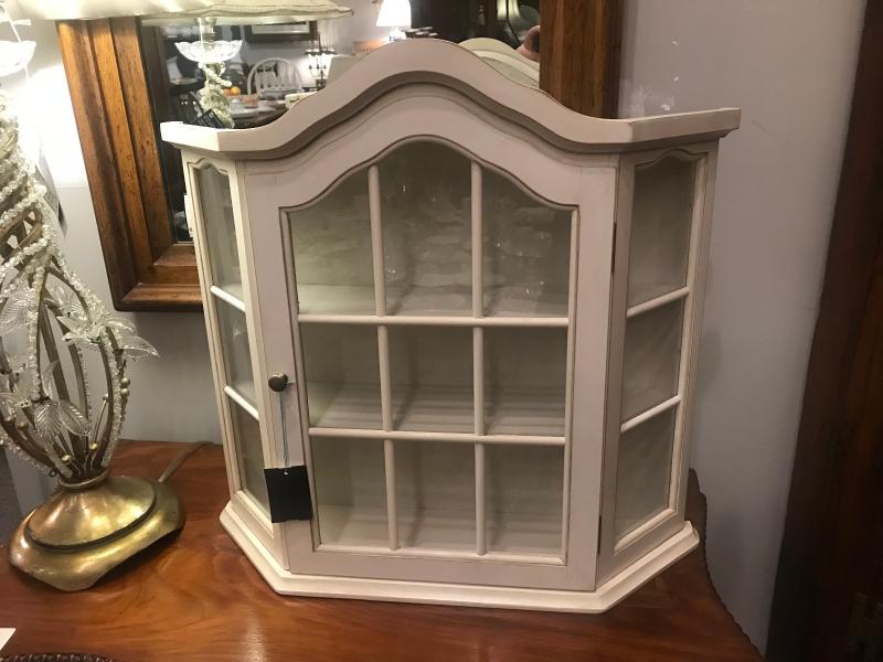 Very nice wall curio cabinet in a lovely soft distressed white painted finish. Divided glass front door and angled glass sides. Two interior shelves. Serpentine bonnet top. 22" x 6" x 21" H