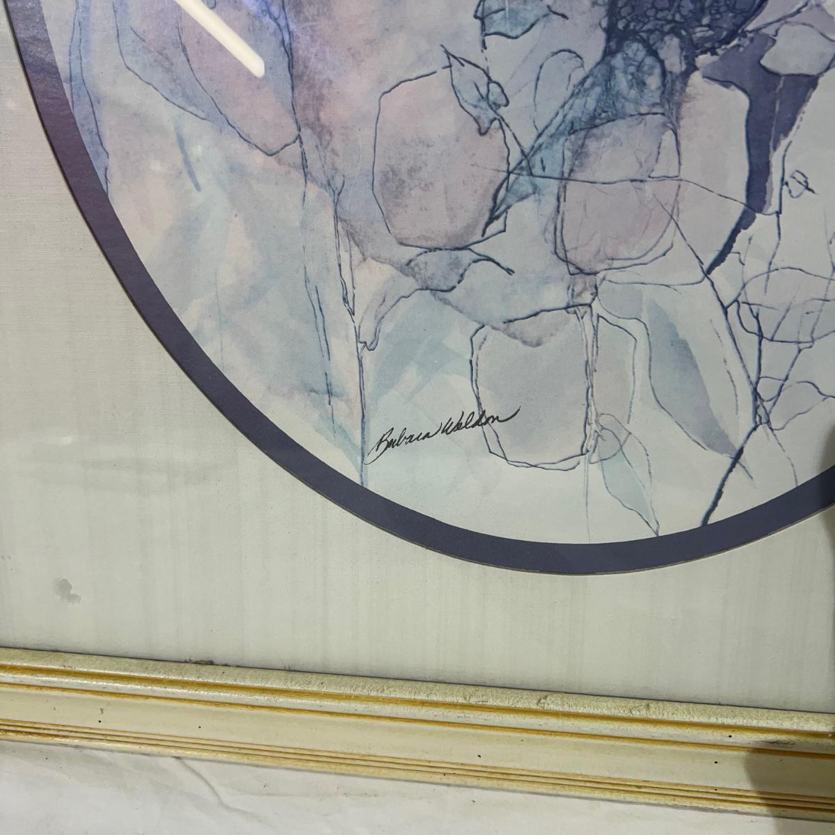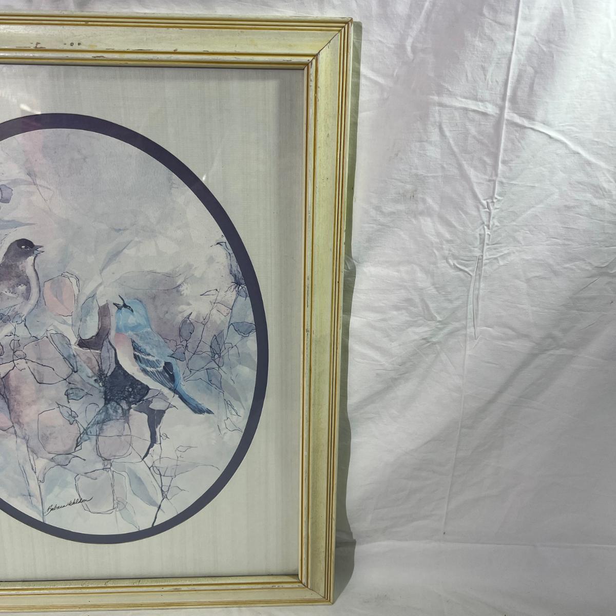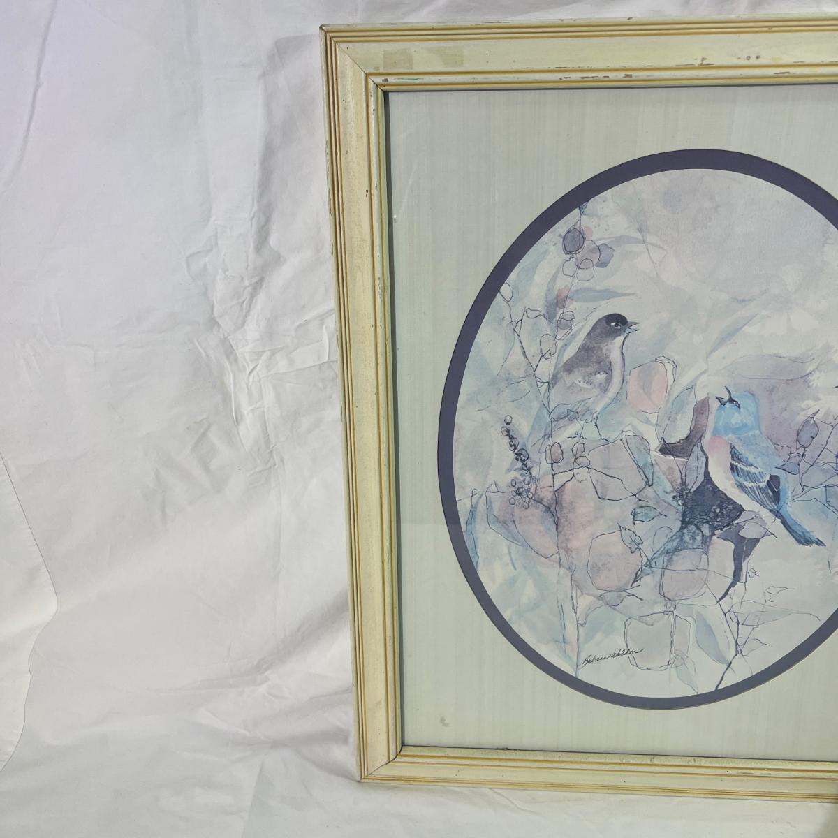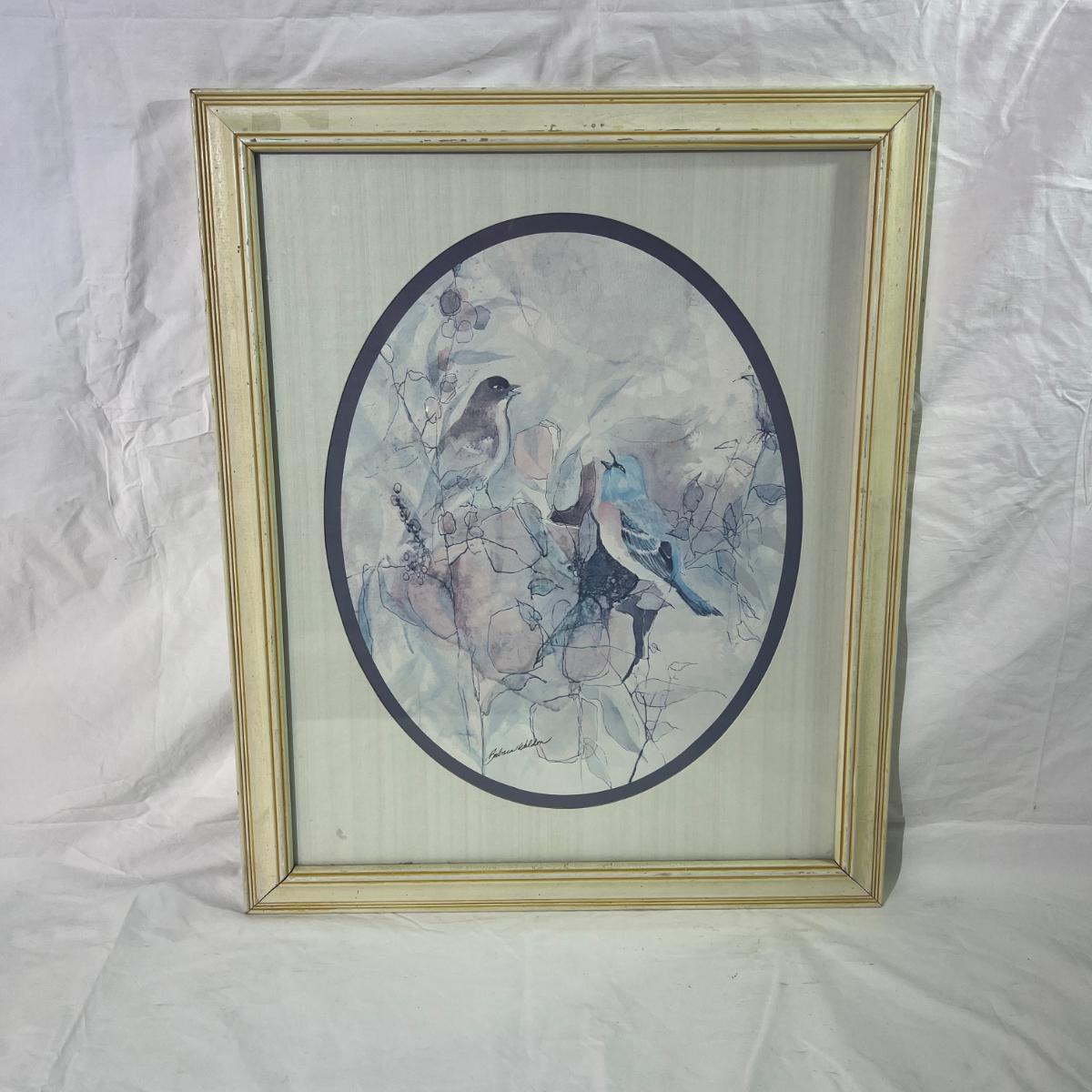 White Painted Wood Frame with Watercolor style art of Blue Birds, signed artist at the bottom, dimensions 18 1/2" x 22 1/2"