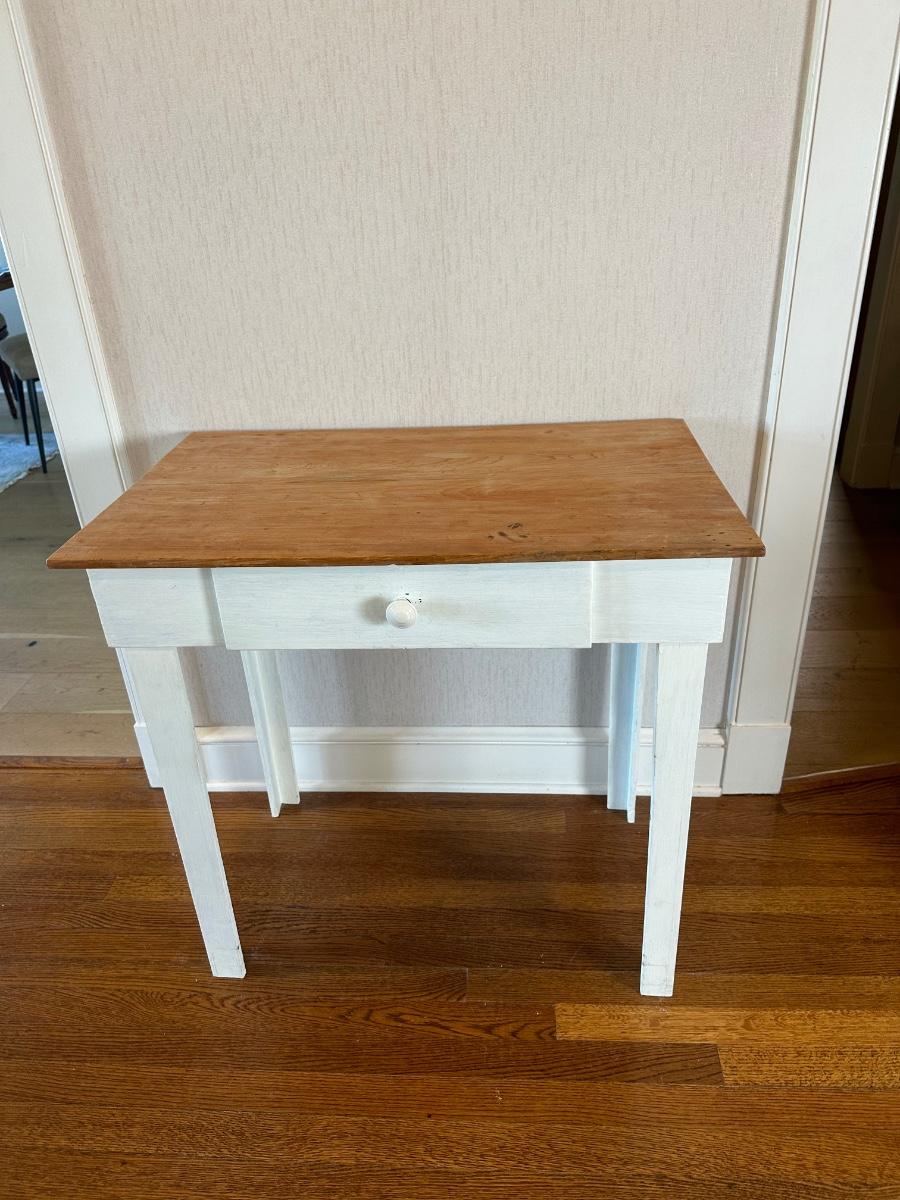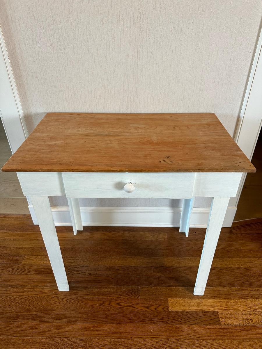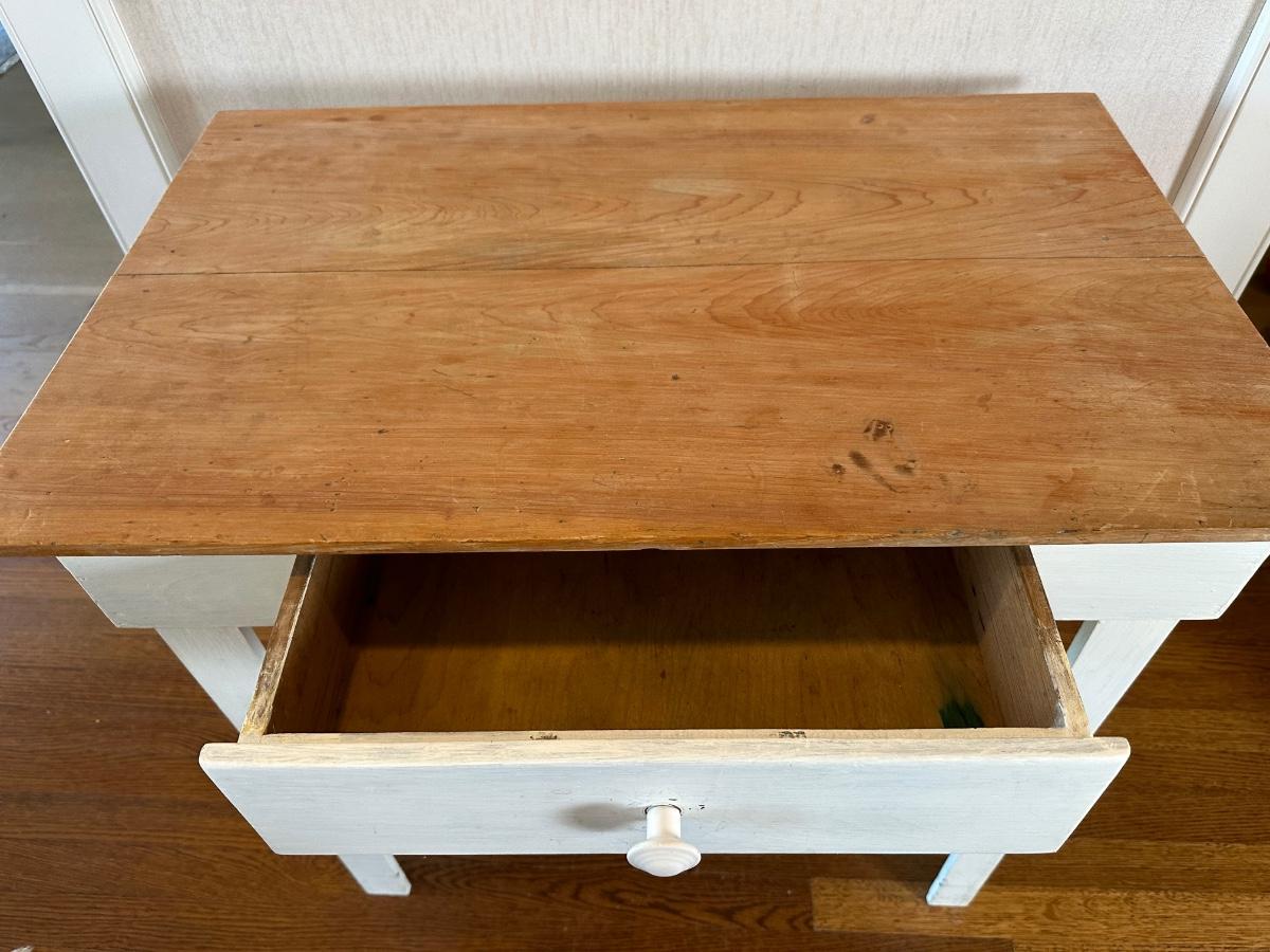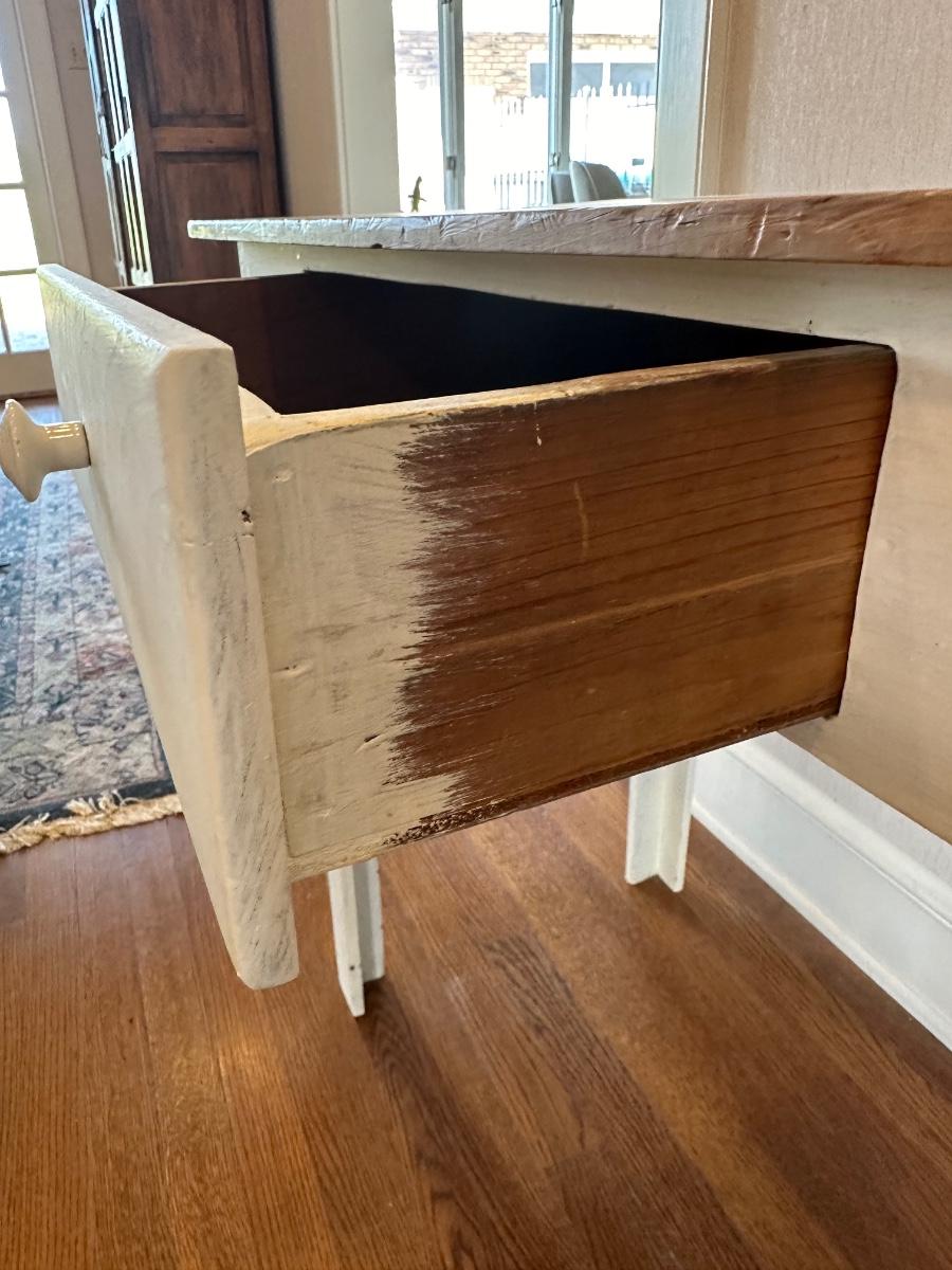 This piece has been painted white and the top is raw wood. Dovetail drawers.