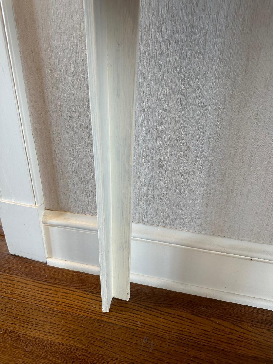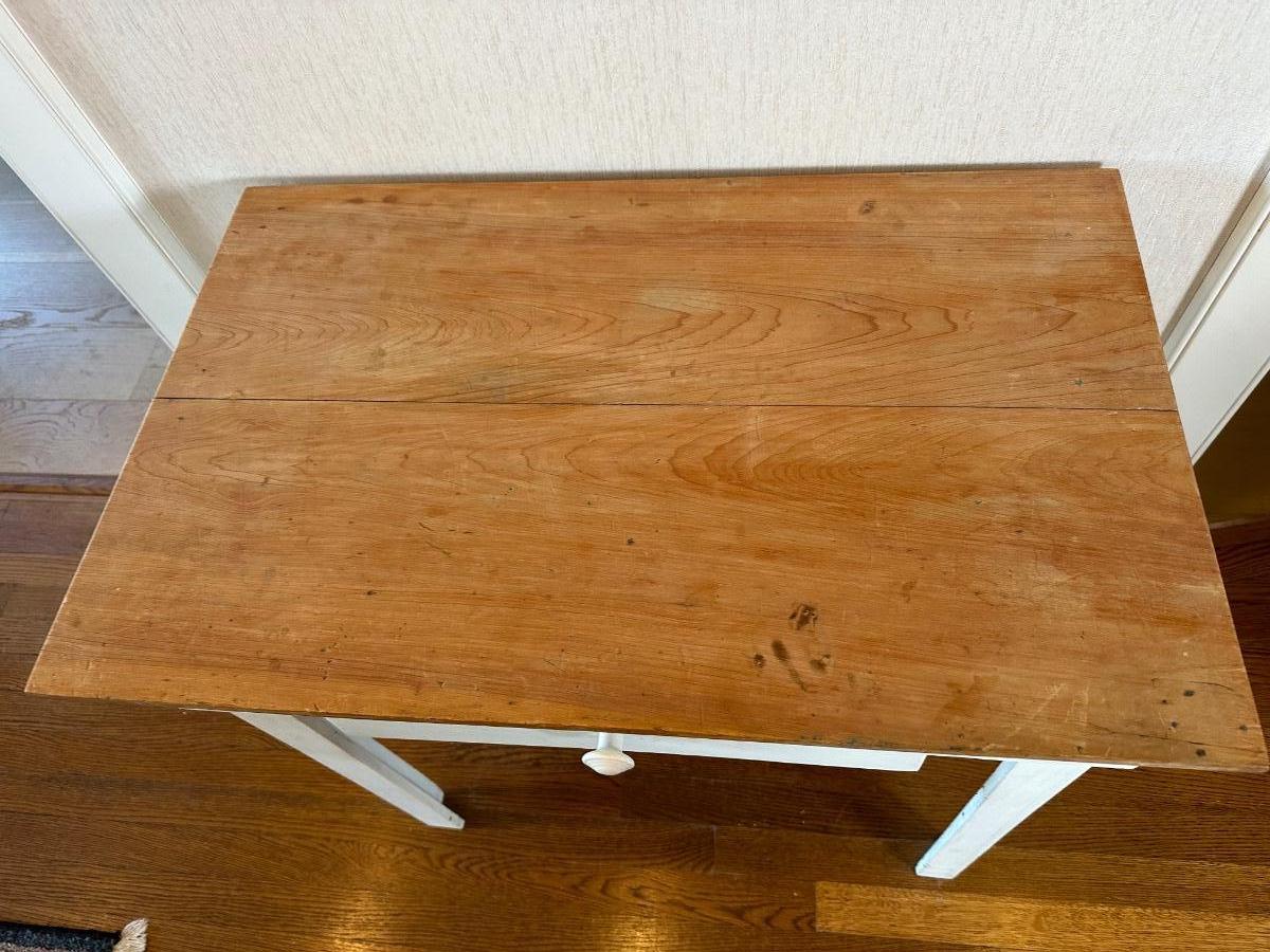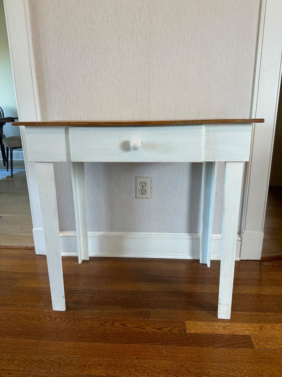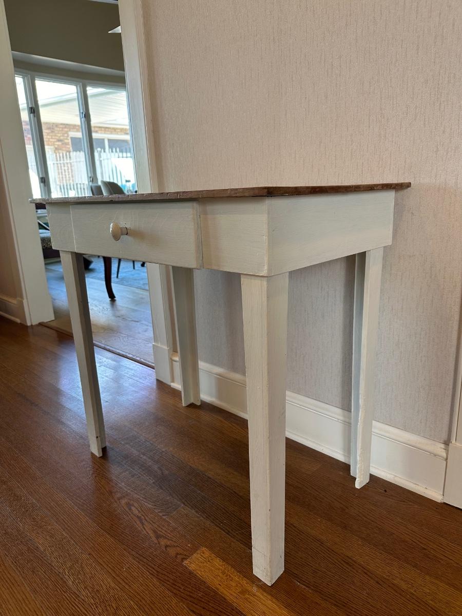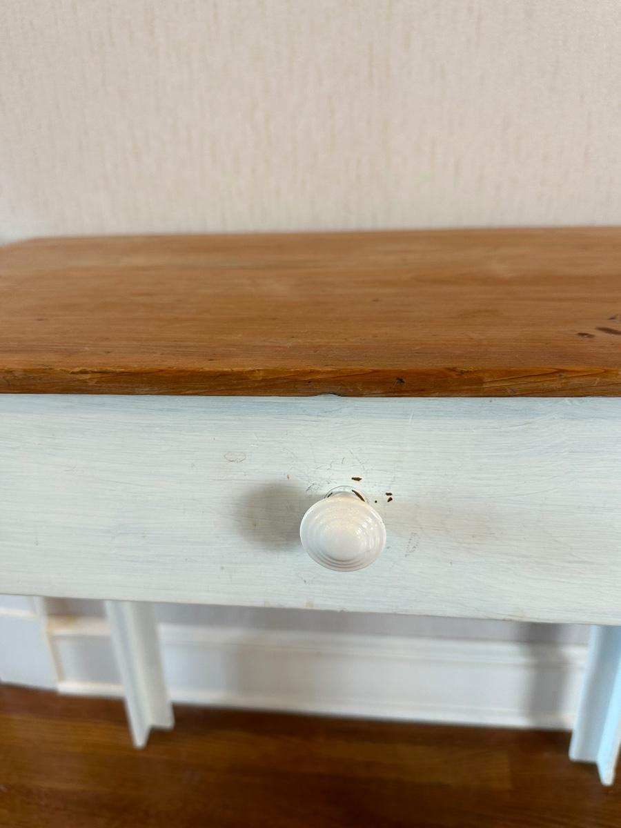 This piece has been painted white and the top is raw wood. Dovetail drawers.