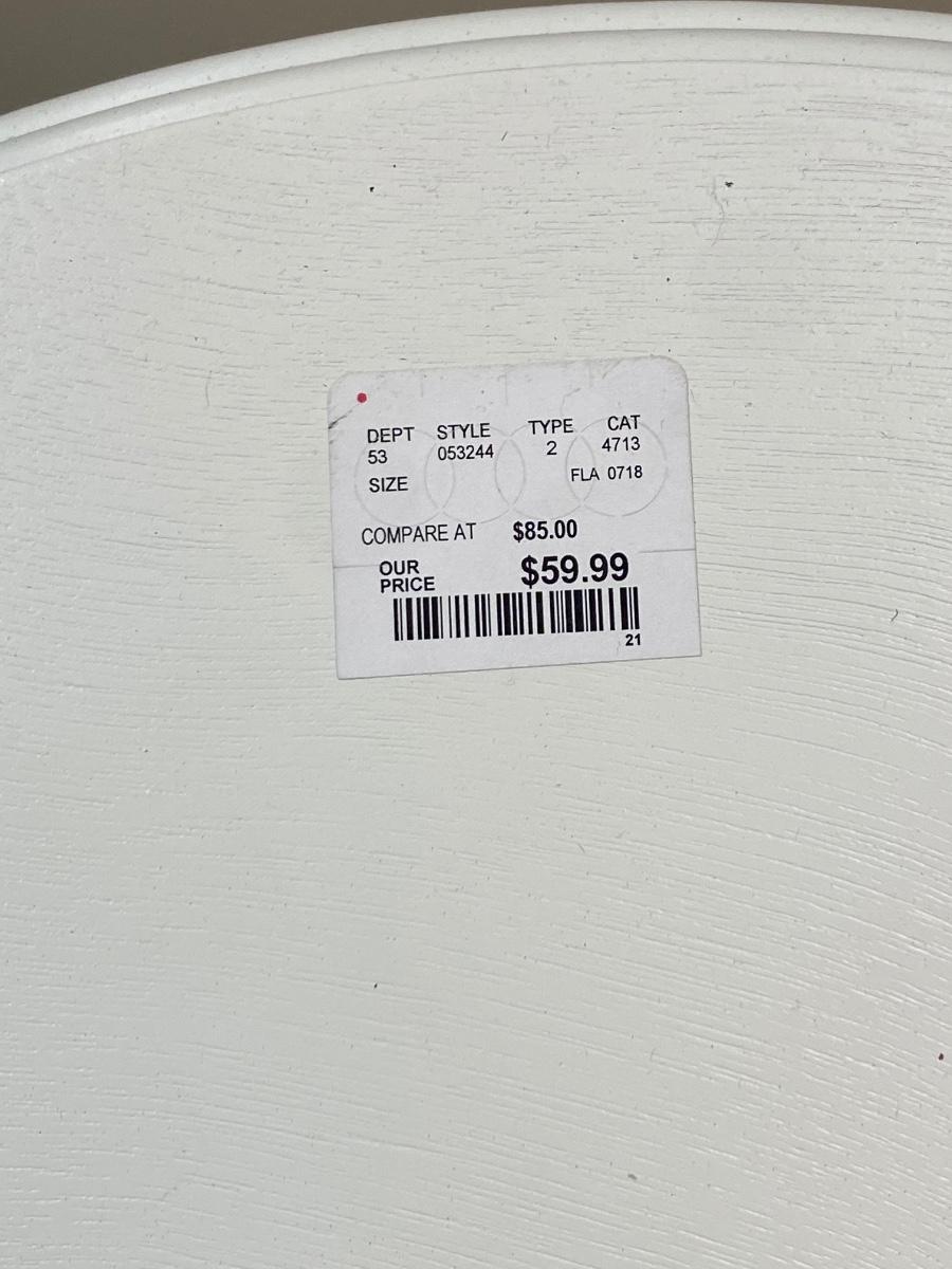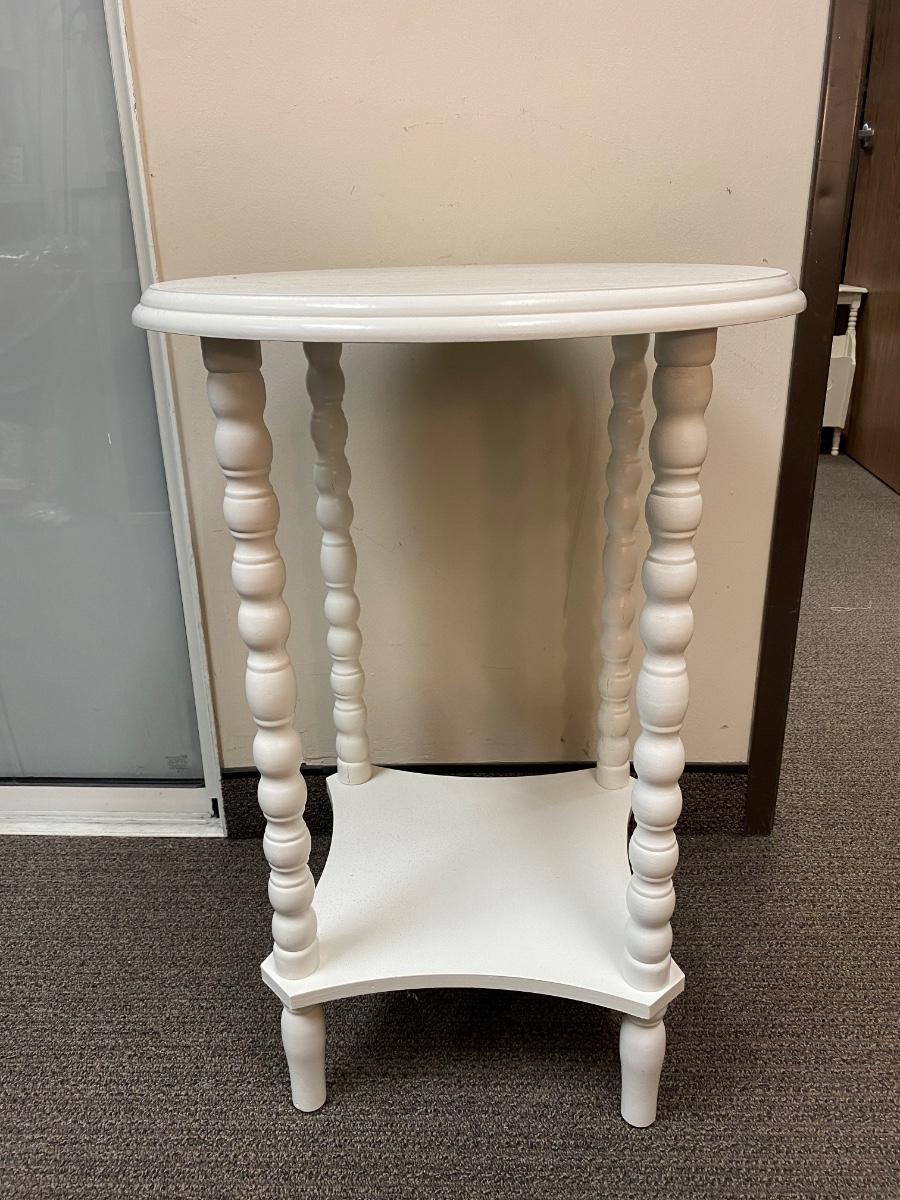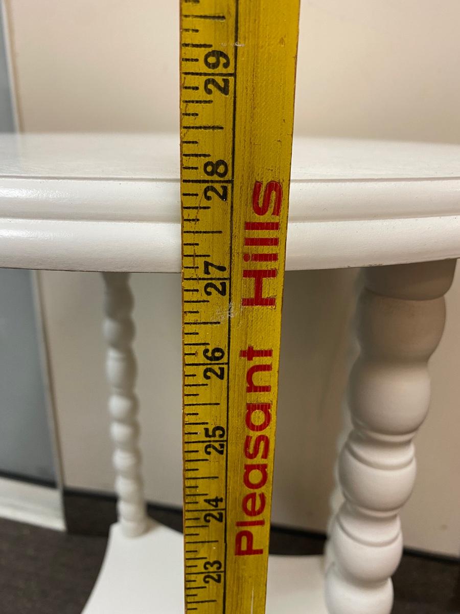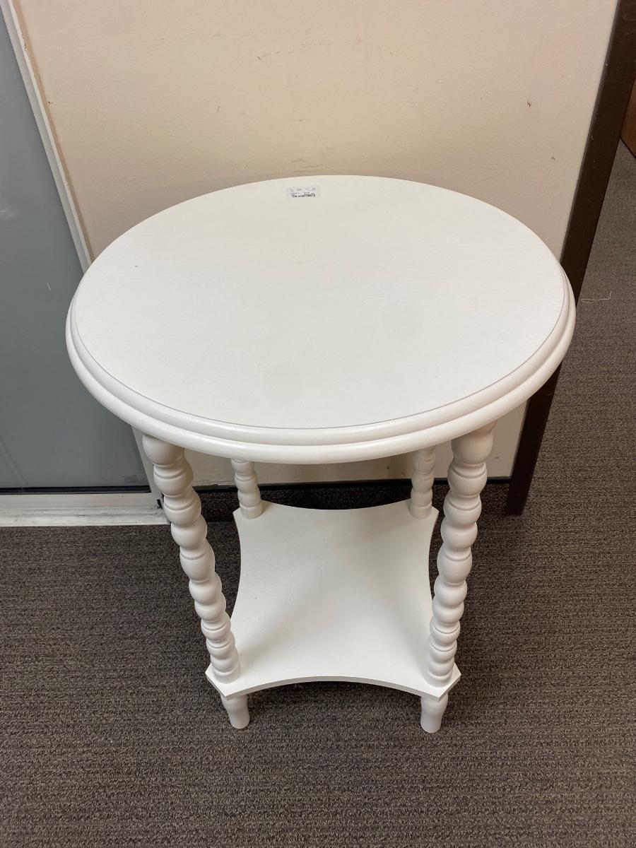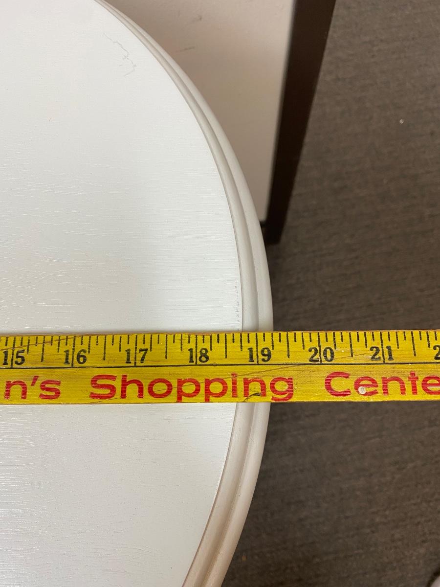 White Painted Wood Round Side End Table. In good condition. Previous owner had it covered with table cloth. 28” tall and 19.5” wide.