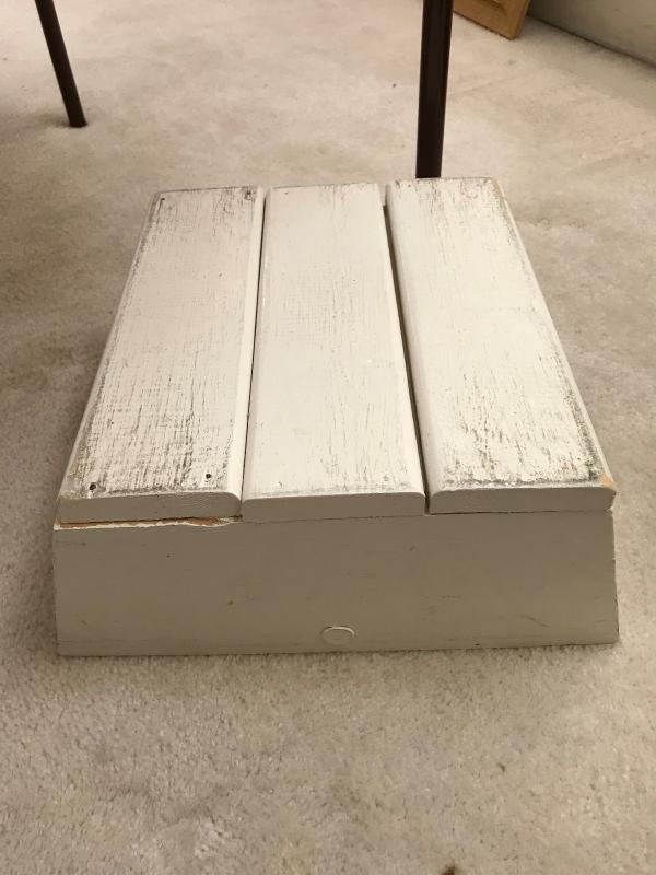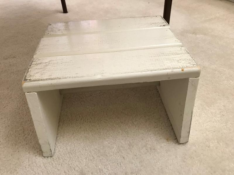 Vintage white painted wood step stool. Plank top, Tapered wood sides. Dowel stretcher. 14" x 12" x 6" H