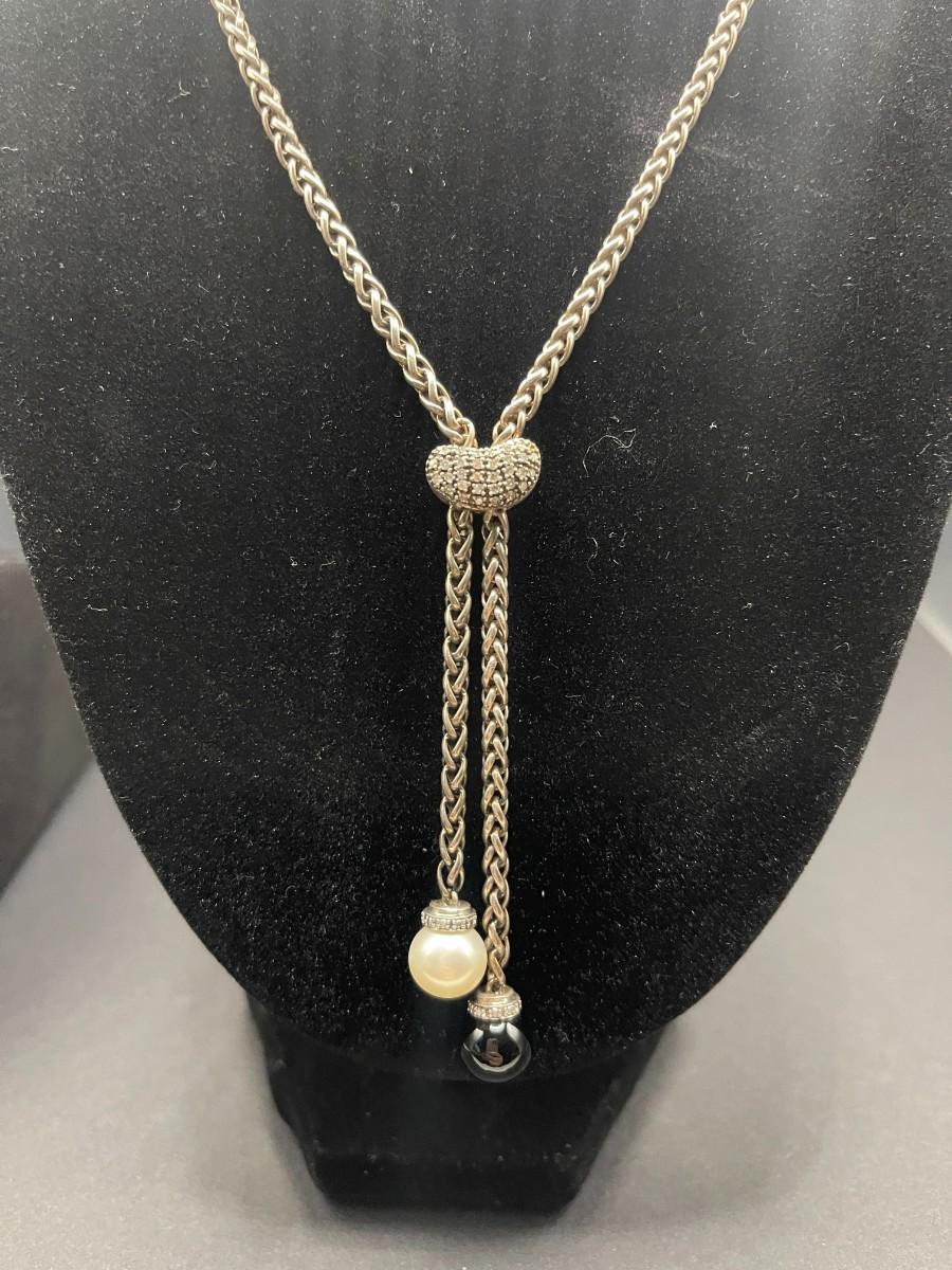 White Pearl and Black Onyx Sterling Silver Drop Necklace with Diamonds. 17.5". The necklace is in poor condition having had its chain replaced and the seperator soldered shut.