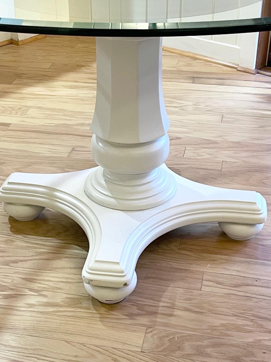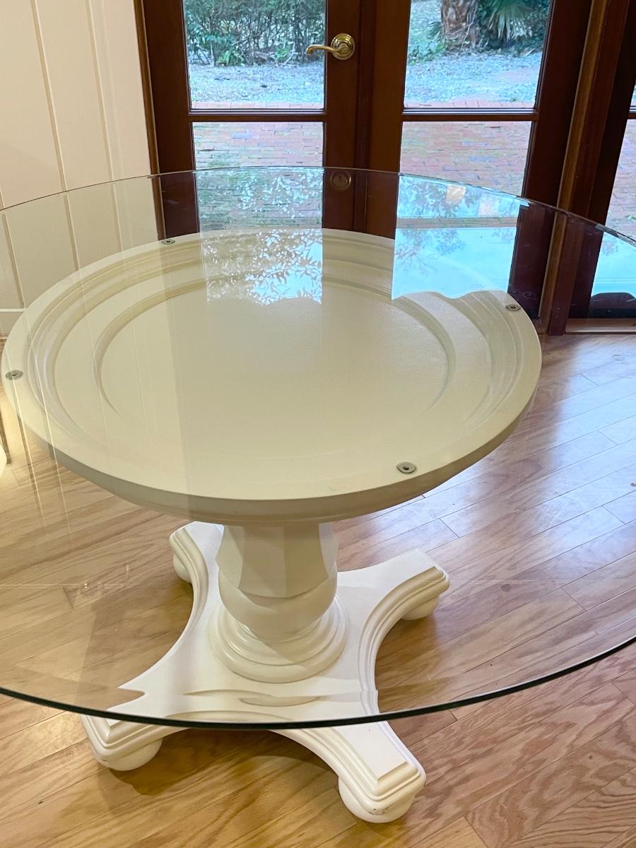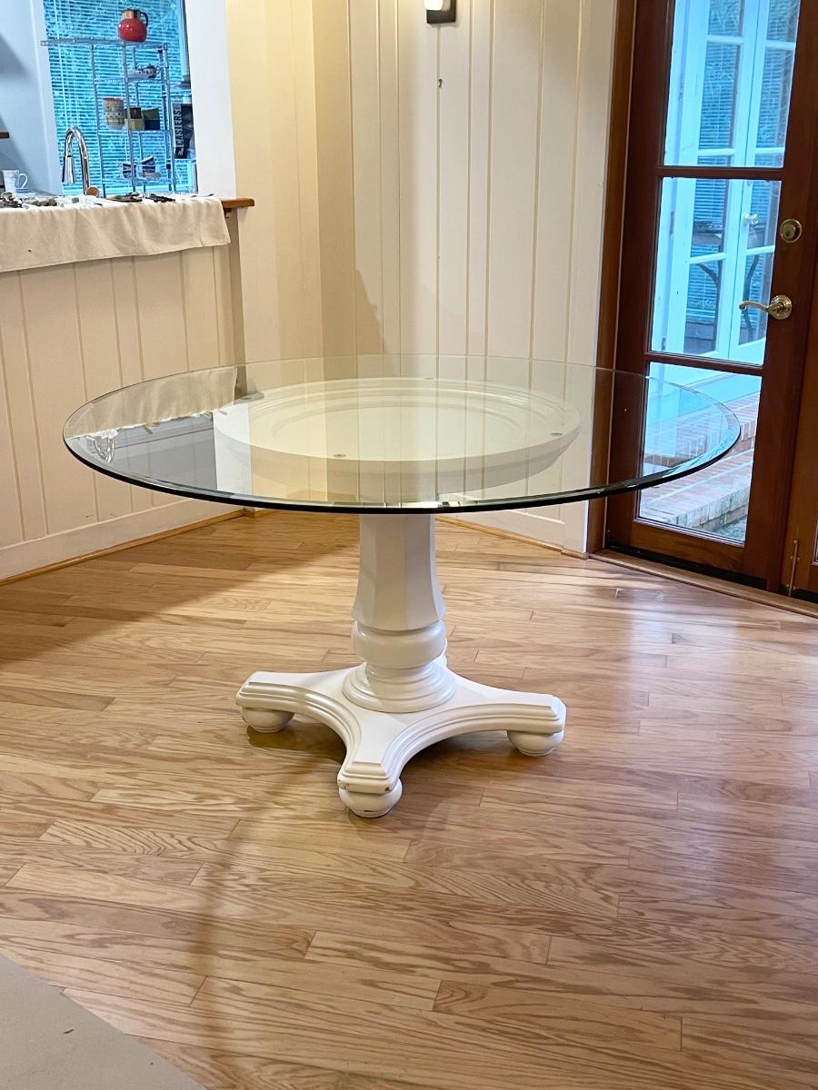 54” Round Beveled Glass Top. 30” H. Very Minor surface scratches.