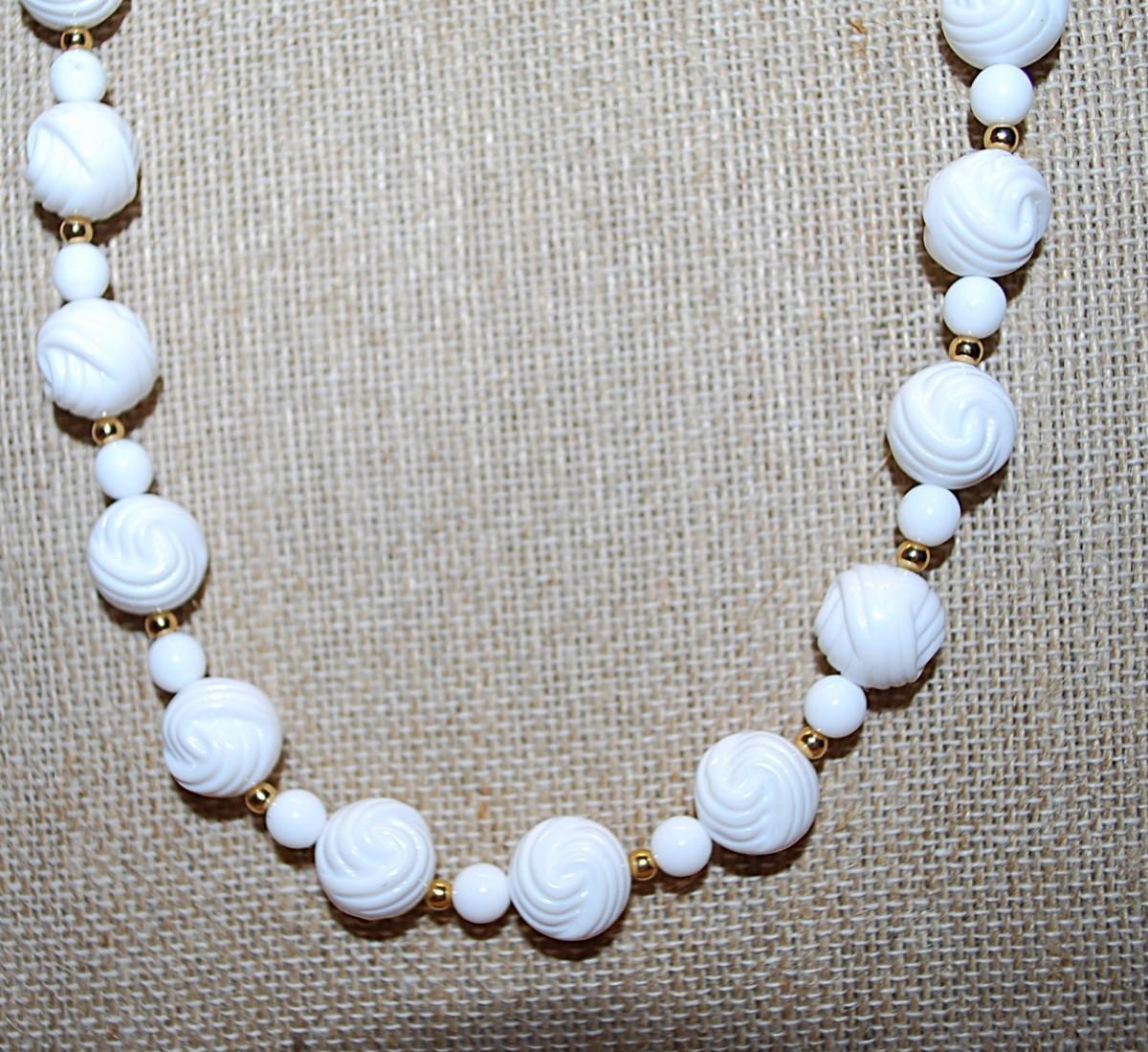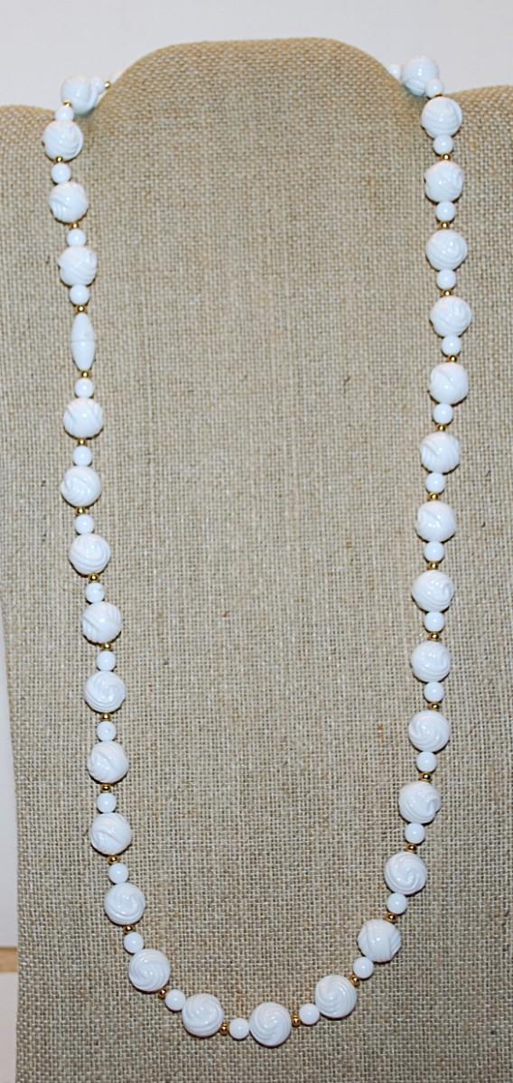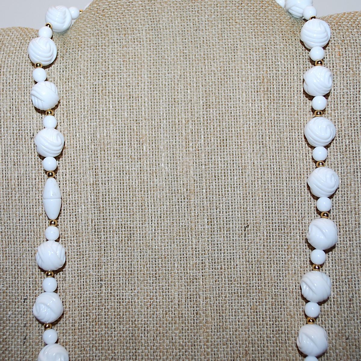 White Plastic Beaded NECKLACE with Small Gold Colored Globe Dividers 26" L