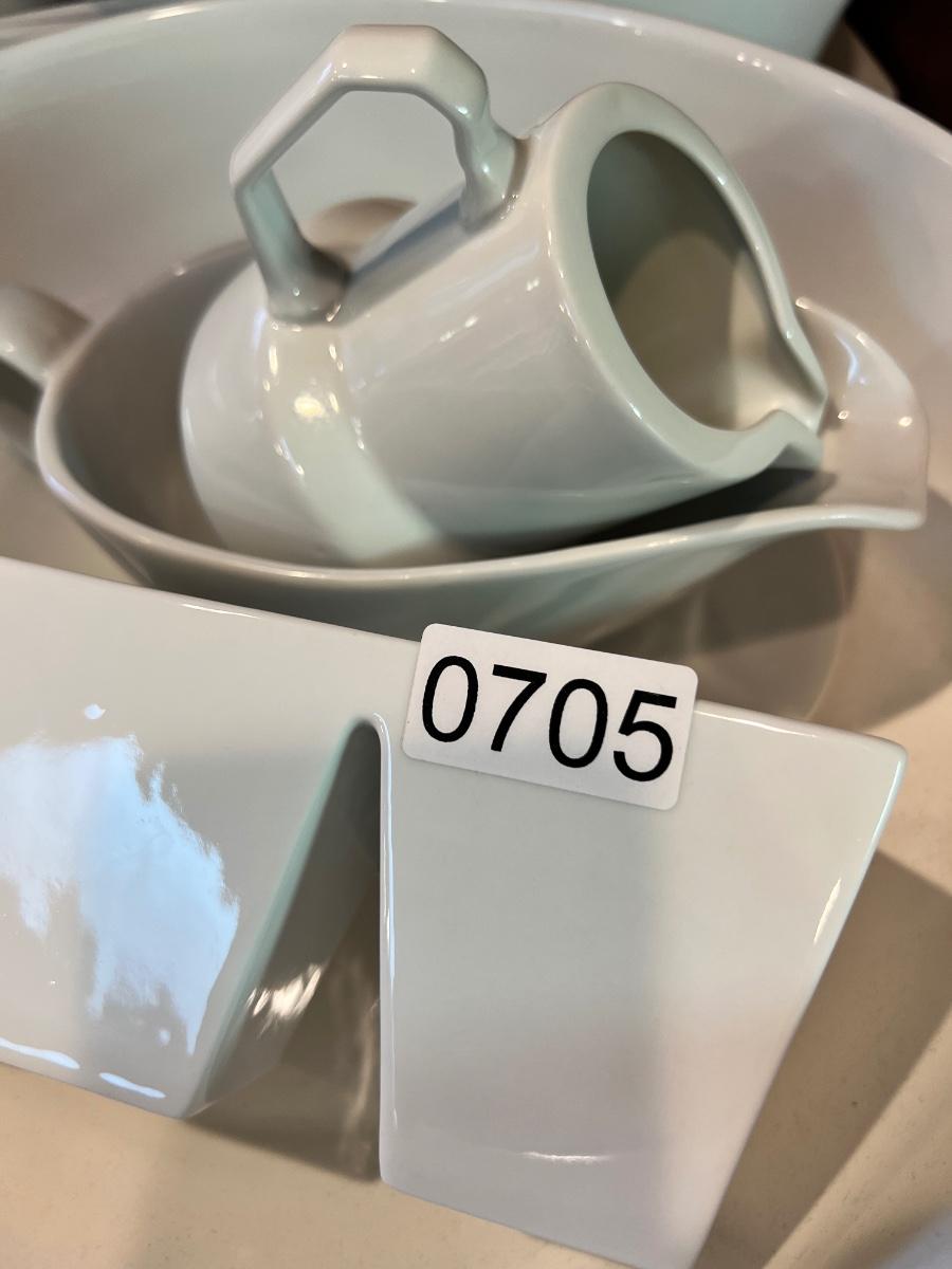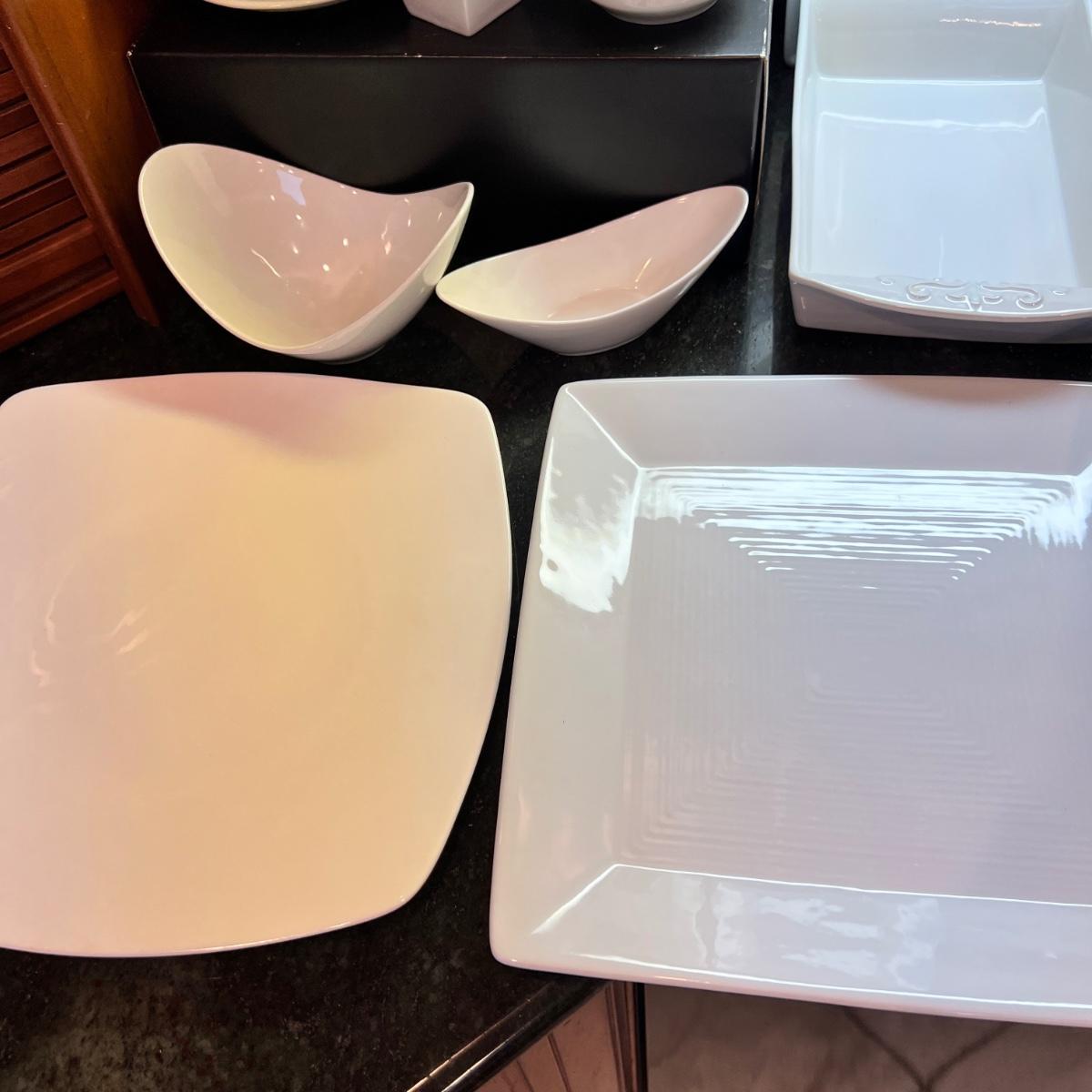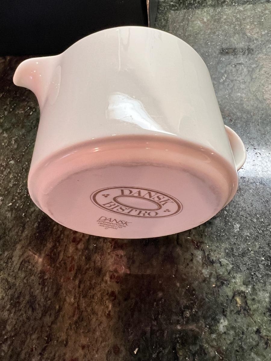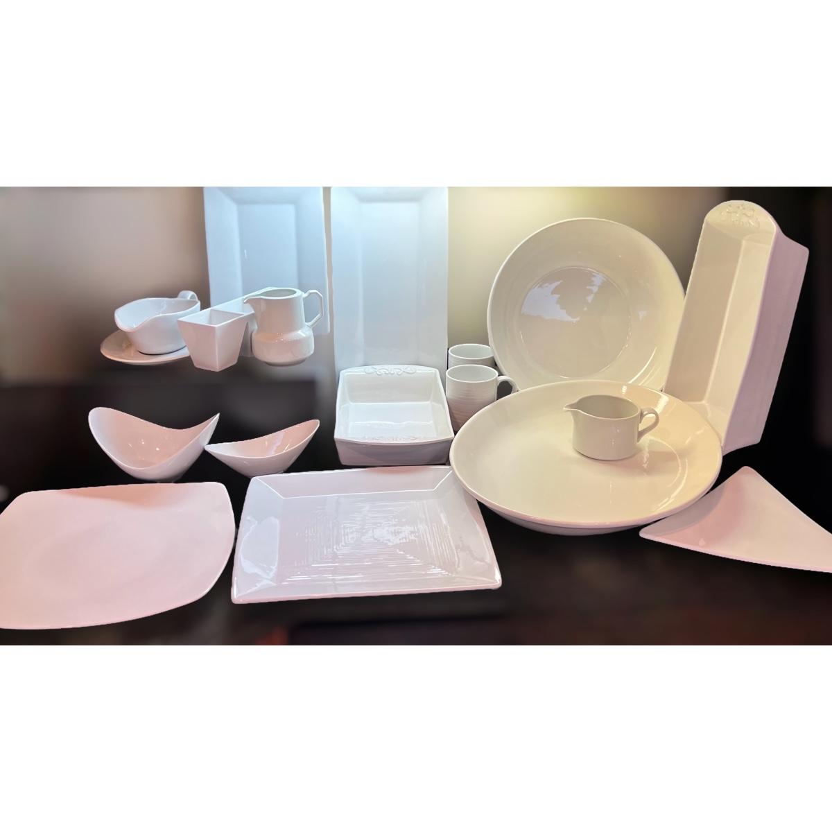 Great mixed lot of dinnerware and cookware, some designer. Sant' Andrea Royal Porcelain, Dansk Bistro, Fusion, Portuguese Mixcer, Syracuse Bone China, Vertex China, Dudson triangle plate.