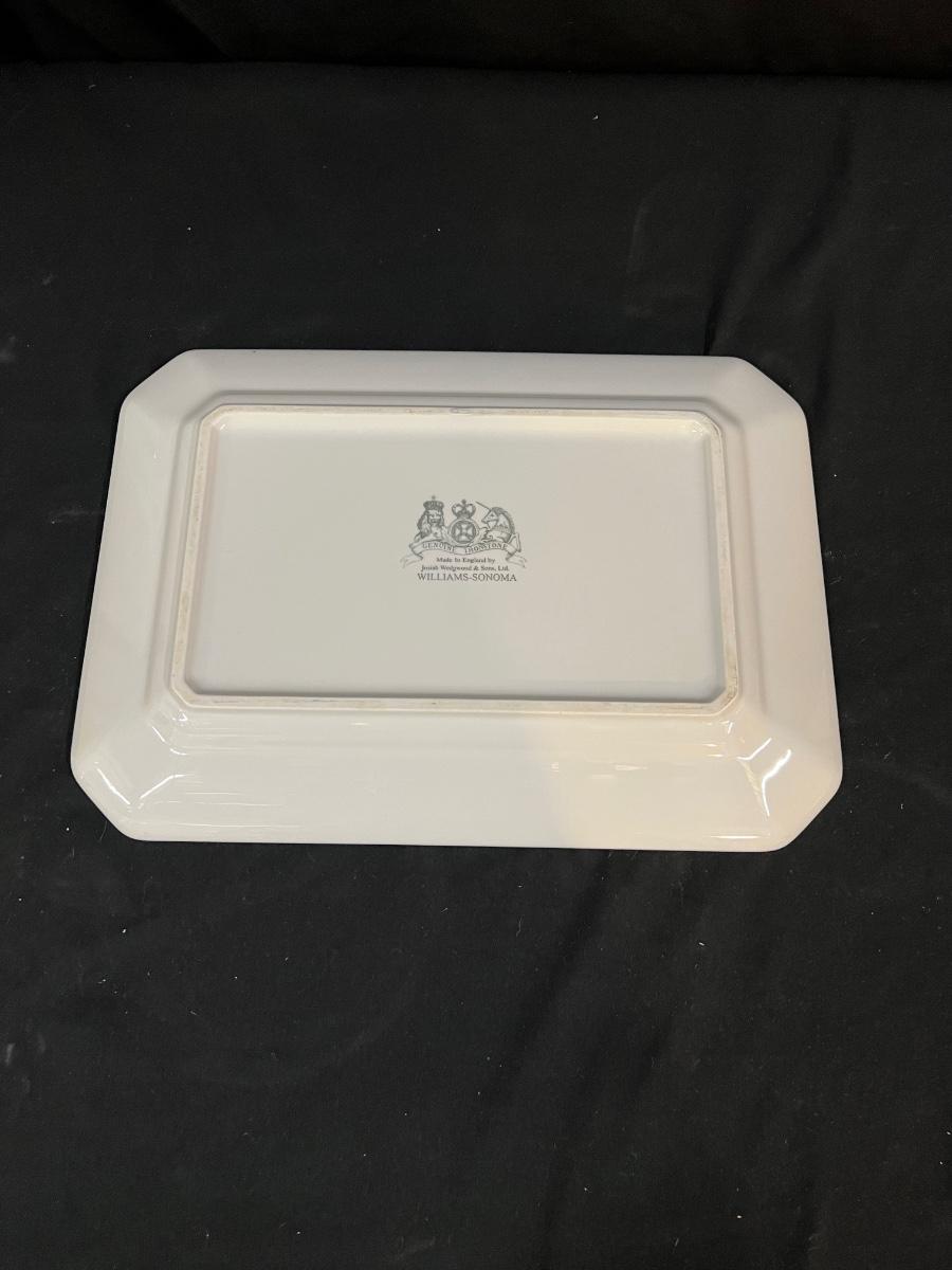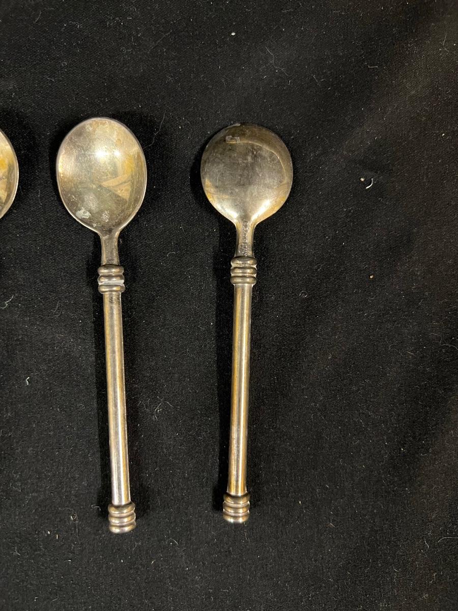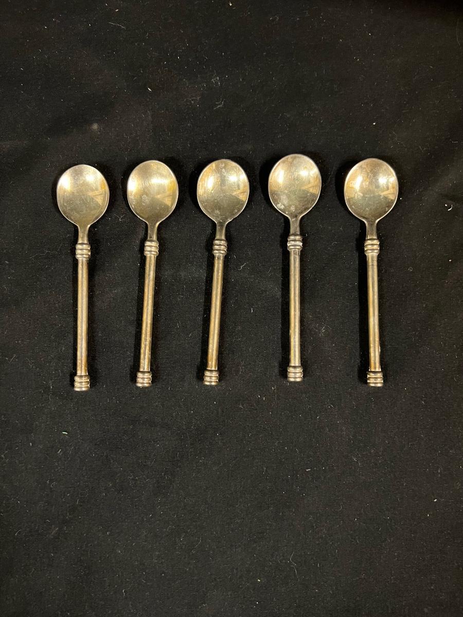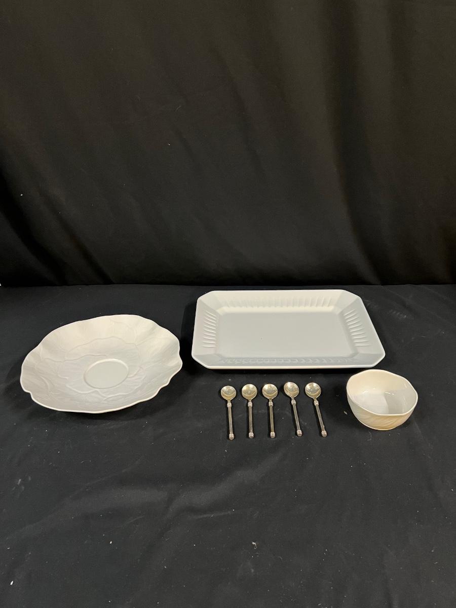 Three pieces of white china that includes a plate from Williams Sonoma Wedgwood, are accompanied by a set of five silver spoons marked - EP ZINK ITALY. All china is in amazing shape, spoons are a bit dirty.