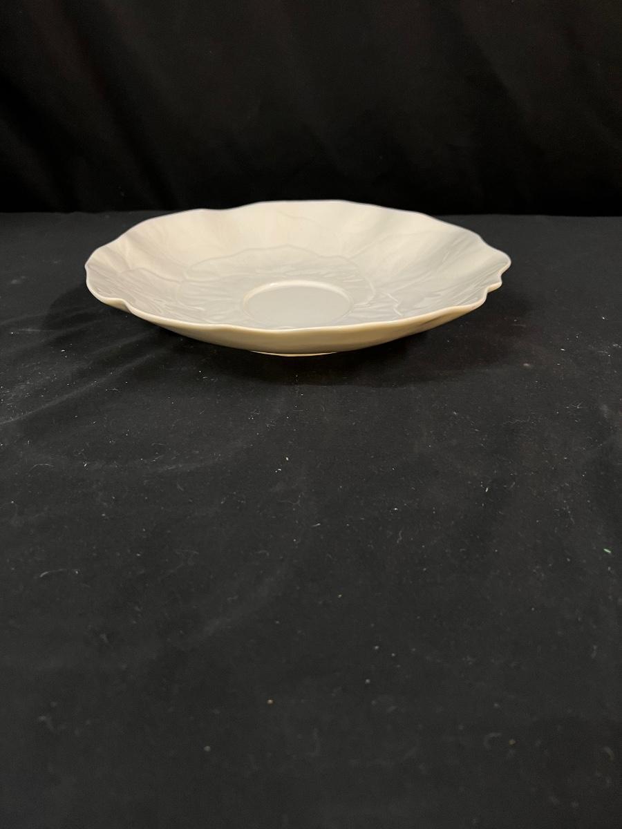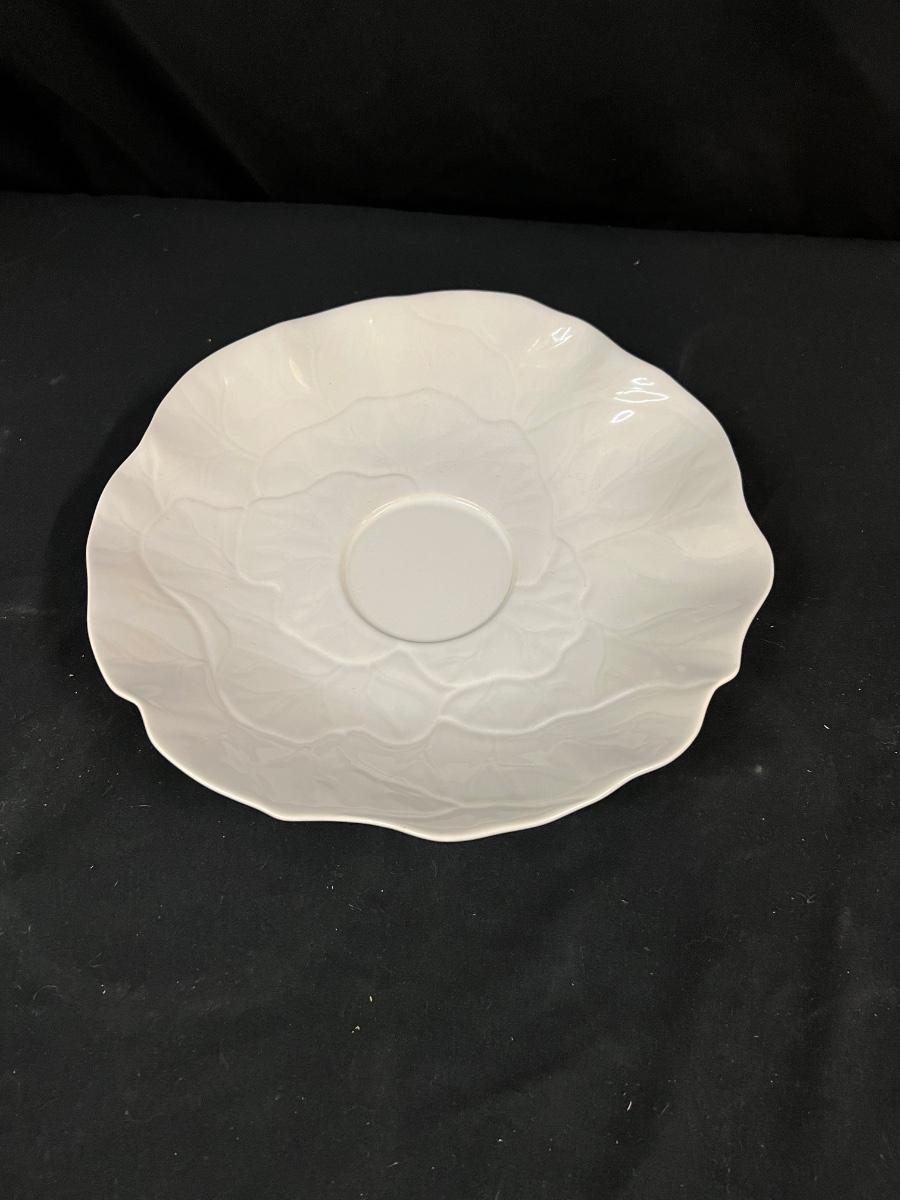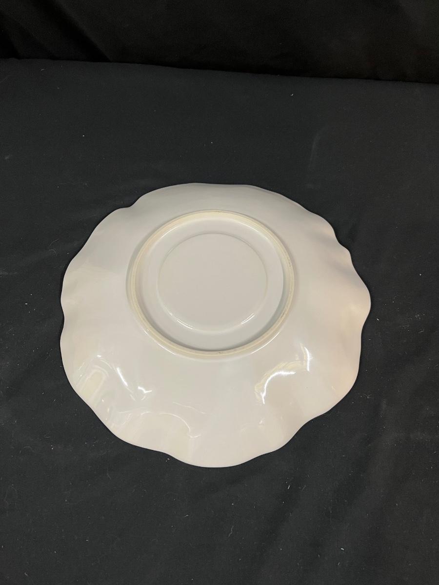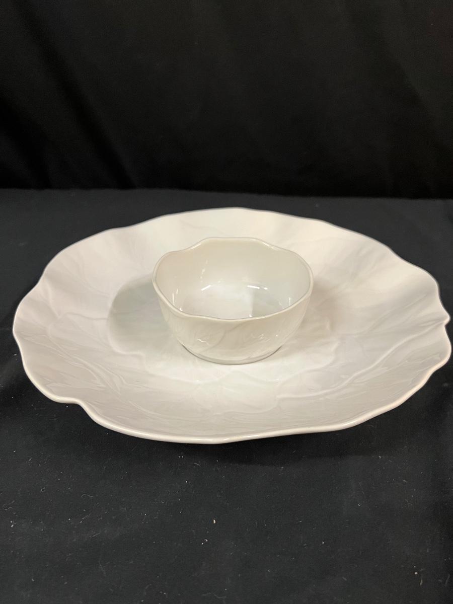 Three pieces of white china that includes a plate from Williams Sonoma Wedgwood, are accompanied by a set of five silver spoons marked - EP ZINK ITALY. All china is in amazing shape, spoons are a bit dirty.