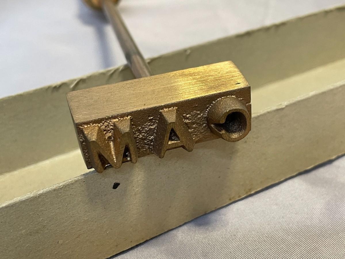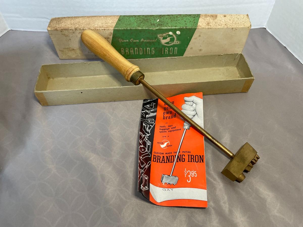 This branding iron will brand C A M into "tools, toys, luggage, and sports equipment". This one doesn't look like it was used and is about 12 inches long.