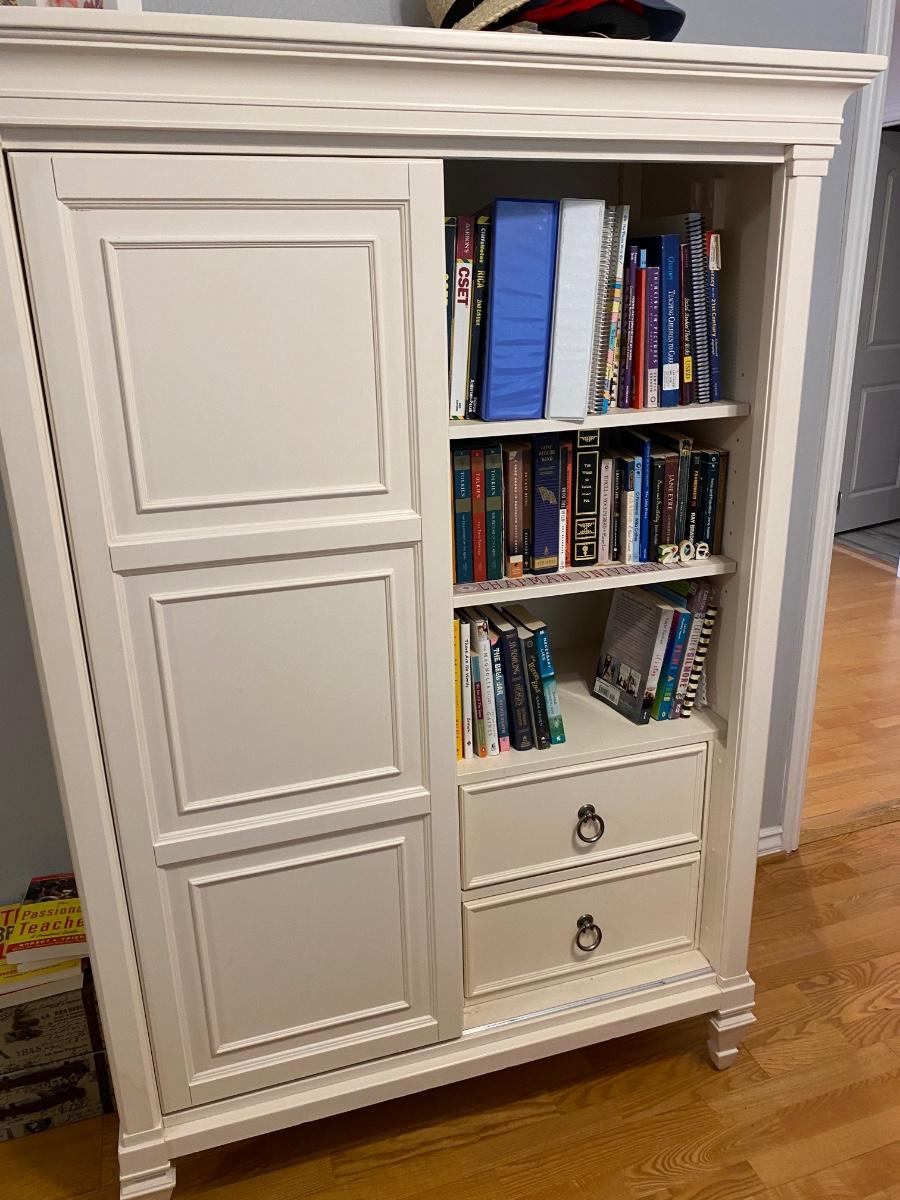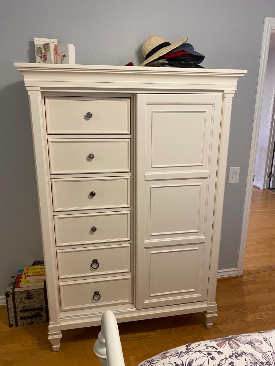 White tall dresser armoire with a rolling door front. Door rolls to the left to gain access to the open shelving. Six drawers on one side, two adjustable shelves and two more drawers on other side. Tall, about 66". 45" wise and 22" deep. In good condition. Does not include any other items in or on dresser.
