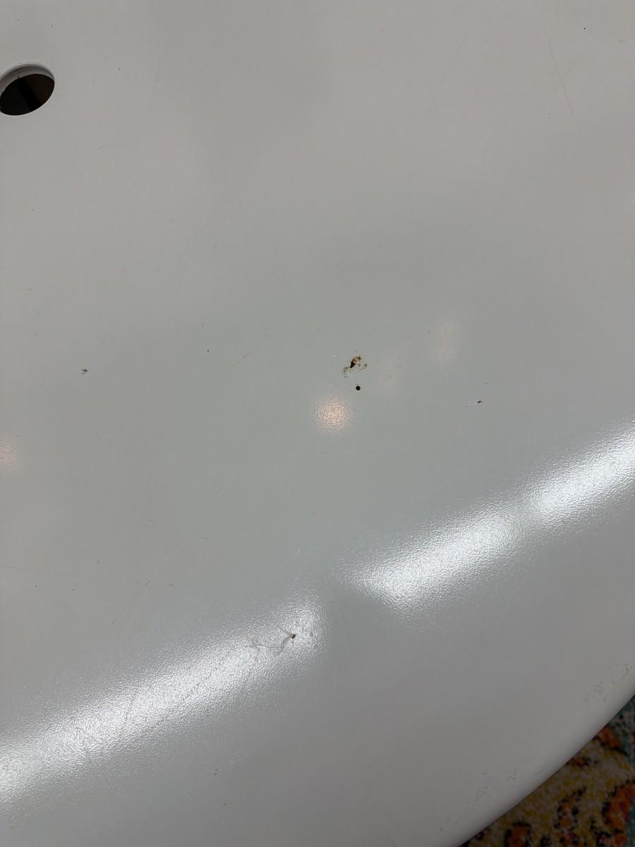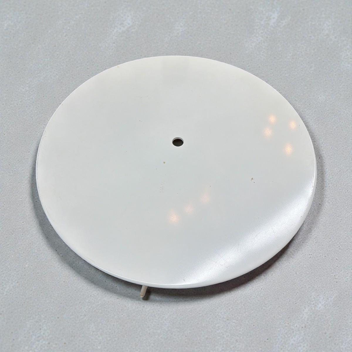 "White Round Metal Patio or Cafe Dining Table with a Center Hole for an Umbrella. Small spot in top see photo