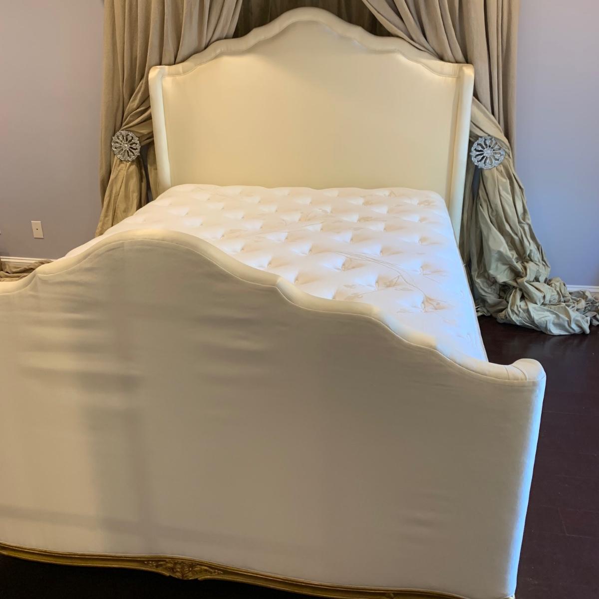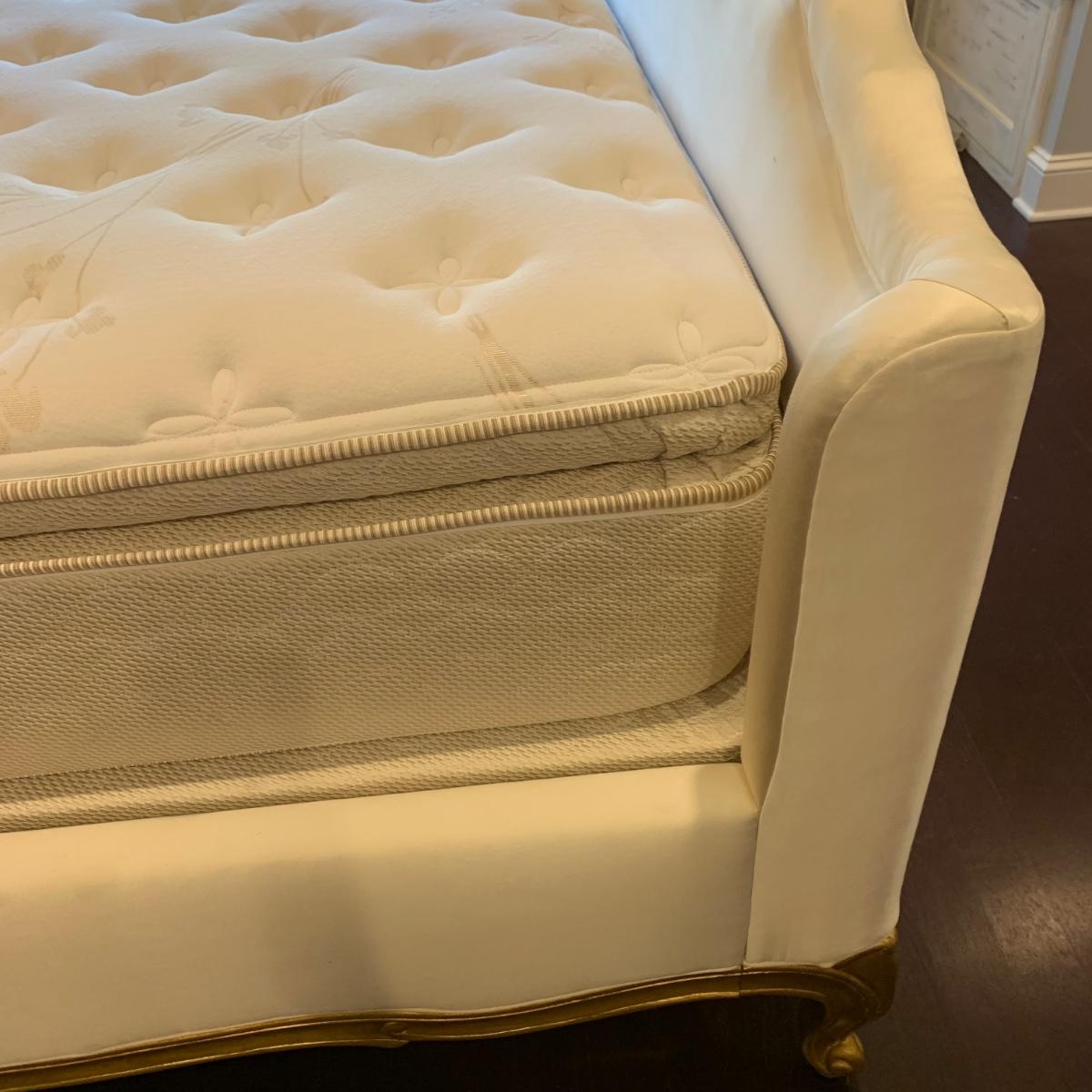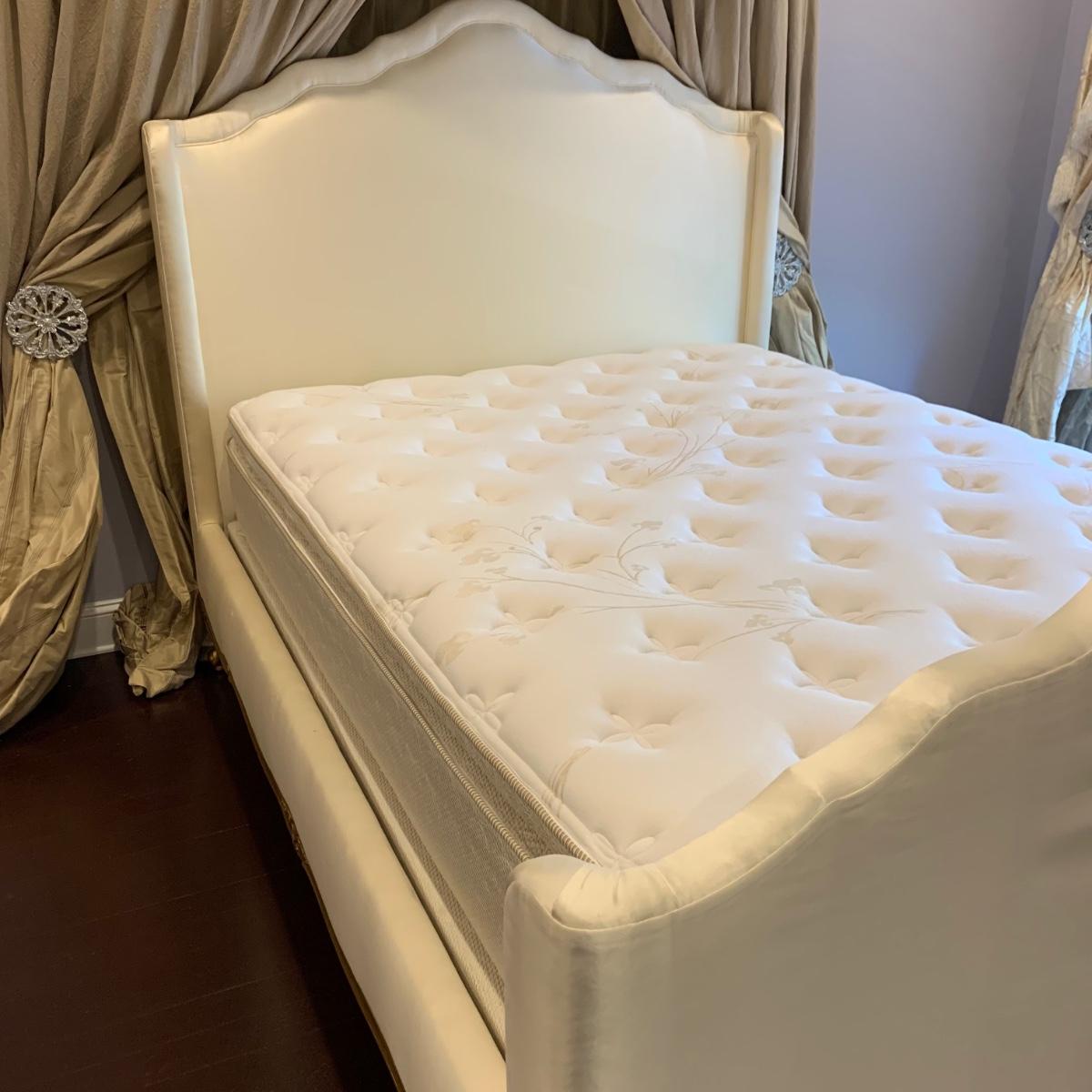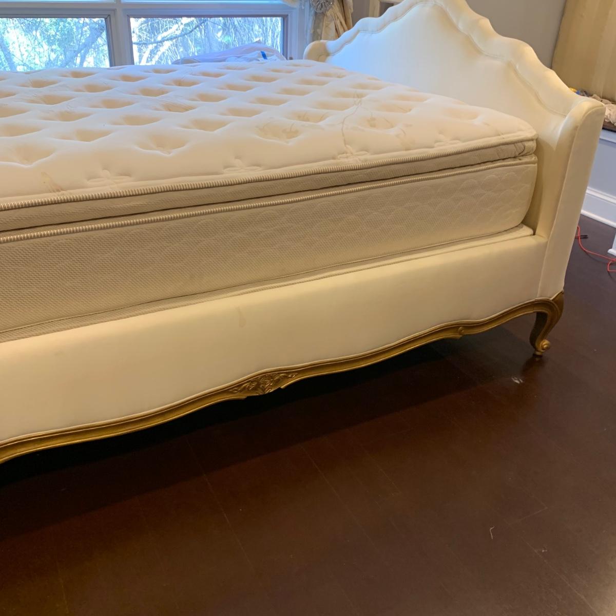 A very regal looking white satin bed frame with a carved wooden base painted gold. Frame measures 66” x 87”. The top of the headboard is 65”H. One stain was noted on the side of the bed; see photos. A Symbol Mattress Symbol-Pedic mattress and box spring are available to the winning bidder if desired, but the winning bidder is not required to take them. The mattress appears to be queen size as it measures approximately 59” x 78”.