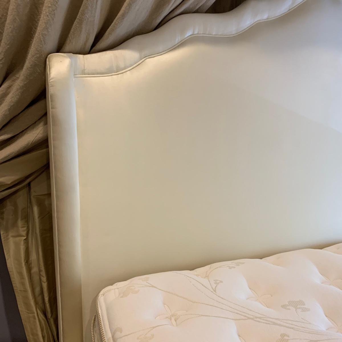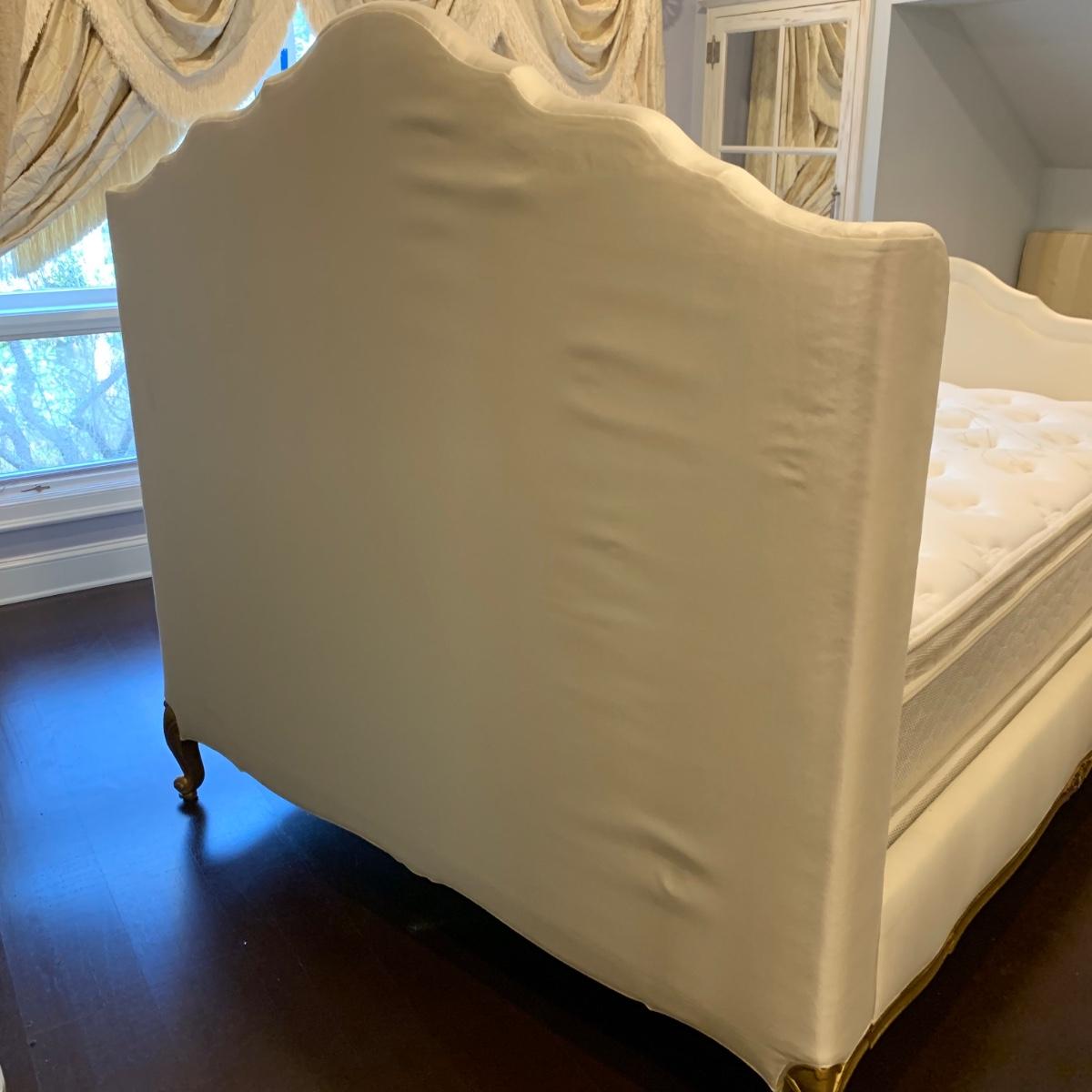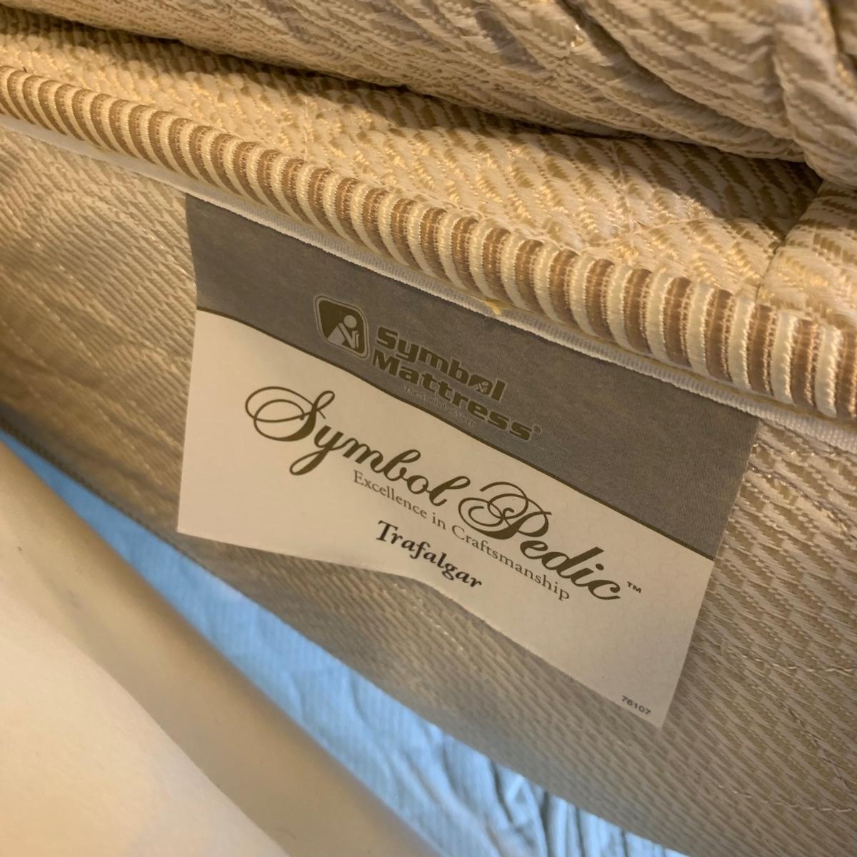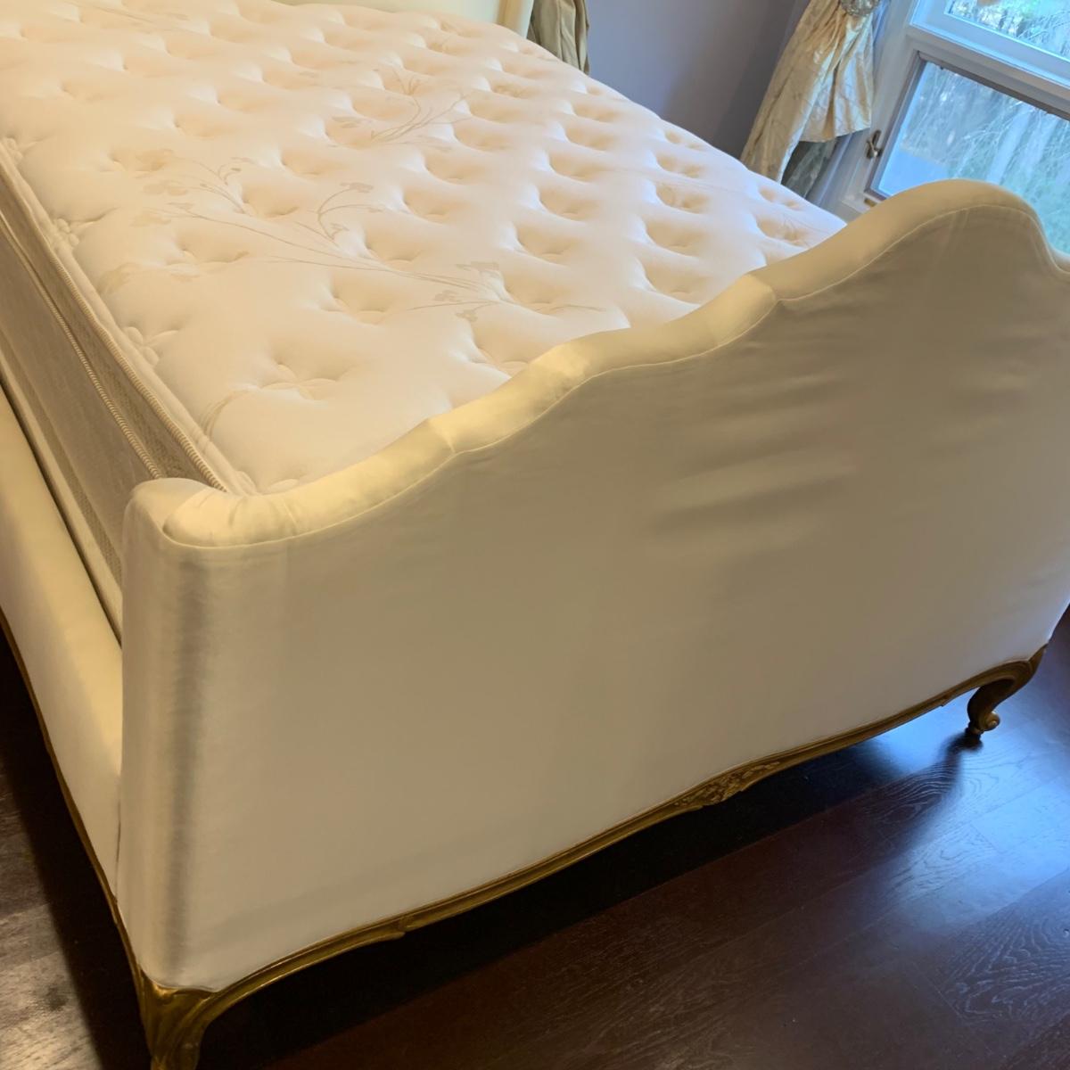 A very regal looking white satin bed frame with a carved wooden base painted gold. Frame measures 66” x 87”. The top of the headboard is 65”H. One stain was noted on the side of the bed; see photos. A Symbol Mattress Symbol-Pedic mattress and box spring are available to the winning bidder if desired, but the winning bidder is not required to take them. The mattress appears to be queen size as it measures approximately 59” x 78”.