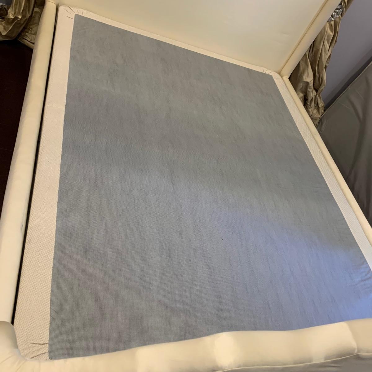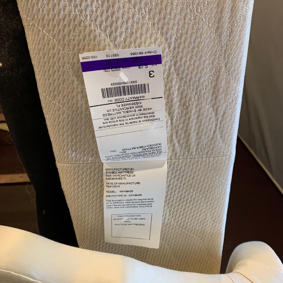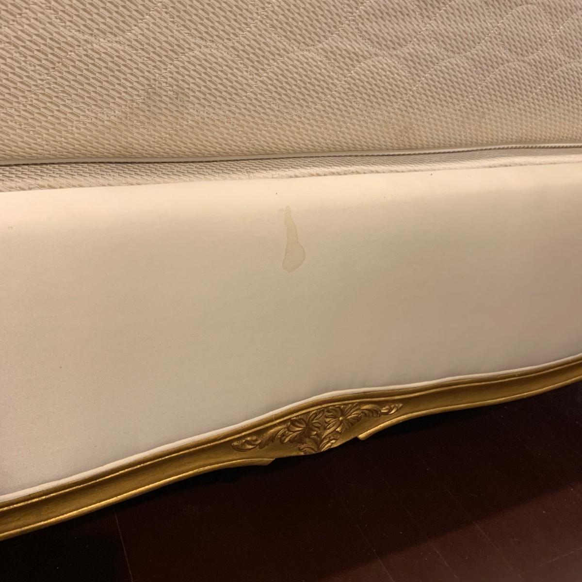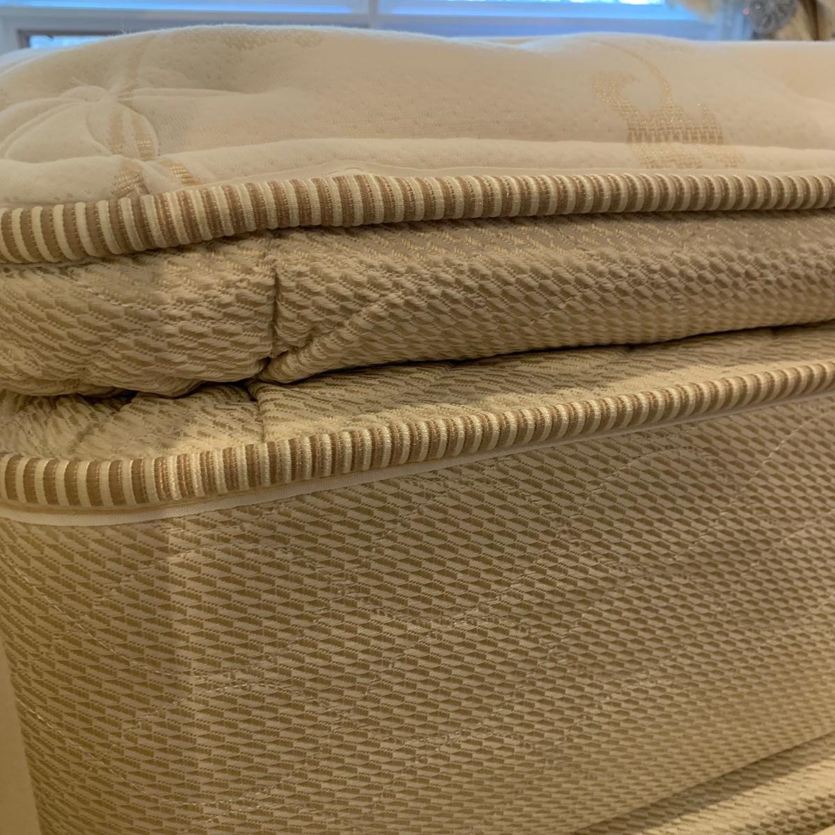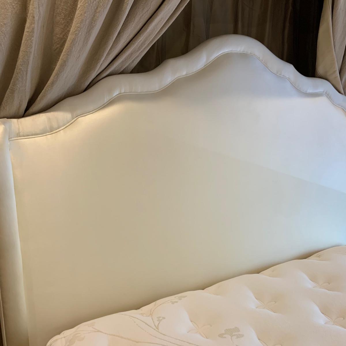 A very regal looking white satin bed frame with a carved wooden base painted gold. Frame measures 66” x 87”. The top of the headboard is 65”H. One stain was noted on the side of the bed; see photos. A Symbol Mattress Symbol-Pedic mattress and box spring are available to the winning bidder if desired, but the winning bidder is not required to take them. The mattress appears to be queen size as it measures approximately 59” x 78”.