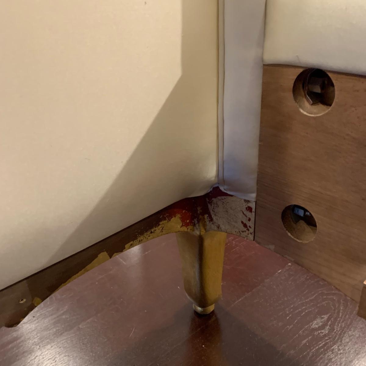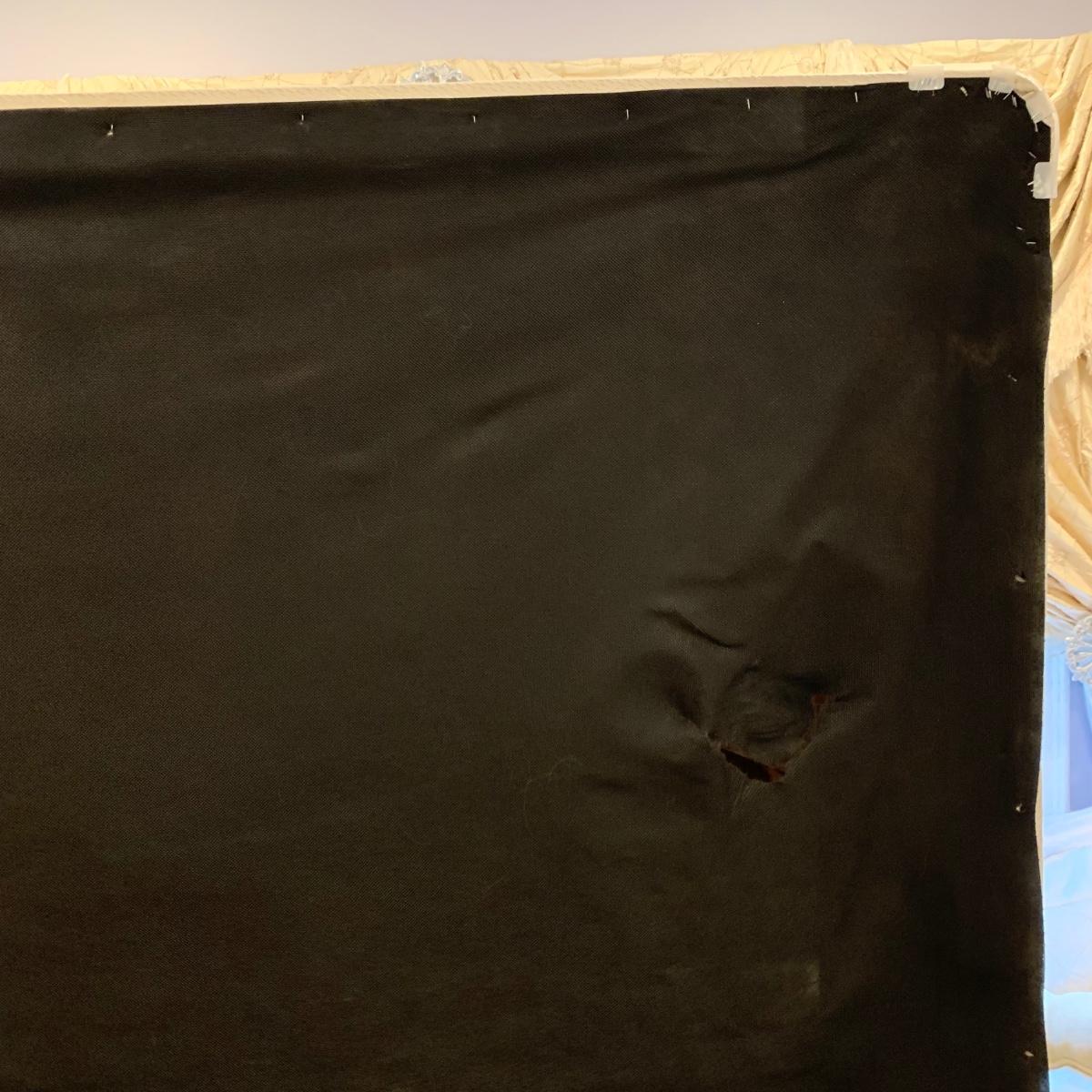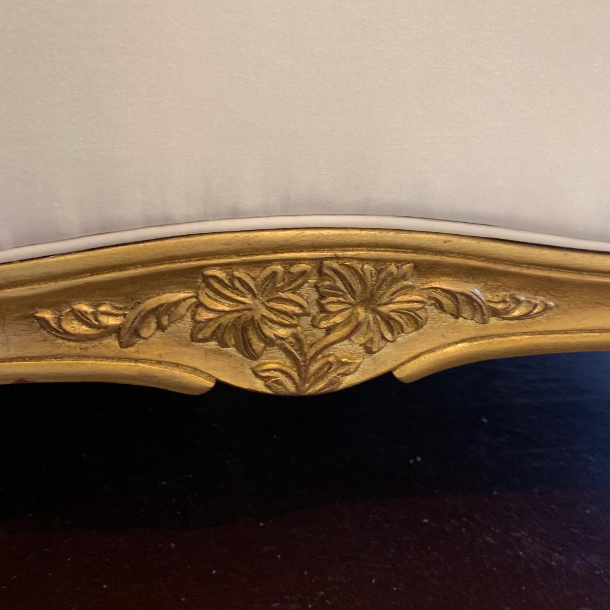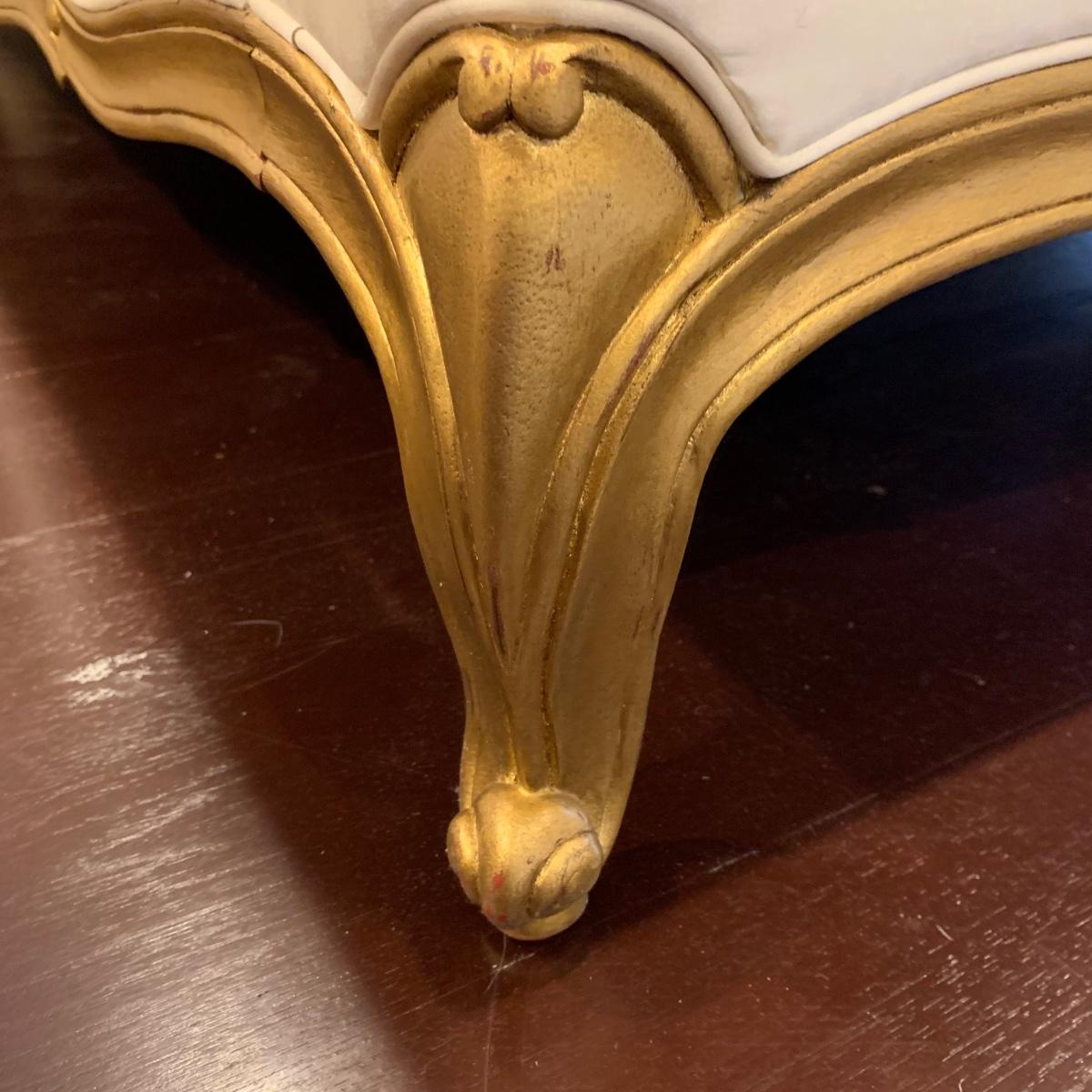 A very regal looking white satin bed frame with a carved wooden base painted gold. Frame measures 66” x 87”. The top of the headboard is 65”H. One stain was noted on the side of the bed; see photos. A Symbol Mattress Symbol-Pedic mattress and box spring are available to the winning bidder if desired, but the winning bidder is not required to take them. The mattress appears to be queen size as it measures approximately 59” x 78”.