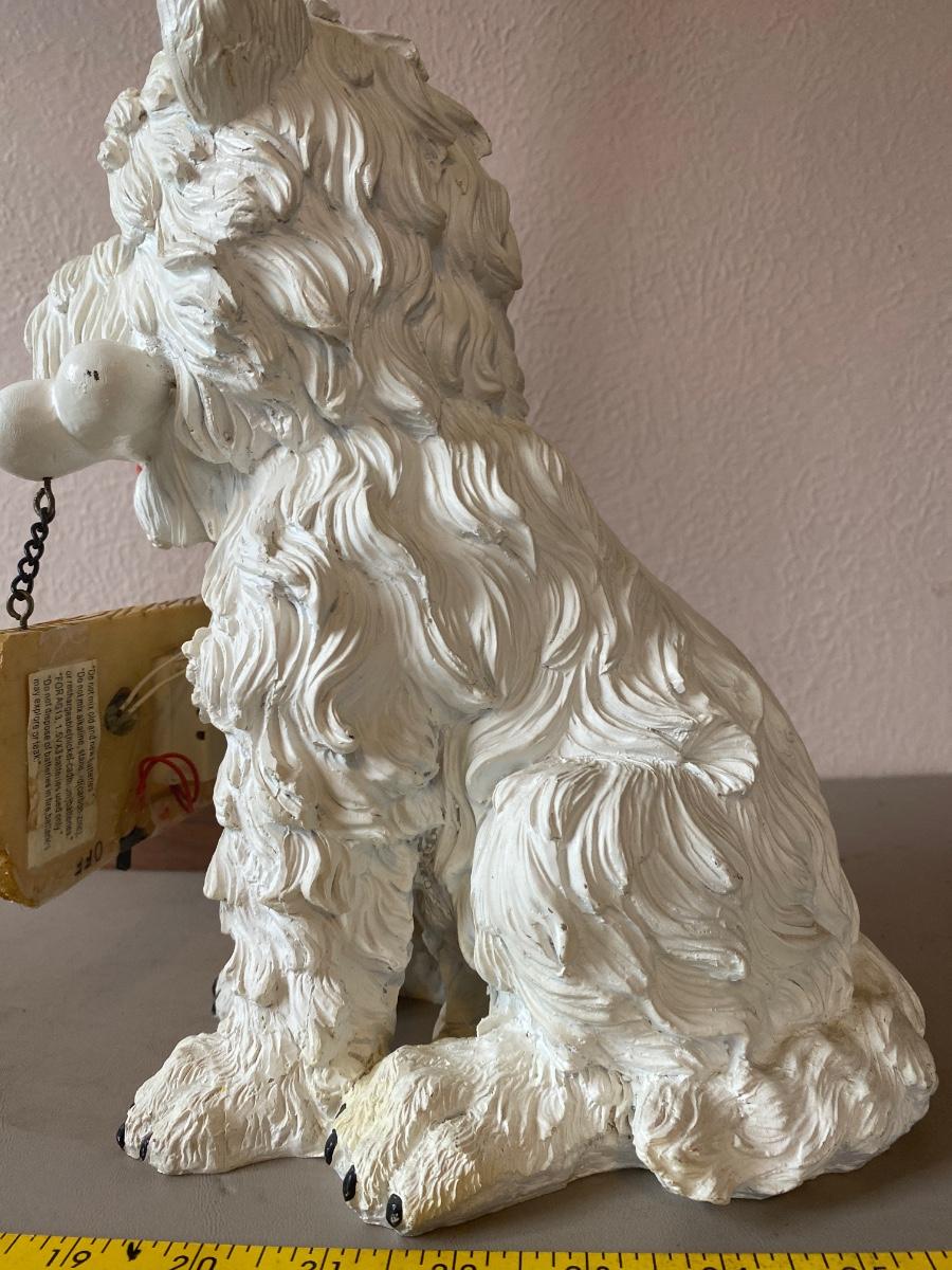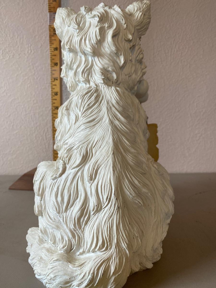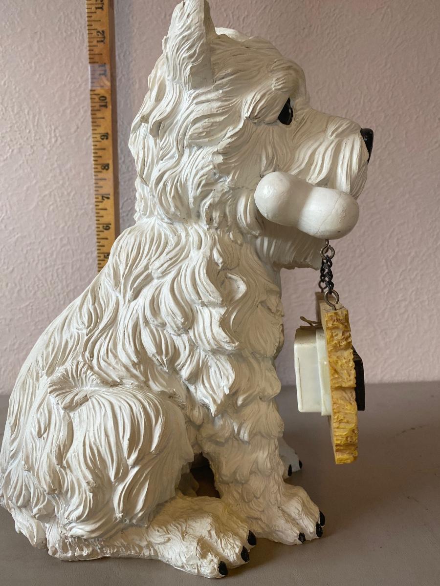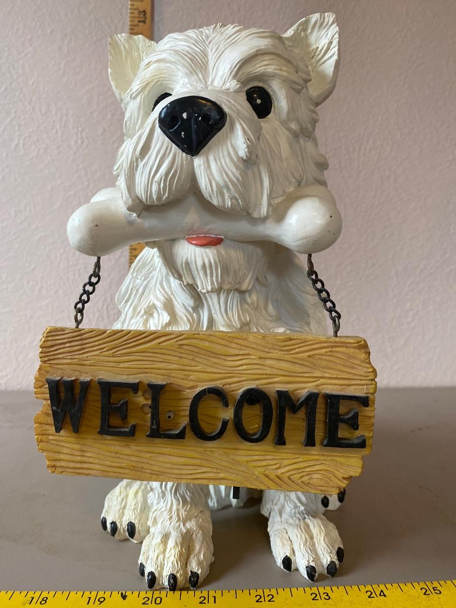 Adorable, white Scottie dog with welcome sign measures about 11 inches tall and about 8 inches wide