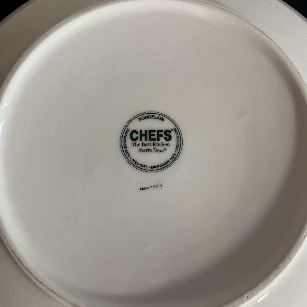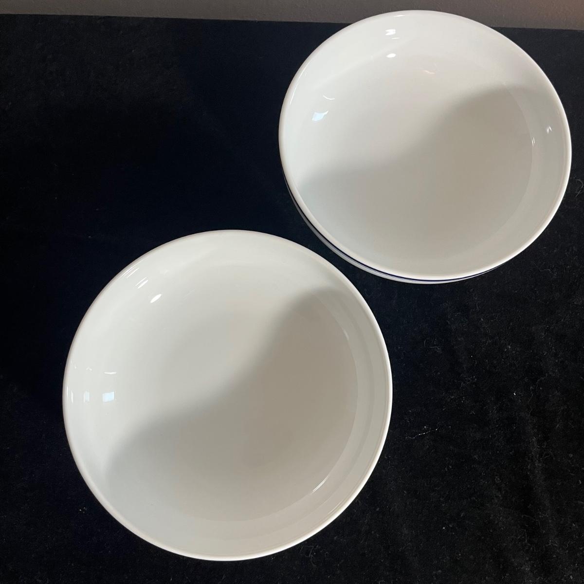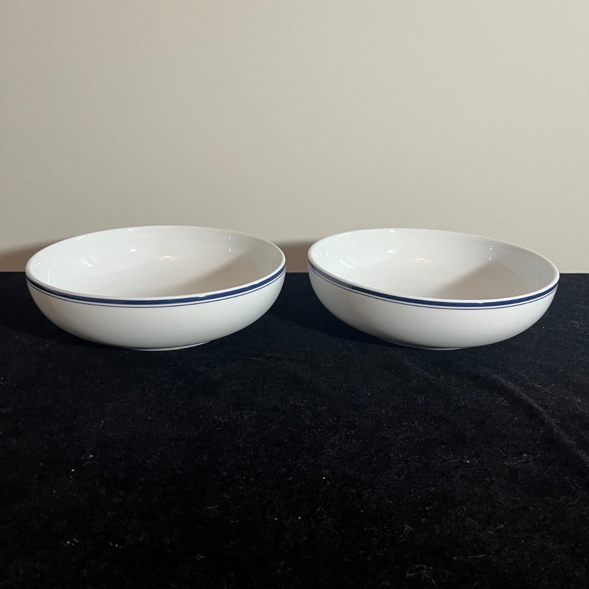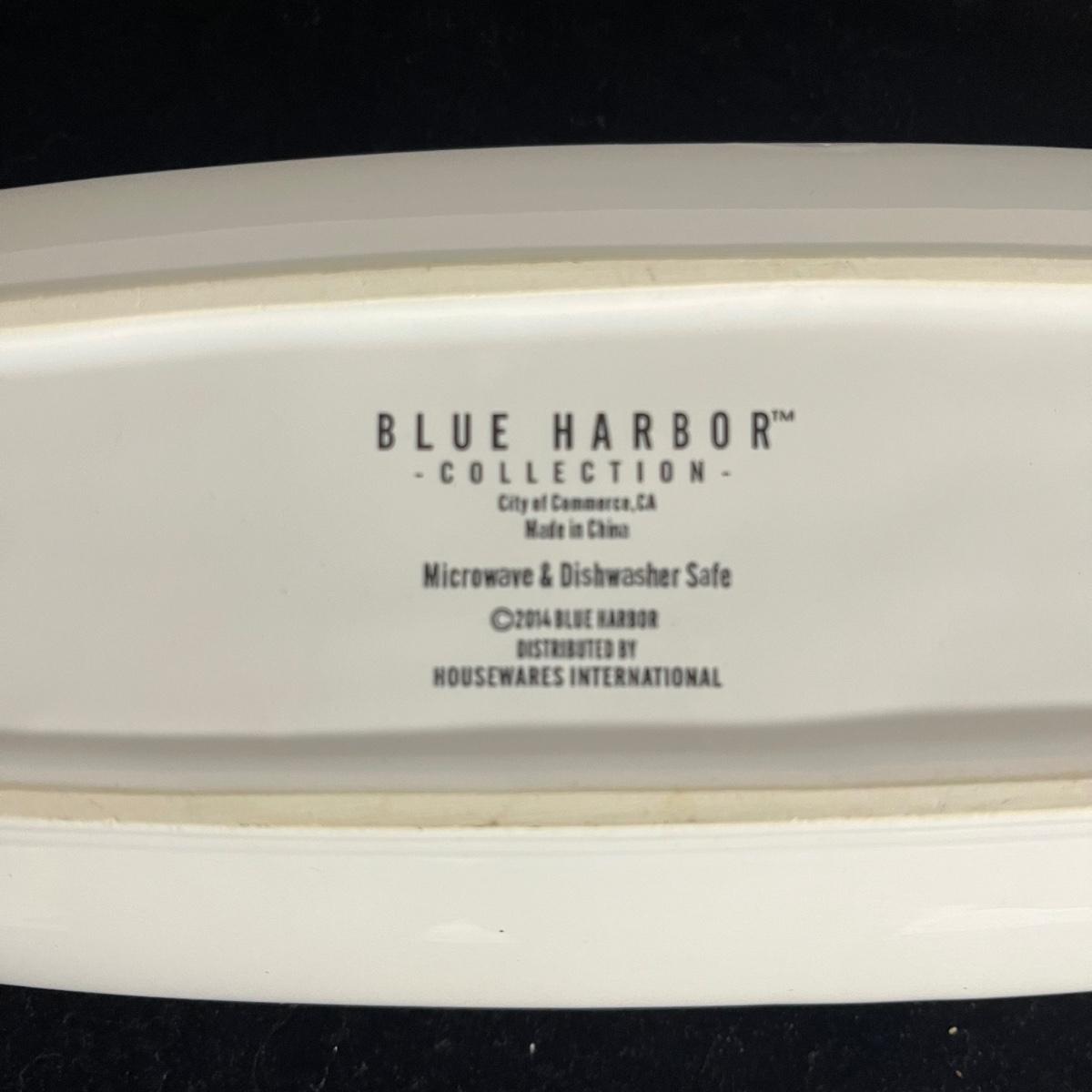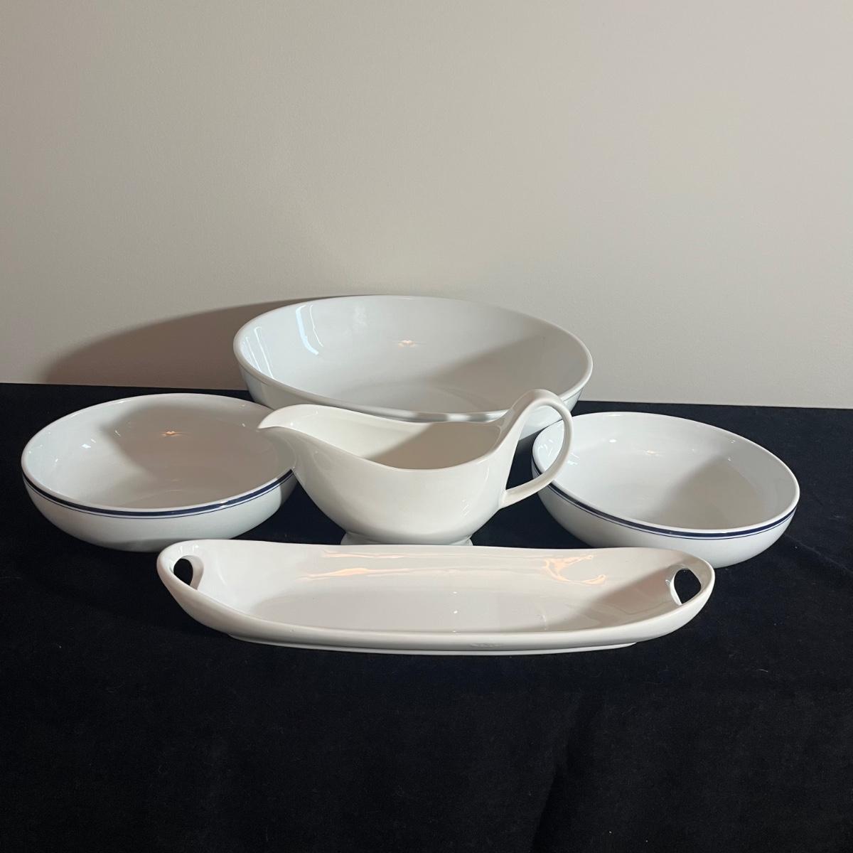 Lot includes Chefs serving bowl, two Dansk bowls with blue rims, Blue Harbor long serving tray and a Una gravy boat. Chef serving bowl measures 13”D x 3.5” tall.