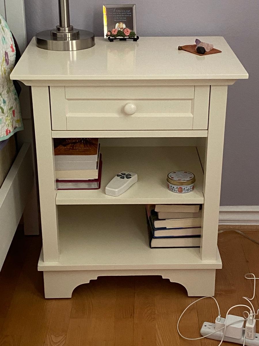 White single drawer nightstand side table. Adjustable lower shelf. In good condition. Measures about 28.5" tall by 18" deep and 24" wide. Contents not included with the table.