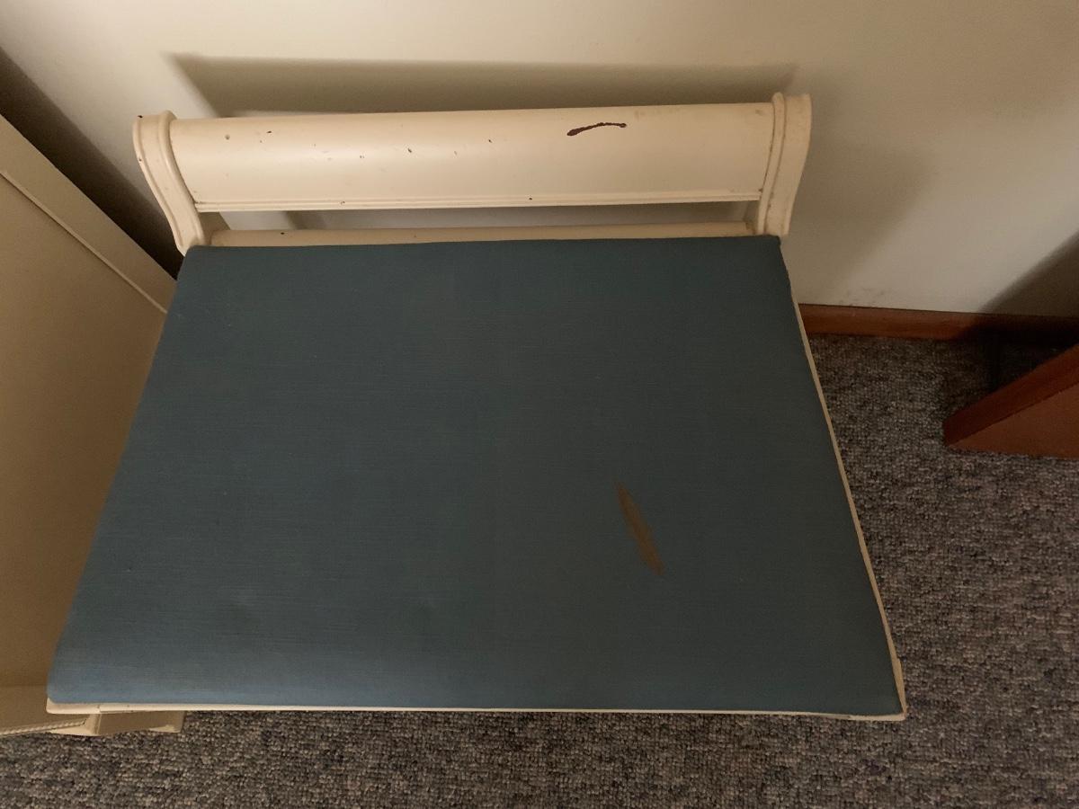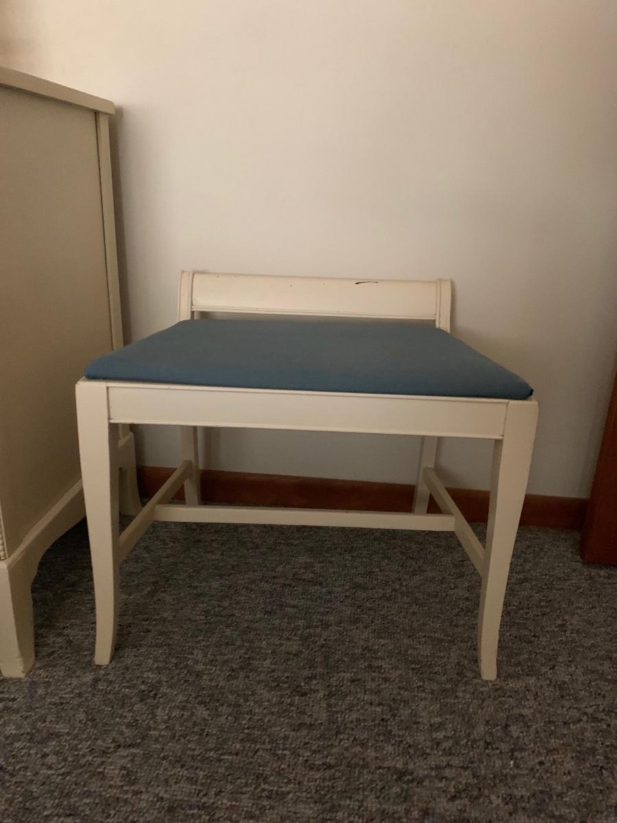White Slipper Bench. Matches White 5 Drawer Chest, White Vanity with mirror and chair, white bedside chest.